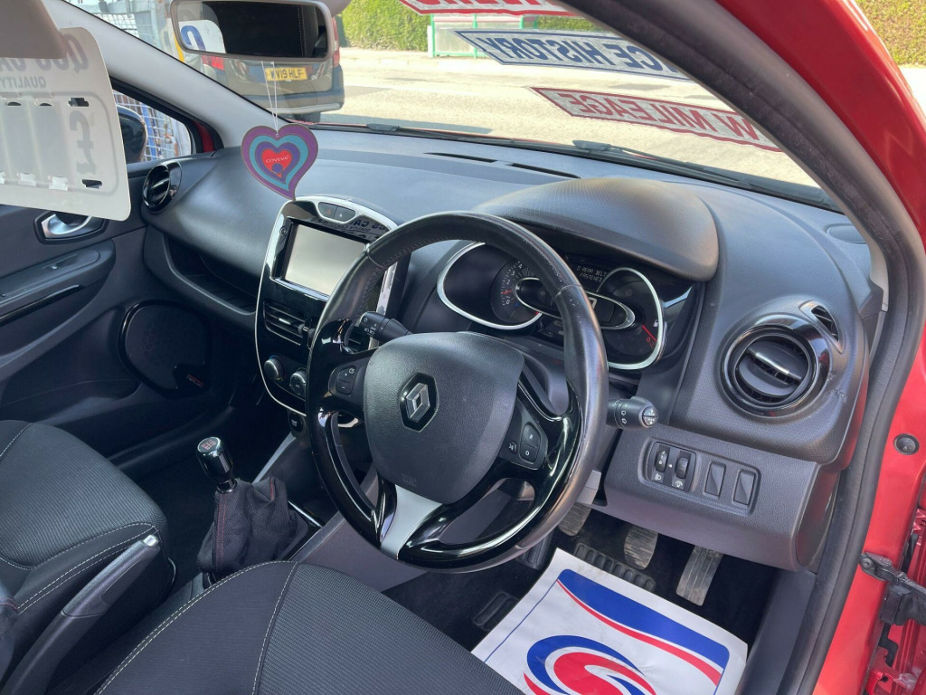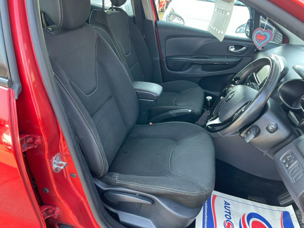 12 MONTH MOTFINANCE AVAILABLE. 1.2L Storage Shelf Above Glovebox, 12V Power Socket, 16in Alloy Wheels - Passion Chrome, 2x Storage Spaces for 2 Cups and Miscellaneous Items near Handbrake, 4L Front Glovebox, ABS - Anti Lock Brakes, Air Conditioning - Manual, Airbags - Deactivation - Front and Side - Driver and Passenger, Anti Drill Door Locks, Anti-Pinch Function on Electric Windows, Automatic Headlights and Wipers, B-Pillar - Matt Black, Bumpers - Body Coloured, Centre Console - Gloss Black - Dashboard Inserts - Gloss Black - Air Vent Surrounds with Matt Chrome Adjusters, Clio Inscribed Under Renault Diamond Badge, Cruise Control with Speed Limiter, Dashboard - Soft Touch Dark Carbon, Daytime Running Lights - LED, Deadlocking, Door Handles - Body Coloured - Front, Door Handles - Interior Matt Chrome, Door Mirrors - Black Gloss - Electrically Adjustable and Heated, Driver Seat Belt Height Adjustable, Driver and Passenger Front - Side - Head and Thorax Airbags, EBA - Emergency Brake Assist, EBD - Electronic Brake Distribution, ESC - Electronic Stability Control, ETC - Electronic Traction Control, Electric Child Safety Locks on Rear Doors Activated via a Switch on the Drivers Door Panel, Electric Windows - Front, Exterior Chrome Touches - Side Door- Boot Lid Strip and Front Grille Strips, Front Dash Warning Indicator in Case of Heavy Braking, Front Fog Lights, Front Speaker Surrounds - Gloss Black with Red Bass Reflex Logo, Gear Change Indicator, Gear Knob Insert - Matt Chrome, HSA - Hill Start Assist, Handbrake Button - Matt Chrome, Handsfree Keycard with Push Button Start-Stop Function, Headlights - Halogen Double Optic with Black Surround, Headrests - Front Height Adjustable - SRP - System for Restraint and Protection, Headrests - Rear x3, Heating System with Pollen Filter, ISOFIX - Child Seat Fixing Points - Outer Rear Seats, Instrument Dial Surrounds - Matt Chrome, Lightly Tinted Windows, Lower Door Protector - Black Gloss with Chrome Insert, Power Assisted Steering - Electric Variable, RAID - Renault Anti Intruder Device, Rear Engine Badge, Rear Spoiler - Body Coloured, Rear Wiper, Remote Central Locking with Thatcham Approved Immobiliser - Thatcham Cat 2, Renault MediaNav, Seatbelt Warning Sound, Seats - 60-40 Split Folding Rear, Seats - Drivers Height Adjustment, Small Storage Area by Gear Stick for Phone-Keys, Steering Wheel - Height and Reach Adjustable, Steering Wheel - Leather with Gloss Black Insert, Steering Wheel Base - Gloss Black, Storage Space 1.2L - 1x Front Door, Strip Base of Bootlid - Chrome, Trip Computer, Tyre Inflation Kit, Tyre Pressure Warning Light, USB Connection, Windscreen Wipers - Variable Speed.