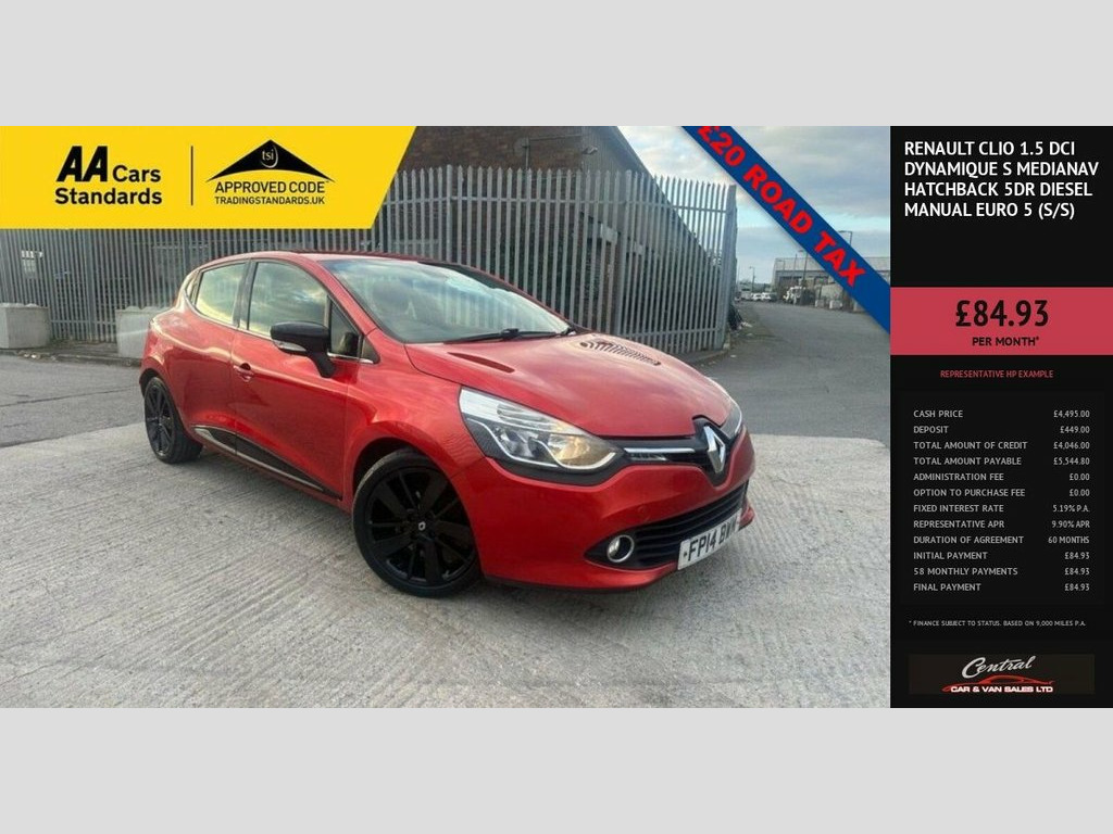 May 2014 Renault Clio 1.5 DCI Dynamique S MediaNav 90PS 5 door Sport Hatch. The car has covered 109k miles with 4 services carried out and recorded. Road tax is just £20 for 12 months Insurance group 13E and the car returns 71mpg urban, 88mpg extra-urban, 83mpg combined. The car is finished in gleaming metallic flame red with dark cloth trim. The car has had 2 owners from new and the car has had 5 services in total with the last being for the sale. The clio combines style, economy and reliability and is amazing value for money. This example is the Dynamique model so the car has a high specification that includes power steering, multi function steering wheel, ISOFIX car seat anchorage points front & rear, 5 seats, rear wiper, 17" alloy gloss black wheels, climate control, air conditioning, parking sensors, HDD Satellite Navigation, electric windows x4, electric mirrors with power fold, remote central locking, parcel shelf, auxiliary heating, Fog Lights, Keyless Entry & Start, Bass Reflex Hi-Fi Upgrade, On Board Computer, Rear Wiper, Gloss Black Rear Diffuser, Side Trims & mirrors, Cruise Control, Steering Colum Audio Controls, Start/Stop, Piano Black Dashboard Trims, 5 Speed Manual Transmission, ECO Mode, USB/AUX Inputs, Cupholders, Multiple Airbags R-Link Multimedia System, Carminat TomTom Live (3 Years Subscripti, Gloss Exterior Touch Pack - Black, 17in Alloy Wheels - Desire with Grey Ins, Gloss Exterior Touch Pack - Grey, 1.2L Storage Shelf Above Glovebox, 12V Power Socket, 17in Alloy Wheels - Desire with Black In, 2x Storage Spaces for 2 Cups and Miscell, 4L Front Glovebox, 7in Touch Screen, ABS - Anti Lock Brakes, Airbags - Driver, Airbags - Front Lateral, Airbags - Front Passenger, Airbags - Front Passenger Deactivation, Airbags - Thorax, Anti Drill Door Locks, Arkamys 4x20W Radio and Handsfree Techno, Armrest - Front Centre with Storage Comp, Automatic Windscreen Wipers with Rain Se, Bluetooth Connectivity, Bumpers - Body Coloure
