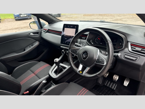 Renault Clio 1.0 TCe 100 RS Line 5dr Cruise control + speed limiter, E-call, Easy link 9.3" screen with nav, 4x20W amp, DAB double tuner, 2xUSB, 1xJack/Bluetooth, and smartphone integration plus - Apple CarPlay/Android Auto, Eco mode, Gear change indicator, Lane departure warning system, Lane keep assist, Over speed prevention, Rear parking sensors, Traffic sign recognition, Trip computer, Variable assistance electric PAS, Sound auditorium, Automatic headlights + automatic windscreen wipers, Black headlamp surrounds, Body colour door handles, Body colour door mirrors, Body coloured bumpers, Body coloured rear spoiler, Chrome window surround, Drivers one touch window with anti-pinch feature, Electric adjustable/heated/folding door mirrors, Electric front windows, Electric rear windows, Exterior rear hidden door handles, Extra tinted glass on rear windows + tailgate, Full C-shape LED front and rear signature lighting, Full LED front and rear headlamps integrating daytime running lights at the front and rear, Gun Metal insert on lower side doors with Clio embossing, LED front fog lights, Rear fog lights, Rear wiper, RS Line badging, RS Line exterior styling, RS Line side marker chrome, RS Line sports front bumper, RS Line sports lower grill, RS Line sports rear bumper sport with chrome oval exhaust pipe, Variable speed on front windscreen wipers, 12V Accessory socket, 3 rear height adjustable headrests, 6.2L front glovebox, 60/40 split rear seats, Air recirculation control, Auto climate control, Dark roof lining and aluminimum pedal set, Driver's seat height adjustment, Front cupholders, Front decor strip in red, Front door storage bin, Height adjustable front headrests, Height/reach adjust steering wheel, Isofix system on outer rear seats, Multi function steering wheel, Pollen filter, RS branded top grain leather steering wheel, RS Line Interior trim including airvent stripe and gearshifter in red, System for Restraint and Protection SRP-front seats, Exterior chrome pack - Clio, Luxury pack - Clio, 3 point seatbelts on all rear seats, ABS+EBD+Brake assist, Automatic emergency braking system, Curtain airbags, Distance warning alert, Driver and passenger front and side airbag deactivation, Driver/Front Passenger airbags, ESC - Electronic Stability Control + traction control, Front side airbags(head+thorax), Height adjustable driver's seatbelt, Hill start assist, Seatbelt warning, Tyre pressure warning, Automatic door locking, Central door locking, Child lock control of rear doors and windows, Deadlocking system, Hands free key card with push button, start and stop function, Locking fuel filler cap, RAID (Renault Anti-Intruder Device) with automatic door locking, Remote central locking, Thatcham Cat 2 engine immobiliser, 17" RS diamond cut alloy wheels