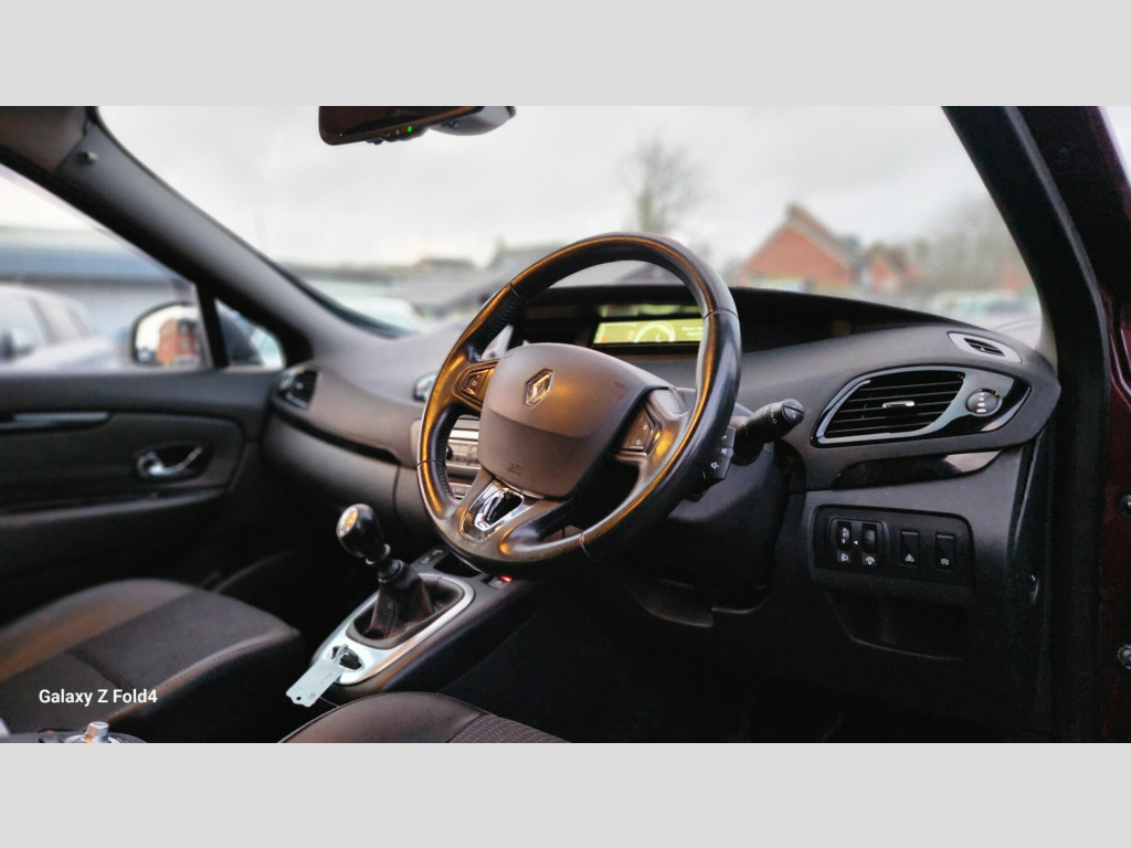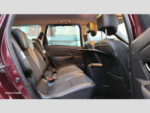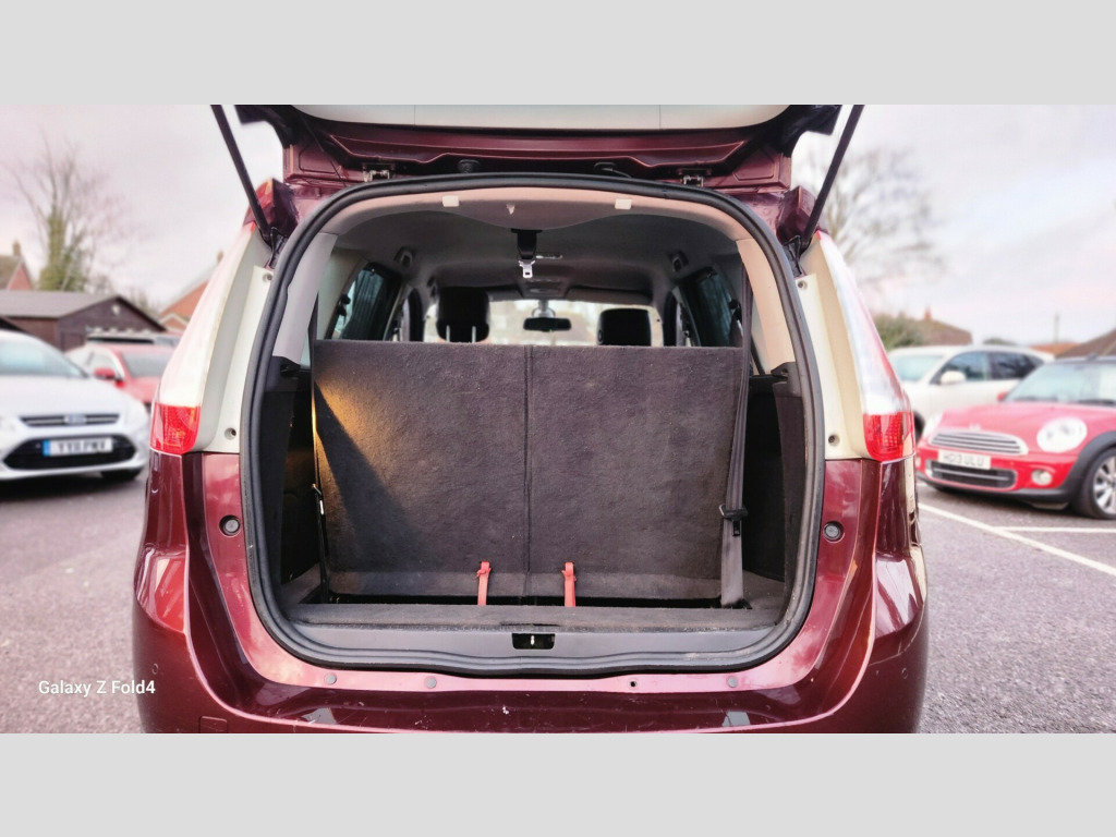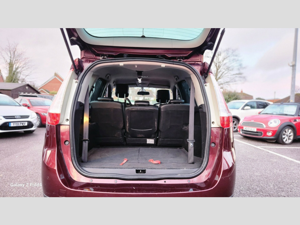 v power socket - luggage compartment, 12v power socket - row 2, 4x20w rds radio cd-mp3, aux input, bluetooth connectivity, carminat tomtom live satellite navigation, tft display screen, usb connection, 16in alloy wheels - kaleido, bumpers - body coloured, door handles - body coloured - front, door mirrors - body coloured, door mirrors - electrically adjustable - manual folding and heated, electric windows - front and rear, extra tinted windows - rear and tailgate, headlights - double optic, roof bars - black, side protection mouldings - body coloured, tyre inflation kit, abs - anti lock brakes, asr - traction control, airbags - driver, airbags - front lateral, airbags - front passenger, airbags - front passenger deactivation, airbags - front and rear curtain, alarm - thatcham category 1, brake assist, csv - understeer control, deadlocking, ebd - electronic brake distribution, esc - electronic stability control, electric child safety locks on rear doors activated via a switch on the drivers door panel, hsa - hill start assist, isofix - child seat fixing points - 2nd row x3, parking brake - automatic, raid - renault anti intruder device, remote central locking, renault keyless entry, seatbelt audible alert, automatic windscreen wipers with rain sensors, aviation tables on rear of front seats, child minder mirror, climate control - automatic dual zone, electrochromatic rear view mirror, fingertip controls, front and rear underfloor storage, gear knob - leather, headrests - front and rear height adjustment, illuminating sunblind, pollen filter, seats - 2nd row of 3 individual adjusting and folding, seats - 3rd row - x2 - fold flat into the floor, seats - drivers height adjustment, seats - drivers lumbar adjustment, seats - folding passengers, steering column - reach and rake adjustable, steering wheel - leather, storage - front seat back pockets, storage - glovebox with lighting, storage - sliding centre console, storage - tray between front seats, storage - trays under front seats, sun visor - drivers with vanity mirror, sun visor - passengers with vanity mirror, sunblinds - rear window, sunblinds - rear windows and tailgate, sunblinds - second row rear windows, upholstery with teflon protection, cruise control with speed limiter, exterior temperature sensor, fuel computer, fuel computer - multifunctional, lane change function, power assisted steering, tyre pressure monitoring system, daytime running lights - led, front fog lights, headlights - automatic height adjustment, headlights - automatic on, headlights - see me home