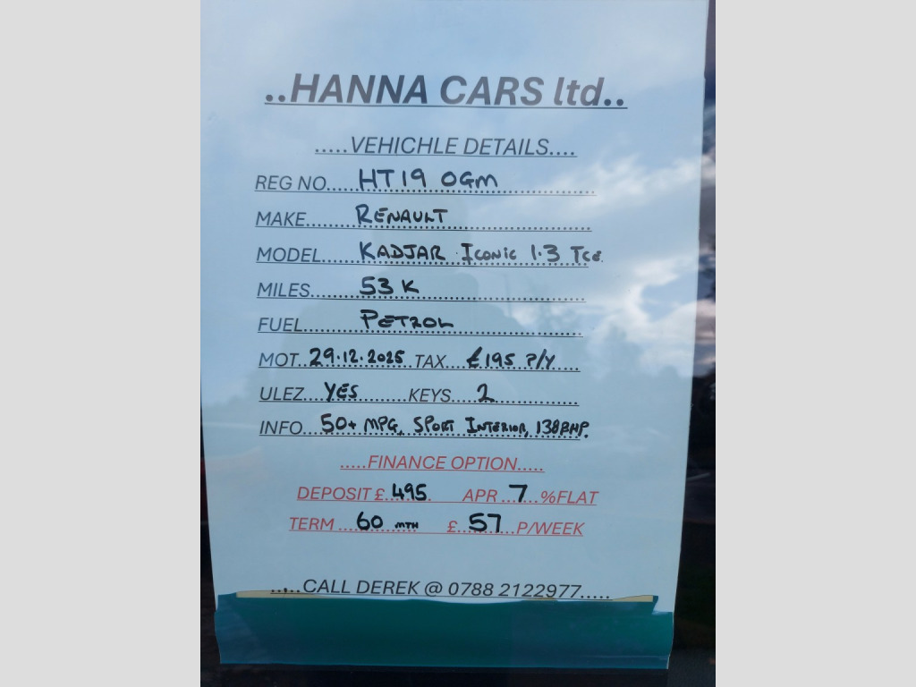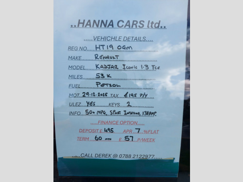 RENAULT KADJAR ICONIC 1.3 TCe, , 2019 REG,PIANO BLACK PAINTWORK,ALLOY WHEELS,1.3 TURBO PETROL MODEL,1/2 LEATHER SPORTS INTERIOR,2 KEYS SUPPLIED,138 BHP MODEL,ULEZ COMPLIANT,IDEAL FAMILY VEHICLE,LARGE BOOT SPACE,FACTORY SAT-NAV,6sp MANUAL GEARBOX, , FINANCE AVAILABLE , WARRANTY AVAILABLE, TRADE-IN WELCOME