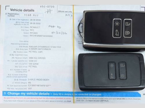 This 2018 Renault Kadjar TCe Dynamique S Nav offers a sophisticated driving experience with its Euro 6 compliant 1.3 litre petrol engine. This model benefits from a Keycard with hands free operation, including walk away lock and keyless entry, ensuring effortless access and security. Inside, you'll find the convenience of automatic dual zone climate control and the integrated Arkamys 3D Sound system, complete with DAB radio, Bluetooth, and USB connectivity. For seamless smartphone integration, it features both Apple CarPlay and Android Auto, keeping you connected on the go.The Kadjar Dynamique S Nav is designed to impress, achieving 0-62mph in just 9.4 seconds, demonstrating its responsive performance. Its fuel economy is a notable highlight, returning up to 47 miles per gallon, which indicates it is more economical than many similar vehicles. Furthermore, its low CO2 emissions also suggest it is a more environmentally conscious choice compared to other cars in its class. Parking is made simpler with front and rear parking sensors, including a parking assistance system, making manoeuvring in tight spaces less of a challenge.VIEW ALL OUR STOCK AT WWW.EUROCARSCASTLEFORD.COM DELIVERY IS AVAILABLE WITH A 14 DAY COOLING OFF PERIOD, EMAIL YOUR POST CODE FOR A PERSONALISED QUOTATION AND TERMS. LOW RATE FINANCE IS AVAILABLE ON THIS CAR, PLEASE ASK. ALL FIGURES QUOTED ARE MANUFACTURERS FIGURES. ERRORS AND OMISSIONS EXPECTED, THIS ADVERT & TEXT IS GENERATED BY AI AND MAY BE WRONG. CUSTOMERS SHOULD ENSURE THE ACTUAL CAR MEETS THEIR REQUIRMENTS BEFORE BUYING AS MISTAKES CANNOT BE RECTIFIED AFTER PURCHASE.. 12v Socket - Front, 19in Alloy Wheels - Diamond Cut - Apollo, 3 Height Adjustable Rear Head Restraints, 3 Point Inertia Reel Seatbelts, 60-40 Split Folding Seats, ABS with EBD - Electronic Brake Distribution and Emergency Brake Assist, Accessory Power Point, Adjustable Dashboard Illumination, Air Recirculation, Airbags - Curtain Front and Rear, Airbags - Deactivation of Front Passenger - For Use with Child Seats, Airbags - Drivers Two Stage Auto Adaptive, Airbags - Front Lateral, Airbags - Front Passengers Two Stage Adaptive, Anti-Drill Door Locks and Ignition Barrel, Apple CarPlay and Android Auto, Arkamys 3D Sound 4x35W DAB Radio with Bluetooth and USB Connection, Armrest - Front Centre, Assisted Parking Brake, Automatic Dual Zone Climate Control, Automatic Headlights and Windscreen Wipers, Body Sided Moulding with Chrome Insert, Chrome Detailing, Chrome Window Surrounds, Courtesy Lights - Rear, Cruise Control with Speed Limiter, Daylight-Nightlight Rearview Mirror, Daytime Running Lights - LED, Deadlocking and Immobiliser, Display - Digital Speedometer - 7in TFT Screen, Door Handles - Body Coloured - Front, Door Mirrors - Body Coloured Shell, Door Mirrors - Electrically Operated - Heated - Folding, Door-Boot Open Warning Light, Driver and Passenger Seat Belt Undone Warning Audible Alert, Dust Protection Kit, ESP - Electronic Stability Programme with ASR - Anti-Skid Regulation and UCL - Understeer Logic Control, Eco Mode, Electric Front Windows, Electric Rear Windows, Electronic Parking Brake, Exterior Temperature Indicator, Extra Tinted Windows - Rear and Tailgate, Fingertip Audio System Remote Control, Fleet Telematics, Fog Lights with Cornering Function, Front and Rear Towing Rings, Full Flat Floor, Glovebox Light, Gravel Protection Kit, HSA - Hill Start Assist, Halogen Headlights, Headrests - Front Fully Adjustable, Heated Rear Windscreen, Heating Ducts to Feet of Rear Passengers, ISOFIX Child Seat Anchorage on Rear Outer Seats, Illuminated Luggage Compartment on Opening of Boot, Indicators with Side Repetitions, Insurance Approved - Category 1 Alarm System and Immobiliser, Integrated Fuel Filler Cap, Interior Courtesy Light Controlled By All 4 Doors, Keycard - Hands Free with Walk Away Lock Function, Leather Steering Wheel, Load Limiters, Low Fuel Level Warning Light, Multi Position Trunk Floor, Oil Level Gauge, Parking Sensors - Front and Rear, Pollen Filter, Power Assisted Steering, Protective Rear Brake Disc, R-Link v2 Live Satellite Navigation System with Western European Mapping, RAID - Renault Anti Intruder Device - Auto Closure - 6mph, Rain Protection Kit, Reading Lights - Driver and Front Passenger, Rear Seatbelt Unfastened Audible Alert, Rev-Counter, Roof Rails, Seats - 3-Seat Rear Bench, Seats - Drivers Height and Lumbar Adjustment, Seats - Height Adjustable Front Seatbelts with Double Pretensioners, Side Impact Protection Bars, Steering Wheel - Rake and Reach Adjustable, Sun Visor - Mirror Without Light, Trip Computer - Multifunctional, Tyre Inflation Kit, Tyre Pressure Monitoring System, Visio System, Synthetic Leather-Cloth - Dark Carbon, Emergency Spare Wheel. Full service history