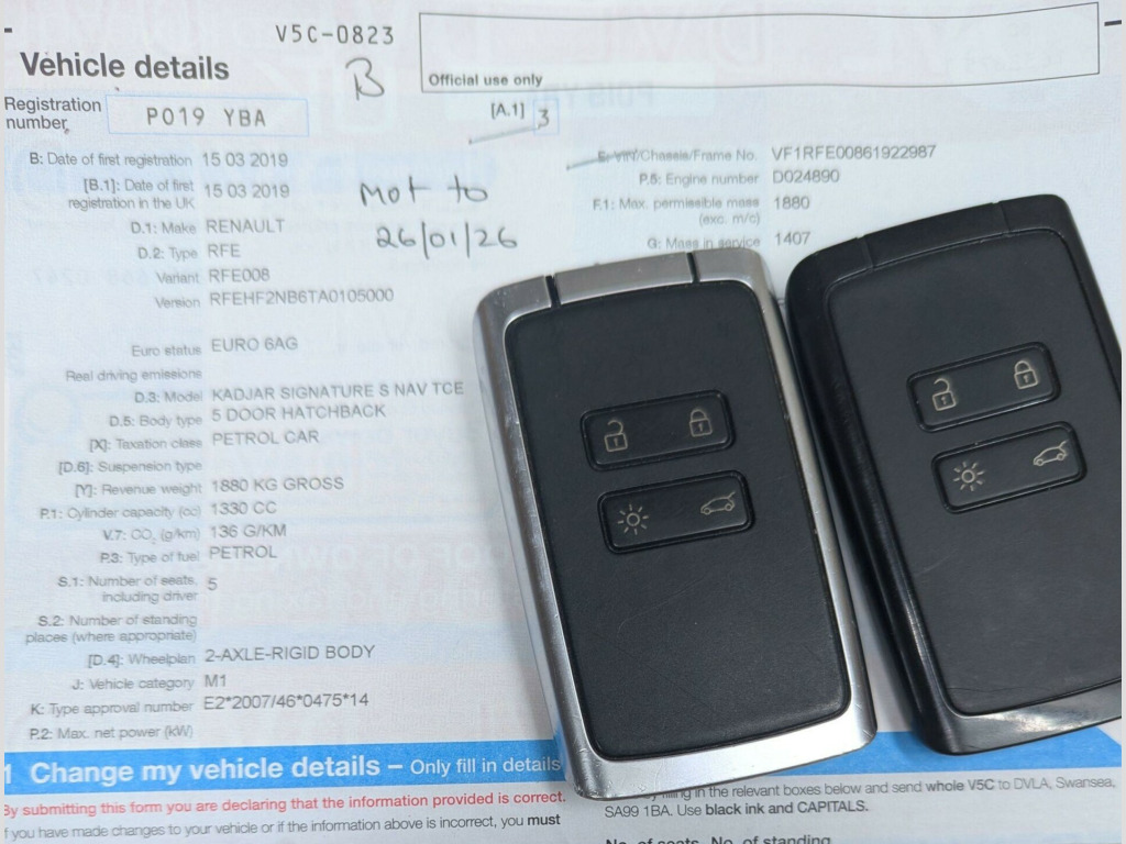 This 2019 Renault Kadjar TCe Signature S Nav offers a refined driving experience with its Euro 6 compliant 1.3L petrol engine. This model, presented in the Signature S Nav trim, comes equipped with a suite of advanced parking aids, including a rear parking camera and front and rear parking sensors, all designed to make manoeuvring effortless. Inside, you'll appreciate the comfort provided by the automatic dual zone climate control and the immersive sound quality of the BOSE Energy Efficient Sound System. For added safety and peace of mind, this Kadjar also features a Blind Spot Warning system.The performance of this Kadjar is noteworthy, achieving 0-62mph in just 9.4 seconds, demonstrating its responsive acceleration. Furthermore, its fuel economy is a significant advantage, achieving up to 47 miles per gallon, which indicates its efficiency compared to other vehicles in its class. The low CO2 emissions also highlight its environmentally conscious design, making it a sensible choice for modern driving needs.This above average car is in wonderful condition, having obviously been cherished by the last owner. It has the benefit of a full service history to give the maximum reliability. View All Our Stock At; www.eurocarscastleford.com DELIVERY IS AVAILABLE WITH A 14 DAY COOLING OFF PERIOD, EMAIL YOUR POST CODE FOR A PERSONALISED QUOTATION AND TERMS. LOW RATE FINANCE IS AVAILABLE ON THIS CAR, PLEASE ASK. All figures quoted are the manufacturers figures. Errors and omissions are expected, this description and specification are AI generated and may be wrong, customers should ensure the actual car specification meets their requirements before purchase as mistakes cannot be rectified after purchase.. 12v Socket - Front, 19in Alloy Wheels - Diamond Cut - Zeus, 3 Height Adjustable Rear Head Restraints, 3 Point Inertia Reel Seatbelts, 60-40 Split Folding Seats, ABS with EBD - Electronic Brake Distribution and Emergency Brake Assist, Accessory Power Point, Adjustable Dashboard Illumination, Air Recirculation, Airbags - Curtain Front and Rear, Airbags - Deactivation of Front Passenger - For Use with Child Seats, Airbags - Drivers Two Stage Auto Adaptive, Airbags - Front Lateral, Airbags - Front Passengers Two Stage Adaptive, Anti-Drill Door Locks and Ignition Barrel, Apple CarPlay and Android Auto, Armrest - Front Centre, Assisted Parking Brake, Auto Dimming Rear View Mirror, Automatic Dual Zone Climate Control, Automatic Headlights and Windscreen Wipers, BOSE Energy Efficient Sound System, Blind Spot Warning, Body Sided Moulding with Chrome Insert, Central Rear Armrest with Cup Holders, Chrome Detailing, Chrome Window Surrounds, Courtesy Lights - Rear, Cruise Control with Speed Limiter, Daytime Running Lights - LED, Deadlocking and Immobiliser, Display - Digital Speedometer - 7in TFT Screen, Door Handles - Body Coloured - Front, Door Mirrors - Body Coloured Shell, Door Mirrors - Electrically Operated - Heated - Folding, Door-Boot Open Warning Light, Driver and Passenger Seat Belt Undone Warning Audible Alert, Dust Protection Kit, ESP - Electronic Stability Programme with ASR - Anti-Skid Regulation and UCL - Understeer Logic Control, Eco Mode, Electric Front Windows, Electric Rear Windows, Electronic Parking Brake, Exterior Temperature Indicator, Extra Tinted Windows - Rear and Tailgate, Fingertip Audio System Remote Control, Fleet Telematics, Fog Lights with Cornering Function, Front and Rear Skids, Front and Rear Towing Rings, Full Flat Floor, Glovebox Light, Gravel Protection Kit, HSA - Hill Start Assist, Hands Free Parking, Headlights - Full LED, Headrests - Front Fully Adjustable, Heated Rear Windscreen, Heating Ducts to Feet of Rear Passengers, ISOFIX Child Seat Anchorage on Rear Outer Seats, Illuminated Luggage Compartment on Opening of Boot, Indicators with Side Repetitions, Insurance Approved - Category 1 Alarm System and Immobiliser, Integrated Fuel Filler Cap, Interior Courtesy Light Controlled By All 4 Doors, Keycard - Hands Free with Walk Away Lock Function, Leather Pack, Load Limiters, Low Fuel Level Warning Light, Multi Position Trunk Floor, Oil Level Gauge, Panoramic Sunroof, Parking Sensors - Front and Rear, Pollen Filter, Power Assisted Steering, Protective Rear Brake Disc, R-Link v2 Live Satellite Navigation System with Western European Mapping, RAID - Renault Anti Intruder Device - Auto Closure - 6mph, Rain Protection Kit, Reading Lights - Driver and Front Passenger, Rear Parking Camera with Front and Rear Parking Sensors, Rear Seatbelt Unfastened Audible Alert, Rev-Counter, Roof Rails, Seats - 3-Seat Rear Bench, Seats - Drivers Height and Lumbar Adjustment, Seats - Height Adjustable Front Seatbelts with Double Pretensioners, Seats - One Touch Easy Folding Rear Bench, Seats - Passenger Height Adjustment, Side Impact Protection Bars, Side and Boot Kick Plates, Signature Nappa Leather Steering Wheel, Steering Wheel - Rake and Reach Adjustable, Sun Visor - Mirror With Light, Trip Computer - Multifunctional, Tyre Inflation Kit, Tyre Pressure Monitoring System, Visio System, Leather - Carbon Black. Full service history