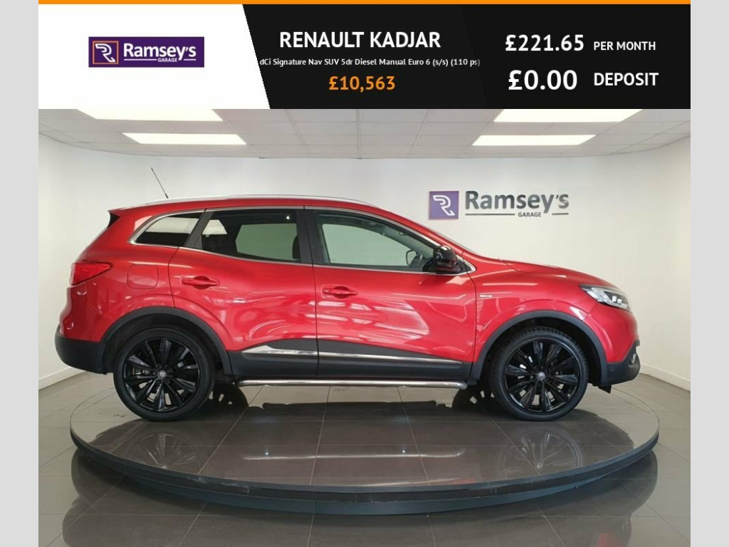 Renault Kadjar 1.5 dCi Signature Nav SUV 5dr | Manual | Diesel | 110 PS | Euro 6 (s/s) | ULEZ Compliant  Engine: 1.5L dCi Turbo Diesel Power: 110 PS Transmission: 6-Speed Manual Fuel Type: Diesel Doors: 5 Trim Level: Signature Nav Emissions Standard: Euro 6 (s/s) – ULEZ Compliant  The Renault Kadjar Signature Nav is a stylish and spacious SUV offering strong fuel economy, premium features, and a refined driving experience. With a well-appointed interior and advanced infotainment, it's a fantastic choice for families, commuters, or anyone wanting a capable and comfortable crossover.  Key Features:  R-Link2 infotainment system with 7" touchscreen and satellite navigation  Panoramic fixed glass sunroof  Front/rear parking sensors  BOSE premium audio system  Keyless entry and push-button start  Dual-zone climate control  Cruise control and speed limiter  LED headlights and daytime running lights  19-inch alloy wheels  Lane departure warning and traffic sign recognition  ISOFIX child seat mounts  Stop/Start system  Euro 6 – ULEZ compliant  Vehicle Details:  Registration: CK18CTE Year: 2018 Mileage: 38506 Colour: RED Location: CO. DURHAM. ONLY 5 MINS FROM THE A1  Contact our sales team on 01325300200 or DM us on 07955476475 now to arrange a viewing or test drive. 19in Alloy Wheels - Diamond Cut - Zeus, 3 Point Inertia Reel Seatbelts, ABS with EBD - Electronic Brake Distribu, Accessory Power Point, Adjustable Dashboard Illumination, Air Recirculation, Airbags - Drivers Two Stage Auto Adaptiv, Airbags - Front and Rear Curtain, Airbags - Front Lateral, Airbags - Front Passenger Deactivation, Airbags - Front Passengers Two Stage Ada, Android Auto, Anti-Drill Door Locks and Ignition Barre, Apple CarPlay, Armrest - Front Centre, Assisted Parking Brake, Automatic Headlights and Windscreen Wipe, Body Sided Moulding with Chrome Insert, BOSE Energy Efficient Sound System, Central Rear Armrest with Cup Holders, Chrome Detailing, Chrome Window Surrounds, Climate