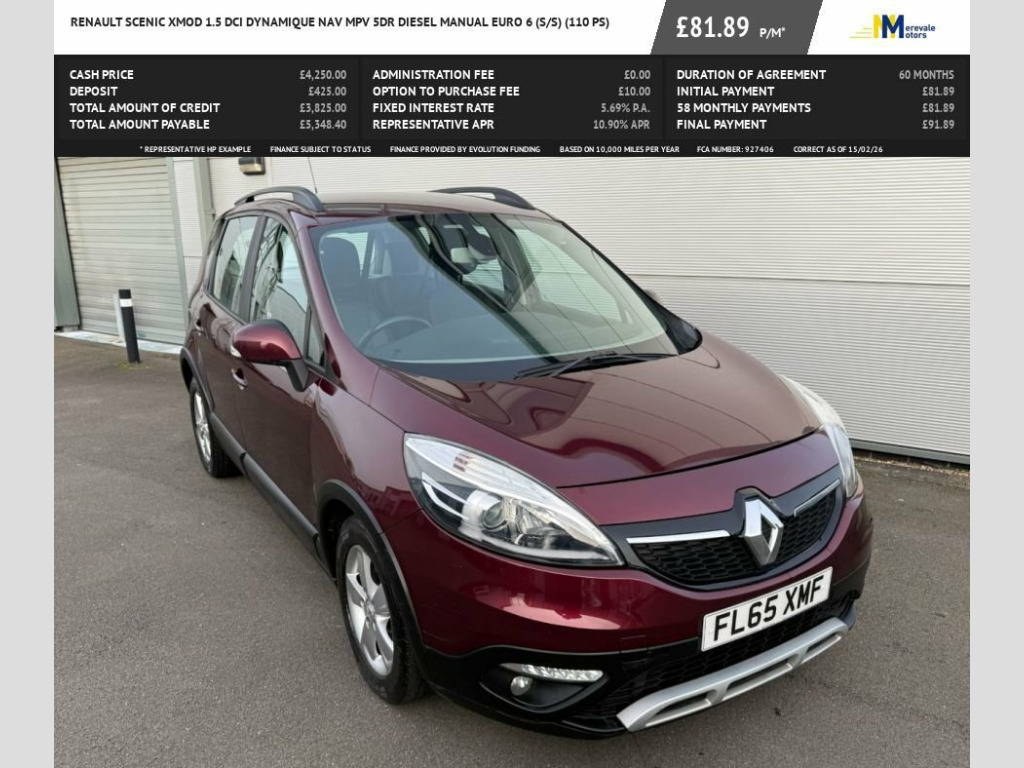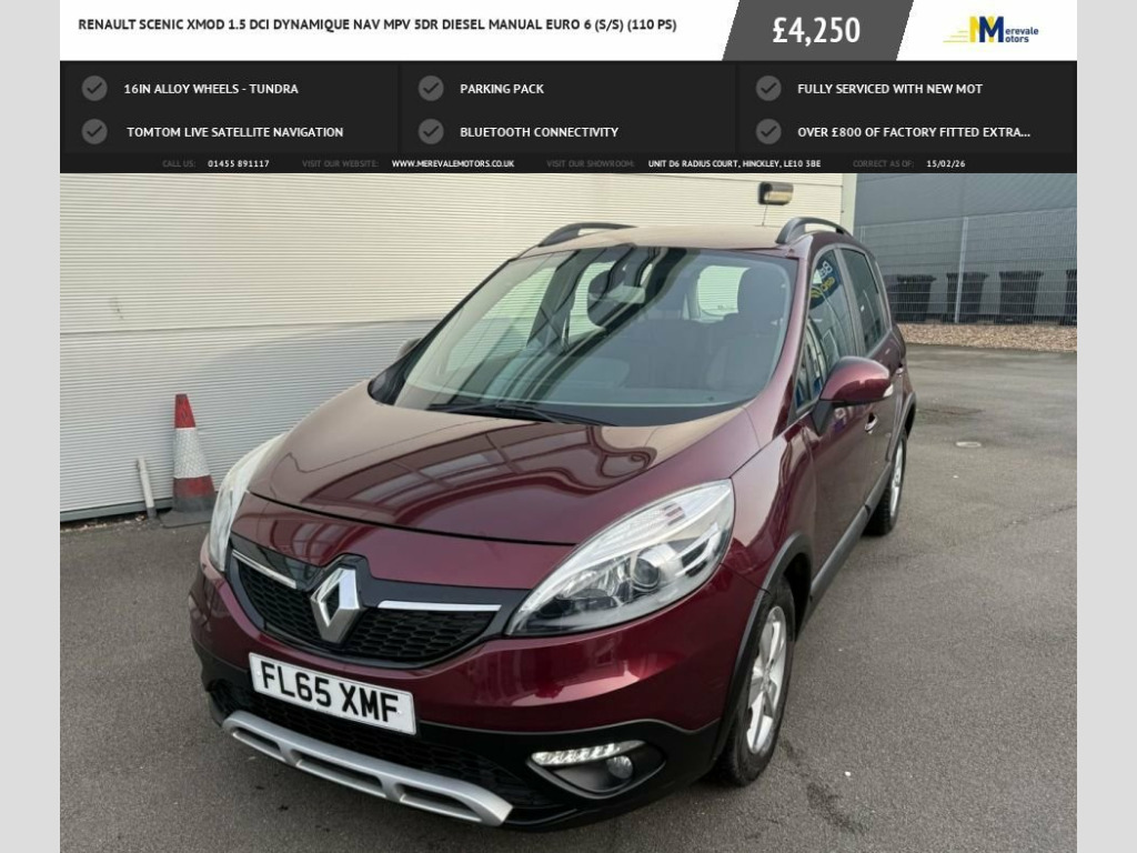 THIS 2015 RENAULT SCENIC XMOD DCI DYNAMIQUE NAV OFFERS EXCEPTIONAL VALUE WITH ITS FULL SERVICE HISTORY AND A REMARKABLY LOW MILEAGE OF JUST 72,777 MILES FOR ITS AGE. THIS EURO 6 COMPLIANT 1.5 LITRE DIESEL ENGINE AND WILL BE SUPPLIED WITH 12 MONTHS MOT FOR YOUR PEACE OF MIND. THE DYNAMIQUE NAV TRIM LEVEL INCLUDES CONVENIENT FEATURES SUCH AS AUTOMATIC HEADLIGHTS, DUAL ZONE CLIMATE CONTROL, AND BLUETOOTH CONNECTIVITY FOR SEAMLESS INTEGRATION OF YOUR DEVICES.THE PARKING PACK, COMPLETE WITH REAR PARKING SENSORS, MAKES MANOEUVRING IN TIGHT SPACES EFFORTLESS. THIS SCENIC XMOD STANDS OUT WITH ITS IMPRESSIVE FUEL ECONOMY, ACHIEVING AN OUTSTANDING 69 MILES PER GALLON, WHICH IS SIGNIFICANTLY BETTER THAN MANY OTHER VEHICLES IN ITS CLASS. FURTHERMORE, ITS LOW CO2 EMISSIONS CONTRIBUTE TO A MORE ENVIRONMENTALLY FRIENDLY DRIVE, MAKING IT A SENSIBLE CHOICE FOR BOTH YOUR WALLET AND THE PLANET. FINANCE IS AVAILABLE AND WE CAN BUILD A PACKAGE TO SUIT YOUR INDIVIDUAL NEEDS, JUST VISIT OUR WEBSITE AND CLICK ON APPLY FOR FINANCE TO USE THE FREE ELIGIBILITY CHECKER AND THEN SIMPLY HIT APPLY TO START YOUR PROCESS. INCLUDED IN THE SCREEN PRICE IS AN ULTIMATE WARRANTY WHICH INCLUDES BREAKDOWN COVER AND HOME START, WHICH YOU CAN EXTEND FOR JUST A SMALL COST... ALL OUR VEHICLES ARE MECHANICALLY INSPECTED BY INDEPENDENT CONTRACTORS IN ADDITION TO EXTENSIVE BACKGROUND AND MILEAGE CHECKS PRIOR TO SALE. HPI CLEAR AND SUPPLIED WITH ALL THE ORIGINAL HANDBOOKS AND ONE KEY. PLEASE CALL 01455891117 TO ARRANGE A 16in Alloy Wheels - Tundra, Carminat TomTom Live Satellite Navigatio, Parking Pack, Bluetooth Connectivity, Door Mirrors - Electrically Adjustable -, ISOFIX - Child Seat Fixing Points - 2nd , 4x20W RDS Radio CD-MP3, ABS - Anti Lock Brakes, AUX Input, Airbags - Driver, Airbags - Front Lateral, Airbags - Front Passenger, Airbags - Front Passenger Deactivation, Airbags - Front Side, Airbags - Front and Rear Curtain, Alarm - Thatcham Category 1, Automatic Windscreen Wipers with Rain Se, Boot Light, Brake Assist, CSV - Understeer Control, Climate Control - Automatic Dual Zone, Cruise Control with Speed Limiter, Daytime Running Lights - LED, Deadlocking, Digital Fuel Gauge with Low Fuel Level W, D
