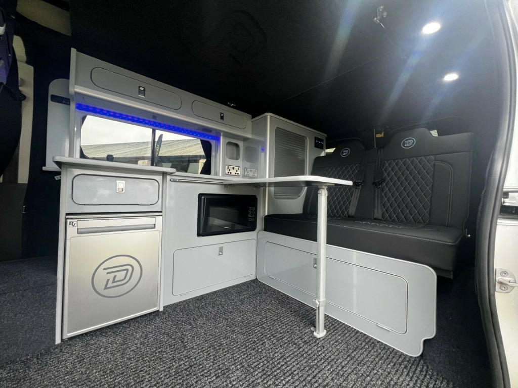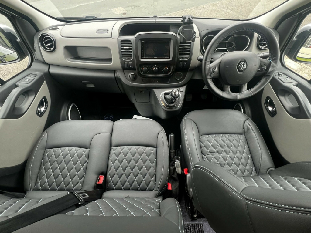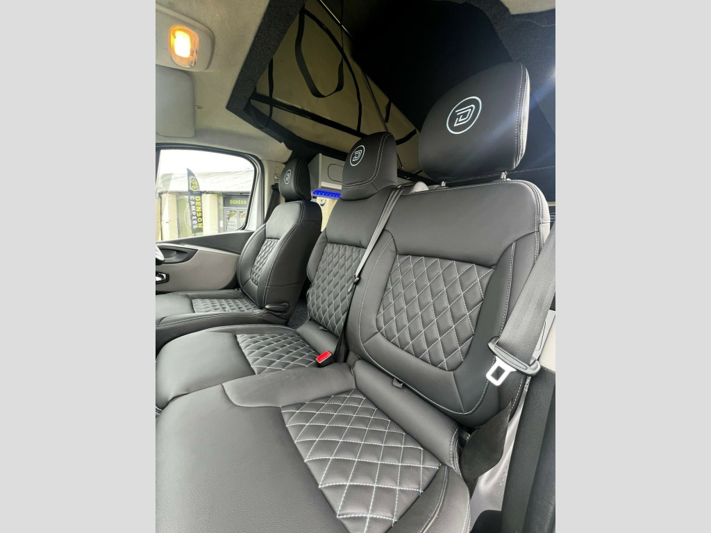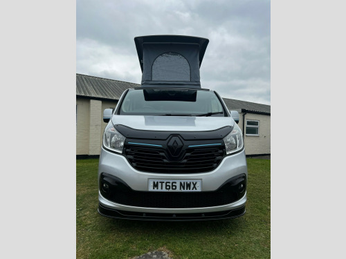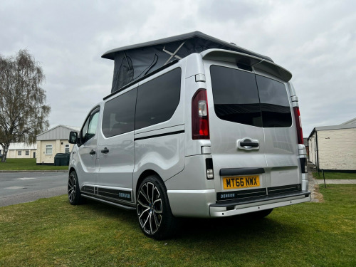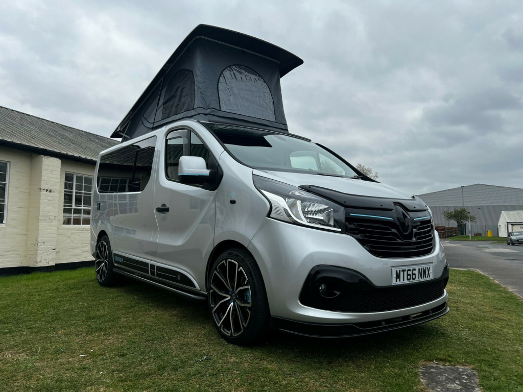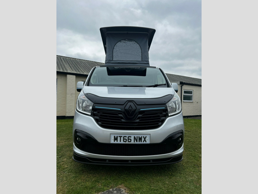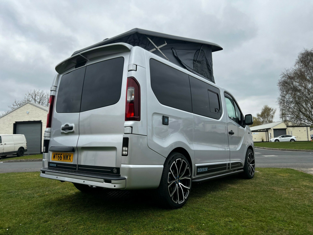 Beautiful high spec low mileage 2016 Sport Nav Renault Traffic pop top camper conversion is equipped for many more miles of outdoor adventure.Conversion includes: Scenic Pop Top Roof, Quilted Seating, Premium Soft Close Kitchen Units, 19'' Alloys, Rock & Roll Bed, 12v lighting, Fridge, Twin Hob & Sink, Swivel & Slide Base and microwave installed, diesel heater , Solar panel and awning rail.Stunning campervan ready to drive away.All Denson Campers come sold fully serviced with a minimum 6 month MOT, 3 Month Mechanical Warranty and Free Breakdown Cover. v/240v fridge, 12v/240v power sockets & usb, 19, bonnet stone protection, colour coded bumpers, denson graphics & cab mats, diesel heater, double gas hob & smev sink, premium kitchen & soft close doors, privacy glass all round, quilted leather cab & rear seating, rock & roll bed with seat belts, scenic pop top roof, side bars, solar panel, sportline body styling, 19'' Alloys