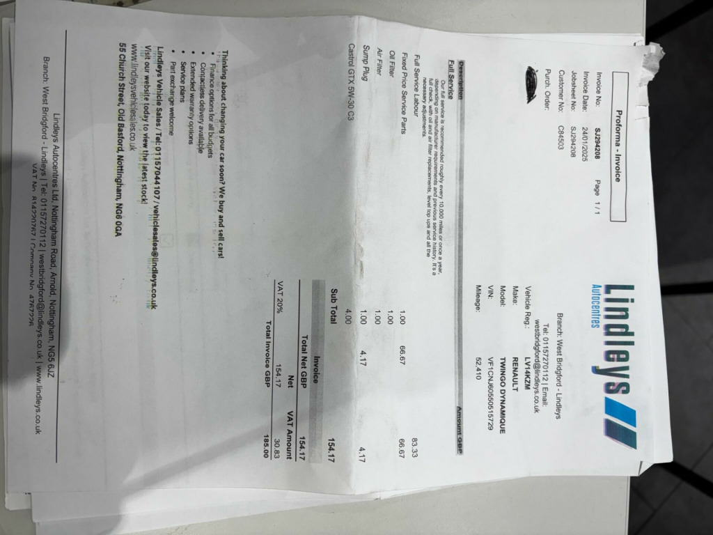 This 2014 Renault Twingo Dynamique is a great choice, having recently undergone its last service on 03 October 2025 at 58,963 miles, Cam Belt & Water replaced at 52568 6/02/2025 ,will come with a full 12 months MOT for your peace of mind. This 1.2 litre petrol model offers a partial service history and is supplied with a one month warranty.The Dynamique trim level includes manual air conditioning and Bluetooth connectivity, making every journey more comfortable and convenient. This Twingo also benefits from a low insurance group and low CO2 emissions, which indicates it is more economical to run than many similar vehicles.. 12V Power Socket, 15in Alizar Alloy Wheels, 2x Cupholders on Centre Console, 4x20W RDS Radio CD, ABS - Anti Lock Brakes, AUX Input, Air Conditioning - Manual, Airbags - Driver, Airbags - Front Lateral, Airbags - Front Passenger, Airbags - Front Passenger Deactivation, Anti Drill Door Locks, Bluetooth, Body Coloured Side Rubbing Strips, Brake Assist, Bumpers - Body Coloured, Centre Console - Gloss Black, Cruise Control with Speed Limiter, Dashboard Tray on Drivers Side, Deadlocking, Door Mirrors - Gloss Black Housing, EBD - Electronic Brake Distribution, Electric Windows - Front, Fingertip Remote Control, Front Fog Lights, Fuel Computer, Gloss Black Gear Lever Surround, Gloss Black Radio Surround, Glovebox with Integrated Sunglasses Holder, Headrests - Front Height Adjustable, ISOFIX - Child Seat Fixing Points - Rear Left Seat, Power Assisted Steering, RAID - Renault Anti Intruder Device, Remote Central Locking, Seats - Drivers Height Adjustment, Seats - Independent Sliding Rear, Seats - Independent Sliding and Folding Rear, Seats - Map Pockets on Front, Steering Wheel - Height Adjustable, Tinted Windows, Tyre Inflation Kit, USB Connection. Part service history