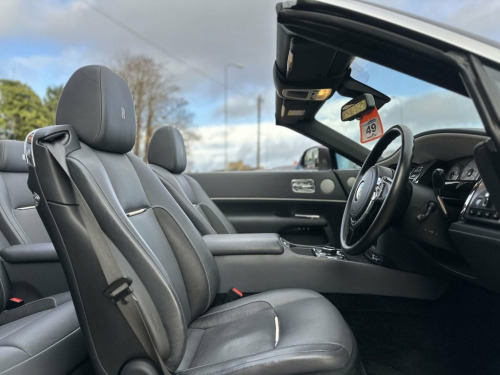 This 2016 Rolls-Royce Dawn boasts a full dealership service history, offering peace of mind for its next owner. This V12 model is powered by a robust 6.6 litre petrol engine, meeting Euro 6 emission standards. For your convenience, it features a comfort entry system for keyless access, front and rear parking sensors to aid manoeuvring, and heated front seats for those cooler days. You can also enjoy seamless connectivity with the Bluetooth system for your phone. Experience exhilarating performance with this Rolls-Royce Dawn, capable of accelerating from 0 to 60 miles per hour in just 4.8 seconds. This impressive acceleration demonstrates a level of responsiveness that sets it apart from many other vehicles. The combination of its powerful V12 engine and refined engineering ensures a driving experience that is both dynamic and supremely comfortable. Audio and Communications]10.25in Colour Display - Concealed Behind an Openable Veneered Cover, 12v Power Outlet - Front, 20.5GB Hard Disc for Music Files from either USB or CD Player, Amplifier - 10x Channel 600Watt, Assist Telematics Services with One Button Actication, Auxiliary Input Socket, Bluetooth Connection for Phone, Premium Audio System - CD DVD Player with AM FM Radio, RTTI - Real Time Traffic Information, Satellite Navigation System, Speakers x16, Subwoofers, USB Input Socket, [Drivers Assistance]Camera System - Side Rear and Top View, Dynamic Cruise Control with Speed Regulation Through Fuel Control or Braking, On Boa 10.25in Colour Display - Concealed Behin, 12v Power Outlet - Front, 20.5GB Hard Disc for Music Files from ei, 20in Alloy Wheels - 7 Spoke, ABS - Anti-Lock Brakes, Airbag - Driver and Front Passenger Knee, Airbag - Intelligent Driver, Airbag - Intelligent Front Passenger, Amplifier - 10x Channel 600Watt, ARS - Anti Roll Stabilisation, Assist Telematics Services with One Butt, Auto On Headlights, Autonomous Emergency Braking, Auxiliary Input Socket, Bamboo Cashmere Headlining, Black Hood, Bluetooth Connection for Phone, Body-Coloured Front and Rear Bumpers, Camera System - Side Rear and Top View, CBC - Cornering Brake Control, Centre Console - Full Length with Storag, Chrome Plated Visible Exh