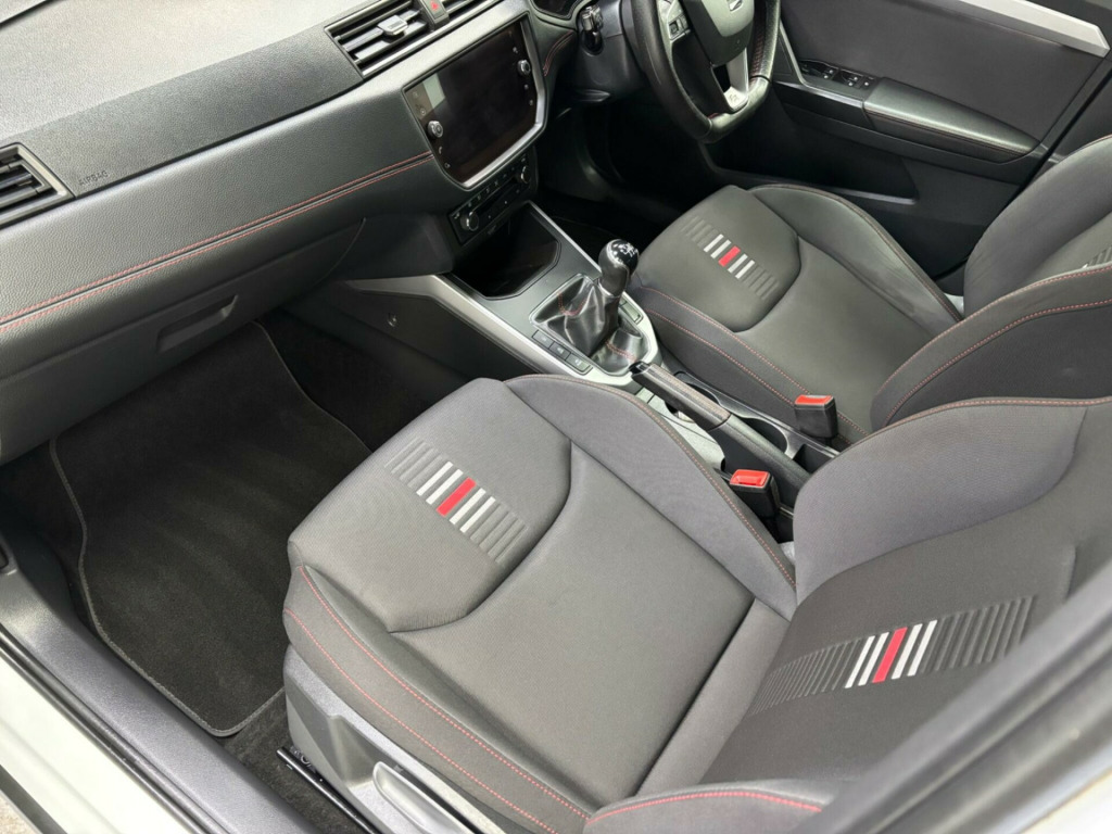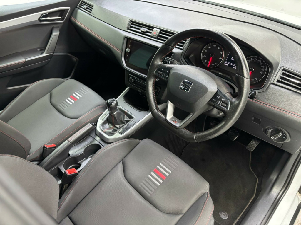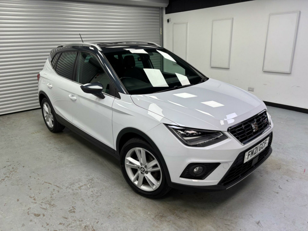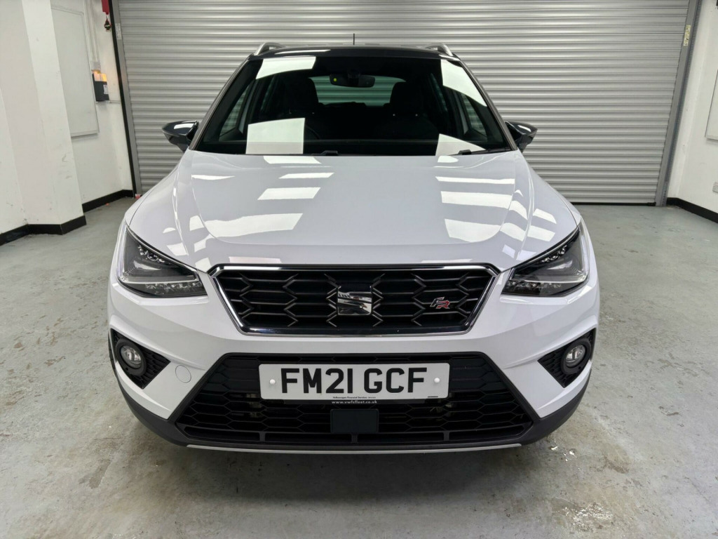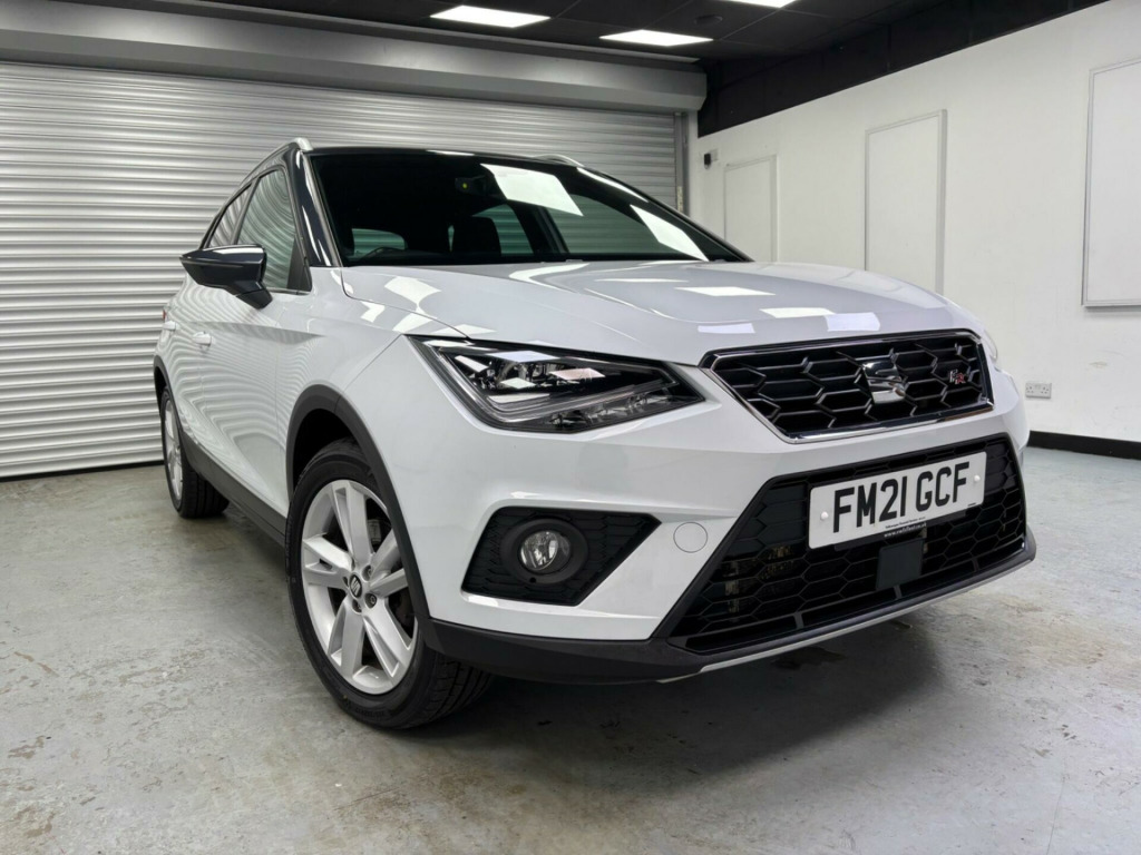 This 2021 SEAT Arona TSI FR boasts a full service history, ensuring its excellent provenance. This stylish compact SUV is powered by an efficient 1.0 litre petrol engine, meeting Euro 6 emissions standards. As a single owner vehicle, it comes equipped with desirable features such as full LED headlights for superior visibility, dual zone climate control to keep everyone comfortable, and rear parking sensors to aid manoeuvring. Stay connected and entertained with Bluetooth audio streaming, handsfree calling, and Full Link smartphone integration, compatible with both Android Auto and Apple CarPlay.The SEAT Arona TSI FR offers impressive fuel economy, achieving up to 53 miles per gallon, which is a significant advantage for your running costs compared to many other vehicles in its class. Its low CO2 emissions also contribute to a more environmentally friendly driving experience. This well maintained example provides a compelling blend of practicality, technology, and efficiency, all backed by a 3 month warranty for your peace of mind.. 17in Alloy Wheels - Dynamic, AM-FM Radio with DAB - Digital Audio Broadcasting, Aircare Filter, Alarm with Back-Up Horn, Anti-Lock Braking System - ABS, Auto Dimming Rear View Mirror, Black Interior Roof, Bluetooth Audio Streaming with Handsfree System, Chrome Roof Rails and Window Surround, Coming Home - Leaving Home Headlight Function, Connectivity Pack Plus, Contrast Roof, Cruise Control with Speed Limiter, Dark Tinted Rear Windows, Double Boot Floor, Driver and Front Passenger Airbags, Dual Zone Climate Control, EBA - Emergency Brake Assist and Front Assist, Electrically Adjustable Folding and Heated Door Mirrors, Electronic Engine Immobiliser, Electronic Stability Control - ESC, Emergency Tyre Repair Kit, Front Courtesy Light with Front Reading Lights, Front Grille Frame in Chrome, Front Sports Seats, Front and Rear Electric Windows, Front and Rear Seatbelt Reminder, Full LED Headlights, Full Link Smartphone Integration, Height Adjustable Front Seats, Hill Hold Control, ISOFIX Points in Outer Rear Seats with Top Tether Anchorage Points, Interior Ambient Light, Interior Chrome Pack, Interior Light in Footwell - Centre Console and Door Panel, LED Daytime Running Lights, LED Rear Taillight with LED Licence Plate Light, Leatherette Dashboard, Locking Wheel Bolts, Perforated Leather Flat-Bottomed Steering Wheel with Red Stitching and FR Logo with Leather Gear Knob and Handbrake, Power Assisted Steering, Protective Side Molding, RPM Counter, Rain Sensing Wipers, Rear Parking Sensors, Roof Coloured Door Mirrors, SEAT Connect - Safety - Service - Remote - Online, SEAT Drive Profile, Side Airbag in Front with Curtain Airbag, Six Speakers, Split Folding Rear Seats - 60-40, Three-Point Seatbelts on All Rear Seats, Tiredness Recognition System, Twin Exhaust Pipes, Two Front and Three Rear Height-Adjustable Headrests, Tyre Pressure Monitoring System. Full service history