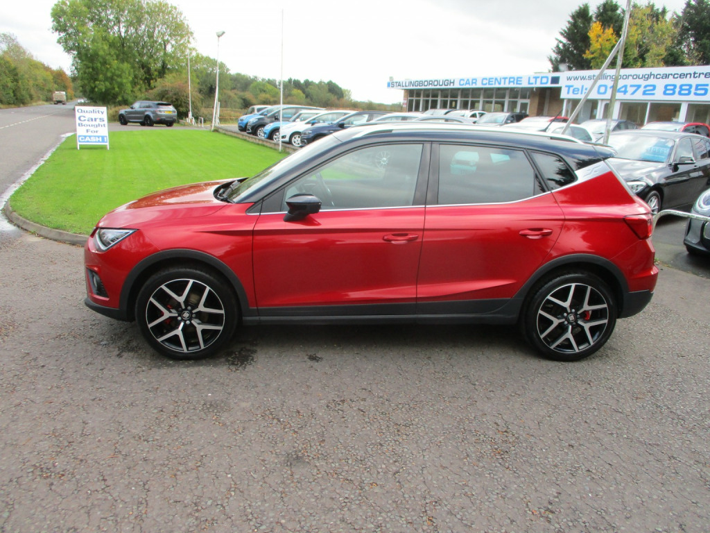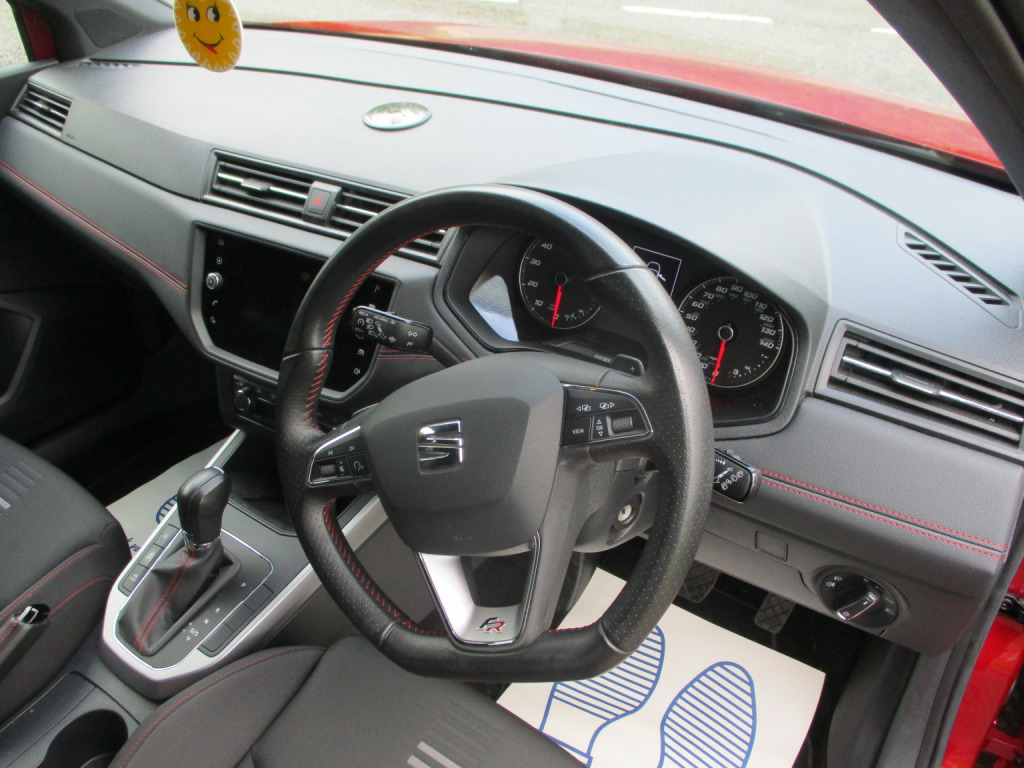 THIS VEHICLE COMES WITH 1 YEARS MOT, WARRANTIED, SERVICED AND FULLY VALETED. A BEAUTIFUL EXTREMELY LOW MILEAGE 1.0 FR 110 BHP 7 SPEED AUTOMATIC EXAMPLE OF THIS POPULAR SEAT ARONA - STUNNING IN A METALLIC RED FINISH WITH BLACK AND SILVER 10 SPOKE ALLOYS, BLACK ROOF AND MIRRORS AND SILVER ROOF RAILS + JUST 14,490 MILES !!!, SPACIOUS, COMFORTABLE AND VERSATILE WITH A GOOD SIZED BOOT AREA, SLIGHTLY HIGHER SEATING POSITION FOR EASIER ACCESS AND AUTO GEARBOX WITH OPTIONAL PADDLE SHIFT GEAR CHANGE FOR EASE OF DRIVING. GREAT SPECIFICATION INCLUDING TOUCH SCREEN INCORPORATING SAT-NAV, REVERSE ASSIST, DAB RADIO, APPLE CAR PLAY, ANDROID AUTO, MIRROR LINK, AUX. PLAY AND VOICE RECOGNITION BLUETOOTH. 4 DRIVE MODES - NORMAL, ECO, SPORT AND INDIVIDUAL. CRUISE AND DIGITAL CLIMATE CONTROLS, REVERSE SENSORS, HEATED SEATS, AUTO LIGHTS, 4 ELECTRIC WINDOWS, ELECTRIC MIRRORS, START STOP, FRONT CUP HOLDERS AND ISOFIX. LOW INSURANCE GROUP 13E.