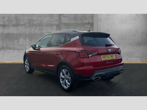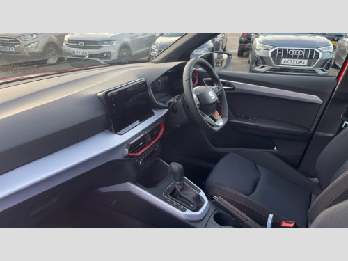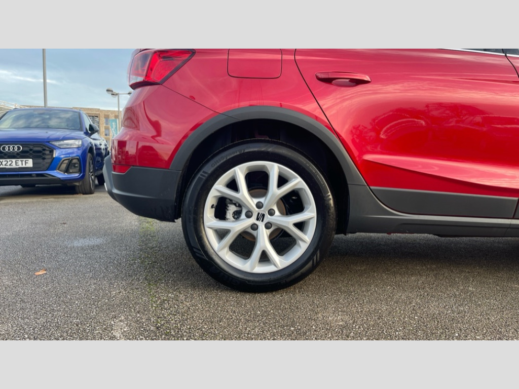 Seat Arona 1.0 TSI 115 FR 5dr DSG 'Lights On' Reminder warning buzzer, 8" Digital cockpit, Digital clock, E-call, Electric speed sensitive power steering, Full link smartphone integration with mirror link, wireless apple carplay, Google android auto + USB Type C cable for apple and android devices, Lane keeping system, Low fuel warning light, Outside temperature display, RPM counter, SEAT Drive profile - Four different models normal-sport-eco-individual, steering response, throttle response and gear shifts mode, Trip computer, Wireless phone charger, 9.2" colour touchscreen with navigation system, voice control and USB port (type c), Bluetooth interface for hands free and audio streaming, DAB digital radio and AM/FM radio, Steering wheel mounted audio controls, Anti theft roof antenna, Auto dimming interior rear view mirror, Automatic activation of hazard warning lights, Body coloured bumpers, Body coloured door handle inserts, Chrome roof rails and window surrounds, Dark tinted rear windows, Electric front/rear windows, Electrically adjustable, heated and folding door mirrors, Front fog lights with cornering function and rear fog light, FULL LED automatic headlights with dynamic headlight range control, coming and leaving home, LED daytime running lights, LED rear tail lights and licence plate lights, Protective side mouldings, Rain sensing wipers, Rear side wing doors, Rear spoiler, Rear window wash/wipe, Roof colour door mirrors, Third brake light, Twin exhaust pipe styling hidden exhaust pipe, Visible VIN plate, 2 cupholders, 3 seat bench in 2nd row, 60/40 split folding rear seat, Aircare filter, Black interior roof, Cloth upholstery, Double boot floor, Driver sunvisor with covered mirror + card holder, Dual zone climate control, Front courtesy light with front reading lights, Gear shift indicator, Height adjustable front seats, Height/reach adjustable steering column, Illuminated air vent surrounds, Illuminated boot, Instrument lighting with brightness control, Interior ambient lighting, Interior light in footwell, central console and door panel, ISOFIX points in outer rear seats with top tether anchorage points, Passenger sunvisor with vanity mirror, Perforated flat bottomed leather steering wheel/gear knob/handbrake with red stitching and FR logo, Potentiometer, Single front passenger seat, Steering wheel mounted gearshift paddles, Two front and three rear height adjustable headrests, Interior chrome pack - Arona, Safe and driving pack (S) - Arona, 3 point seatbelts on all rear seats, ABS, Active front headrests, Child locks on rear doors, Driver and front passenger airbags with front passenger airbag de activation, front side and curtain airbags, Emergency Brake Assist (EBA) and front assist, Front and rear seatbelt reminder, Hill hold control, Multi-Collision braking, Tiredness recognition system, Traction control, Tyre pressure monitoring system, Alarm with back up horn with tow away protection, Deadlock, Electronic engine immobiliser, Locking wheel bolts, Remote central locking, Titan black dashboard, 17" Dynamic alloy wheels