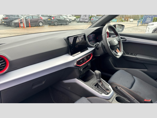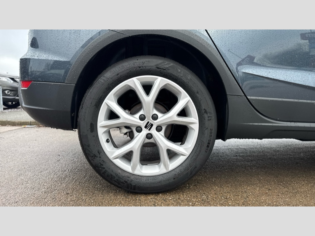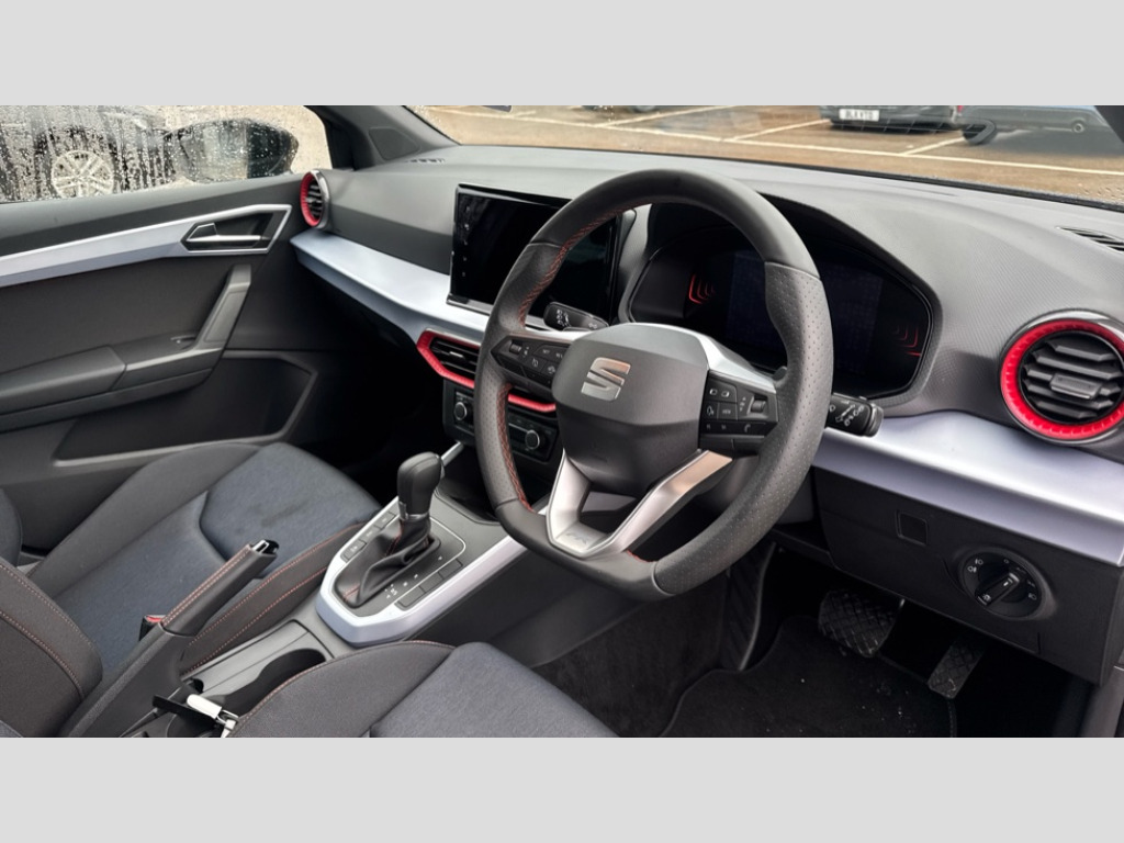Seat Arona 1.0 TSI 115 FR 5dr DSG 'Lights On' Reminder warning buzzer, 8" Digital cockpit, Digital clock, E-call, Electric speed sensitive power steering, Full link smartphone integration with mirror link, wireless apple carplay, Google android auto + USB Type C cable for apple and android devices, Lane keeping system, Low fuel warning light, Outside temperature display, RPM counter, SEAT Drive profile - Four different models normal-sport-eco-individual, steering response, throttle response and gear shifts mode, Trip computer, Wireless phone charger, 9.2" colour touchscreen with navigation system, voice control and USB port (type c), Bluetooth interface for hands free and audio streaming, DAB digital radio and AM/FM radio, Steering wheel mounted audio controls, Anti theft roof antenna, Auto dimming interior rear view mirror, Automatic activation of hazard warning lights, Body coloured bumpers, Body coloured door handle inserts, Chrome roof rails and window surrounds, Dark tinted rear windows, Electric front/rear windows, Electrically adjustable, heated and folding door mirrors, Front fog lights with cornering function and rear fog light, FULL LED automatic headlights with dynamic headlight range control, coming and leaving home, LED daytime running lights, LED rear tail lights and licence plate lights, Protective side mouldings, Rain sensing wipers, Rear side wing doors, Rear spoiler, Rear window wash/wipe, Roof colour door mirrors, Third brake light, Twin exhaust pipe styling hidden exhaust pipe, Visible VIN plate, 2 cupholders, 3 seat bench in 2nd row, 60/40 split folding rear seat, Aircare filter, Black interior roof, Cloth upholstery, Double boot floor, Driver sunvisor with covered mirror + card holder, Dual zone climate control, Front courtesy light with front reading lights, Gear shift indicator, Height adjustable front seats, Height/reach adjustable steering column, Illuminated air vent surrounds, Illuminated boot, Instrument lighting with brightness control, Interior ambient lighting, Interior light in footwell, central console and door panel, ISOFIX points in outer rear seats with top tether anchorage points, Passenger sunvisor with vanity mirror, Perforated flat bottomed leather steering wheel/gear knob/handbrake with red stitching and FR logo, Potentiometer, Single front passenger seat, Steering wheel mounted gearshift paddles, Two front and three rear height adjustable headrests, Interior chrome pack - Arona, Safe and driving pack (S) - Arona, 3 point seatbelts on all rear seats, ABS, Active front headrests, Child locks on rear doors, Driver and front passenger airbags with front passenger airbag de activation, front side and curtain airbags, Emergency Brake Assist (EBA) and front assist, Front and rear seatbelt reminder, Hill hold control, Multi-Collision braking, Tiredness recognition system, Traction control, Tyre pressure monitoring system, Alarm with back up horn with tow away protection, Deadlock, Electronic engine immobiliser, Locking wheel bolts, Remote central locking, Titan black dashboard, 17" Dynamic alloy wheels