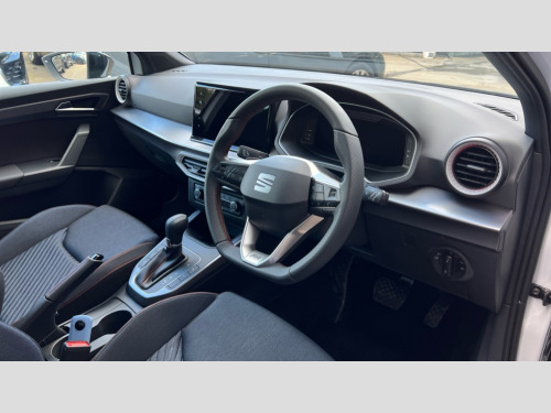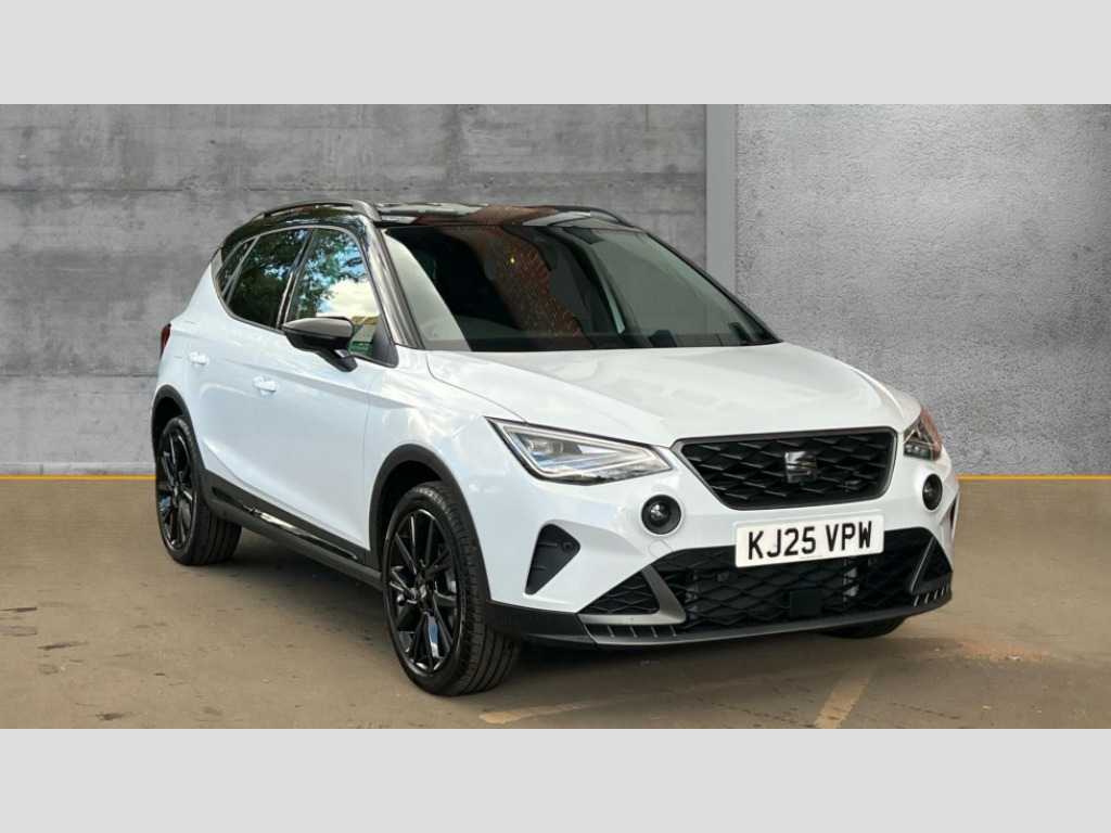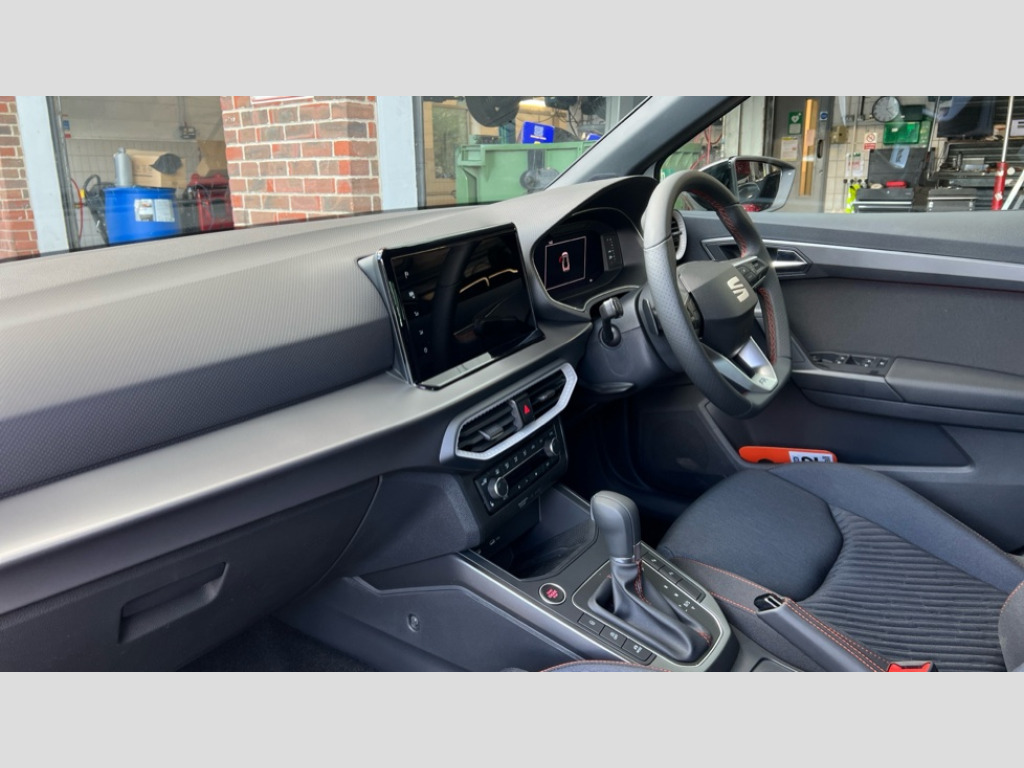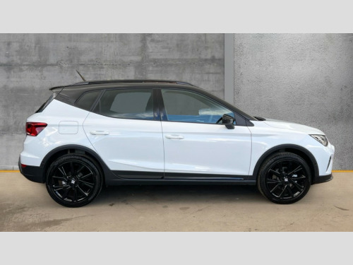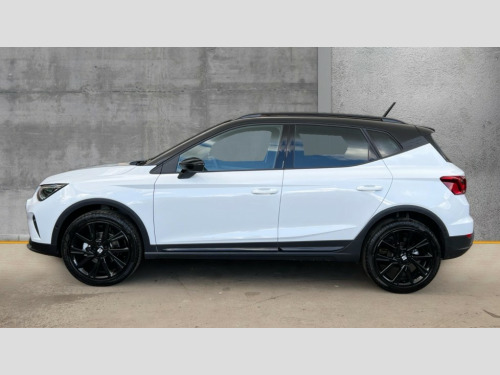 Seat Arona 1.0 TSI 115 FR Black Edition 5dr DSG 'Lights On' Reminder warning buzzer, 10" Digital cockpit, Digital clock, E-call, Electric speed sensitive power steering, Full link smartphone integration with mirror link, wireless apple carplay, Google android auto + USB Type C cable for apple and android devices, Lane keeping system, Low fuel warning light, Outside temperature display, Park assist system, Rear view camera, RPM counter, SEAT Drive profile - Four different models normal-sport-eco-individual, steering response, throttle response and gear shifts mode, Trip computer, Wireless phone charger, 9.2" colour touchscreen with navigation system, voice control and USB port (type c), Bluetooth interface for hands free and audio streaming, DAB digital radio and AM/FM radio, Steering wheel mounted audio controls, Anti theft roof antenna, Auto dimming interior rear view mirror, Automatic activation of hazard warning lights, Black roof rails and window surrounds, Black side skirts, Body coloured bumpers, Body coloured door handle inserts, Dark tinted rear windows, Electric front/rear windows, Electrically adjustable, heated and folding door mirrors, Front fog lights with cornering function and rear fog light, FULL LED automatic headlights with dynamic headlight range control, coming and leaving home, LED daytime running lights, Lasered lettering on B pillar, LED rear tail lights and licence plate lights, Protective side mouldings, Rain sensing wipers, Rear side wing doors, Rear spoiler, Rear window wash/wipe, Roof colour door mirrors, Third brake light, Twin exhaust pipe styling hidden exhaust pipe, Visible VIN plate, 2 cupholders, 3 seat bench in 2nd row, 60/40 split folding rear seat, Aircare filter, Black interior roof, Double boot floor, Driver sunvisor with covered mirror + card holder, Dual zone climate control, Front courtesy light with front reading lights, Front seat back storage pockets, Gear shift indicator, Grey interior air vents, Heated front seats, Height adjustable front seats, Height/reach adjustable steering column, Illuminated air vent surrounds, Illuminated boot, Instrument lighting with brightness control, Interior ambient lighting, Interior light in footwell, central console and door panel, ISOFIX points in outer rear seats with top tether anchorage points, Microsuede cloth upholstery, Passenger sunvisor with vanity mirror, Perforated flat bottomed leather steering wheel/gear knob/handbrake with red stitching and FR logo, Potentiometer, Single front passenger seat, Sports cloth bucket seats, Steering wheel mounted gearshift paddles, Two front and three rear height adjustable headrests, Interior chrome pack - Arona, Safe and driving pack (S) - Arona, Safety and driving pack (M) - Arona, ABS, Active front headrests, Child locks on rear doors, Driver and front passenger airbags with front passenger airbag de activation, front side and curtain airbags, Emergency Brake Assist (EBA) and front assist, Front and rear seatbelt reminder, Hill hold control, Multi-Collision braking, Tiredness recognition system, Traction control, Tyre pressure monitoring system, Alarm with back up horn with tow away protection, Deadlock, Electronic engine immobiliser, KESSY Keyless entry and go, Locking wheel bolts, Remote central locking, Titan black dashboard, 18" Black alloy wheels