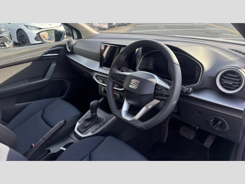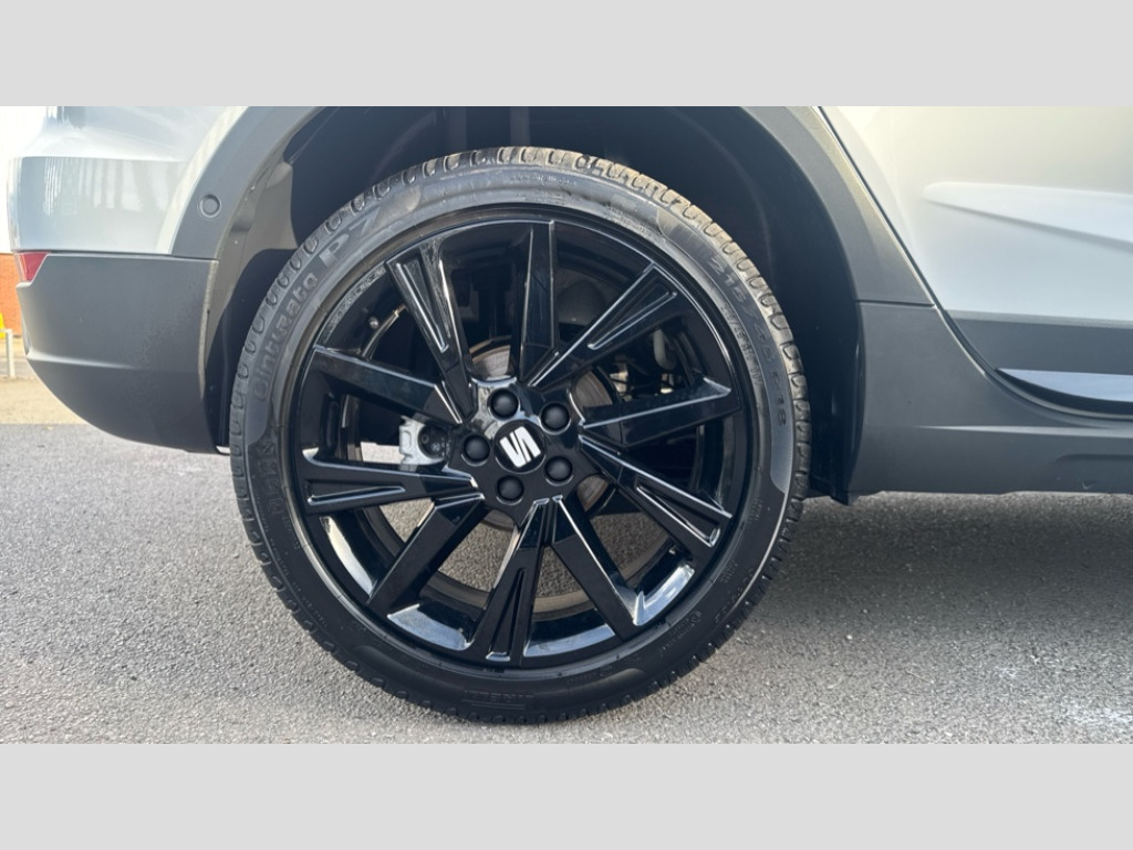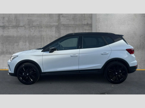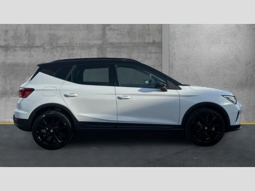 Seat Arona 1.0 TSI 115 FR Black Edition 5dr DSG 'Lights On' Reminder warning buzzer, 10" Digital cockpit, Digital clock, E-call, Electric speed sensitive power steering, Full link smartphone integration with mirror link, wireless apple carplay, Google android auto + USB Type C cable for apple and android devices, Lane keeping system, Low fuel warning light, Outside temperature display, Park assist system, Rear view camera, RPM counter, SEAT Drive profile - Four different models normal-sport-eco-individual, steering response, throttle response and gear shifts mode, Trip computer, Wireless phone charger, 9.2" colour touchscreen with navigation system, voice control and USB port (type c), Bluetooth interface for hands free and audio streaming, DAB digital radio and AM/FM radio, Steering wheel mounted audio controls, Anti theft roof antenna, Auto dimming interior rear view mirror, Automatic activation of hazard warning lights, Black roof rails and window surrounds, Black side skirts, Body coloured bumpers, Body coloured door handle inserts, Dark tinted rear windows, Electric front/rear windows, Electrically adjustable, heated and folding door mirrors, Front fog lights with cornering function and rear fog light, FULL LED automatic headlights with dynamic headlight range control, coming and leaving home, LED daytime running lights, Lasered lettering on B pillar, LED rear tail lights and licence plate lights, Protective side mouldings, Rain sensing wipers, Rear side wing doors, Rear spoiler, Rear window wash/wipe, Roof colour door mirrors, Third brake light, Twin exhaust pipe styling hidden exhaust pipe, Visible VIN plate, 2 cupholders, 3 seat bench in 2nd row, 60/40 split folding rear seat, Aircare filter, Black interior roof, Double boot floor, Driver sunvisor with covered mirror + card holder, Dual zone climate control, Front courtesy light with front reading lights, Front seat back storage pockets, Gear shift indicator, Grey interior air vents, Heated front seats, Height adjustable front seats, Height/reach adjustable steering column, Illuminated air vent surrounds, Illuminated boot, Instrument lighting with brightness control, Interior ambient lighting, Interior light in footwell, central console and door panel, ISOFIX points in outer rear seats with top tether anchorage points, Microsuede cloth upholstery, Passenger sunvisor with vanity mirror, Perforated flat bottomed leather steering wheel/gear knob/handbrake with red stitching and FR logo, Potentiometer, Single front passenger seat, Sports cloth bucket seats, Steering wheel mounted gearshift paddles, Two front and three rear height adjustable headrests, Interior chrome pack - Arona, Safe and driving pack (S) - Arona, Safety and driving pack (M) - Arona, ABS, Active front headrests, Child locks on rear doors, Driver and front passenger airbags with front passenger airbag de activation, front side and curtain airbags, Emergency Brake Assist (EBA) and front assist, Front and rear seatbelt reminder, Hill hold control, Multi-Collision braking, Tiredness recognition system, Traction control, Tyre pressure monitoring system, Alarm with back up horn with tow away protection, Deadlock, Electronic engine immobiliser, KESSY Keyless entry and go, Locking wheel bolts, Remote central locking, Titan black dashboard, 18" Black alloy wheels