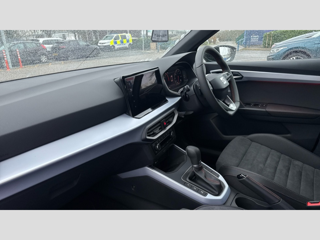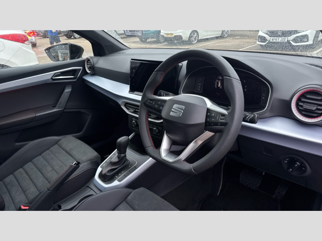 Seat Arona 1.0 TSI 115 FR Sport 5dr DSG 'Lights On' Reminder warning buzzer, 10" Digital cockpit, Digital clock, E-call, Electric speed sensitive power steering, Full link smartphone integration with mirror link, wireless apple carplay, Google android auto + USB Type C cable for apple and android devices, Lane keeping system, Low fuel warning light, Outside temperature display, RPM counter, SEAT Drive profile - Four different models normal-sport-eco-individual, steering response, throttle response and gear shifts mode, Trip computer, Wireless phone charger, 9.2" colour touchscreen with navigation system, voice control and USB port (type c), Bluetooth interface for hands free and audio streaming, DAB digital radio and AM/FM radio, Steering wheel mounted audio controls, Anti theft roof antenna, Auto dimming interior rear view mirror, Automatic activation of hazard warning lights, Body coloured bumpers, Body coloured door handle inserts, Chrome roof rails and window surrounds, Dark tinted rear windows, Electric front/rear windows, Electrically adjustable, heated and folding door mirrors, Front fog lights with cornering function and rear fog light, FULL LED automatic headlights with dynamic headlight range control, coming and leaving home, LED daytime running lights, LED rear tail lights and licence plate lights, Protective side mouldings, Rain sensing wipers, Rear side wing doors, Rear spoiler, Rear window wash/wipe, Roof colour door mirrors, Third brake light, Twin exhaust pipe styling hidden exhaust pipe, Visible VIN plate, 2 cupholders, 3 seat bench in 2nd row, 60/40 split folding rear seat, Aircare filter, Black interior roof, Double boot floor, Driver sunvisor with covered mirror + card holder, Dual zone climate control, Front comfort seats, Front courtesy light with front reading lights, Front seat back storage pockets, Gear shift indicator, Heated front seats, Height adjustable front seats, Height/reach adjustable steering column, Illuminated air vent surrounds, Illuminated boot, Instrument lighting with brightness control, Interior ambient lighting, Interior light in footwell, central console and door panel, ISOFIX points in outer rear seats with top tether anchorage points, Microsuede cloth upholstery, Passenger sunvisor with vanity mirror, Perforated flat bottomed leather steering wheel/gear knob/handbrake with red stitching and FR logo, Potentiometer, Single front passenger seat, Steering wheel mounted gearshift paddles, Two front and three rear height adjustable headrests, Interior chrome pack - Arona, Safe and driving pack (S) - Arona, 3 point seatbelts on all rear seats, ABS, Active front headrests, Child locks on rear doors, Driver and front passenger airbags with front passenger airbag de activation, front side and curtain airbags, Emergency Brake Assist (EBA) and front assist, Front and rear seatbelt reminder, Hill hold control, Multi-Collision braking, Tiredness recognition system, Traction control, Tyre pressure monitoring system, Alarm with back up horn with tow away protection, Deadlock, Electronic engine immobiliser, Locking wheel bolts, Remote central locking, Titan black dashboard, 18" Performance Cosmo grey matt alloy wheels