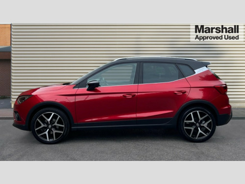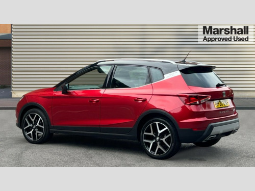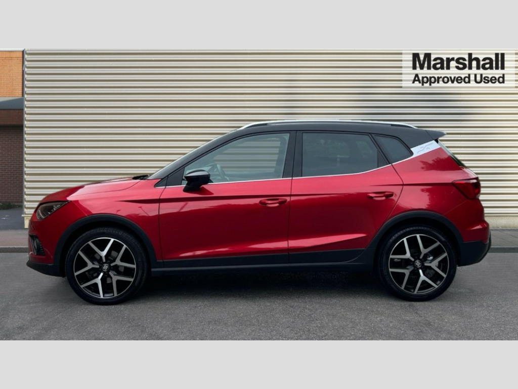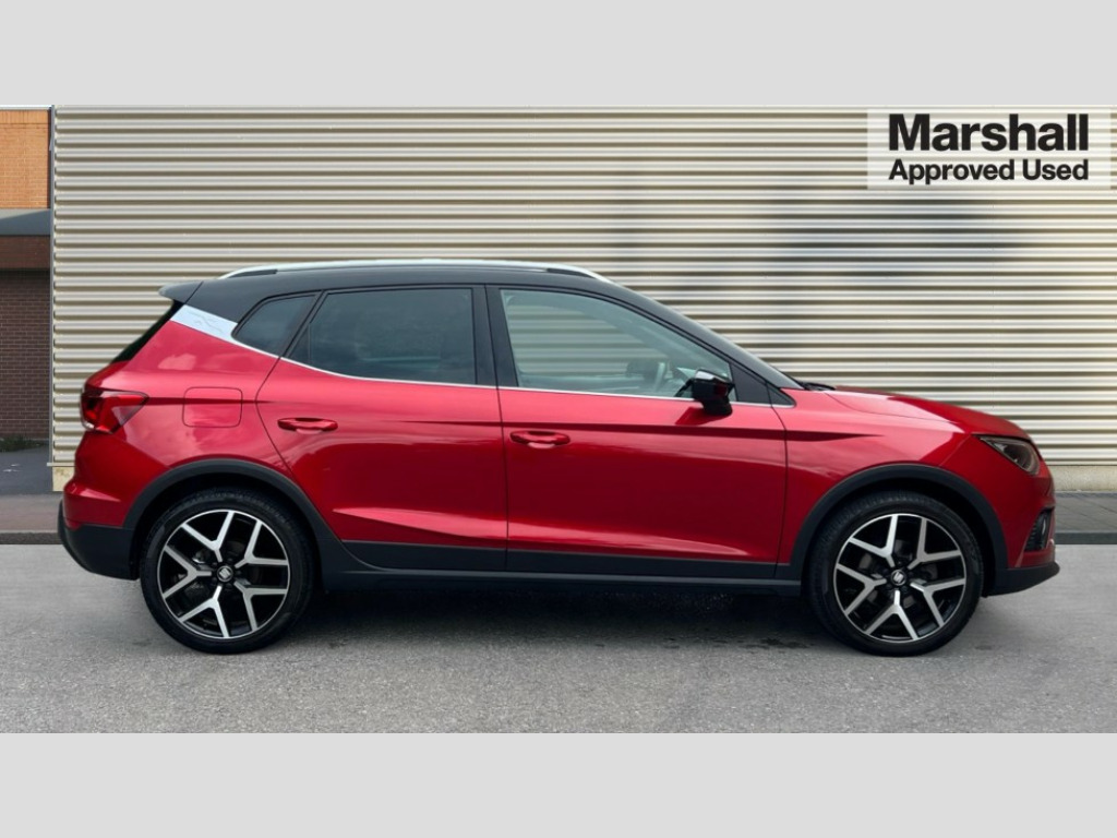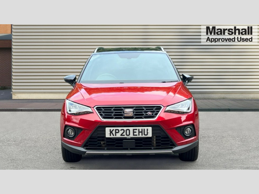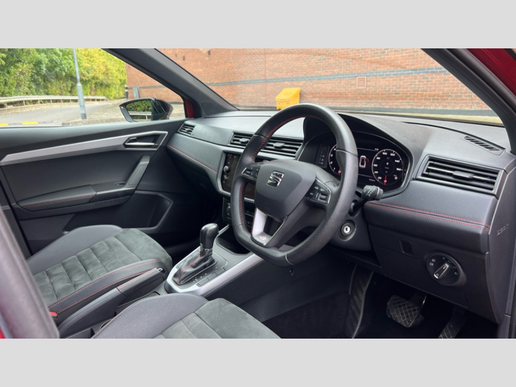Seat Arona 1.0 TSI 115 FR Sport [EZ] 5dr DSG 'Lights On' Reminder warning buzzer, Cruise control, Digital clock, Digital cockpit, Electric speed sensitive power steering, Full Link Smartphone Integration with Mirror Link, Apple Car Play, Google Android Auto with USB Type C cable for Apple and Android compatibility, Low fuel warning light, Outside temperature display, Rear parking sensor, RPM counter, SEAT Drive profile - Four different models normal-sport-eco-individual, steering response, throttle response and gear shifts mode, Trip computer, Sports suspension, 6 speakers, Bluetooth interface for hands free and audio streaming, DAB digital radio and AM/FM radio, Steering wheel mounted audio controls, Anti theft roof antenna, Auto dimming interior rear view mirror, Automatic activation of hazard warning lights, Automatic headlights, Body coloured bumpers, Body coloured door handle inserts, Chrome front grille frame, Chrome roof rails, Chrome window trim, Coming/leaving home lighting function, Dark tinted rear windows, Electric front/rear windows with one touch/auto up/down, Electrically adjustable, heated and folding door mirrors, Full LED headlights dipped and mainbeam + front and rear fog lights, Ice metal door side panels, LED daytime running lights, LED rear tail lights and licence plate lights, Rain sensing wipers, Rear window wash/wipe, Roof colour door mirrors, Twin exhaust pipe styling hidden exhaust pipe, Visible VIN plate, Windshield wiper with intermittent control and potentiometer, 2 cupholders, 60/40 split folding rear seat, Black interior roof, Double boot floor, Driver sunvisor with covered mirror + card holder, Dual zone climate control, Dust/pollen filter, Front courtesy light with front reading lights, Front sport seats, Gear shift indicator, Gearshift paddles on steering wheel, Height adjustable front seats, Height/reach adjustable steering column, Illuminated boot, Instrument lighting with brightness control, Interior footwell lighting, ISOFIX points in outer rear seats with top tether anchorage points, Microsuede cloth upholstery, Multi-colour ambient interior lighting, Passenger sunvisor with vanity mirror, Perforated flat bottomed leather steering wheel/gear knob/handbrake with red stitching and FR logo, Two front and three rear height adjustable headrests, Connectivity pack plus - Arona, Interior chrome pack - Arona, Winter pack - Arona, 3 point seatbelts on all rear seats, ABS, Active front headrests, Child locks on rear doors, Driver and front passenger airbags with front passenger airbag de activation, front side and curtain airbags, Electronic stability control, Emergency Brake Assist (EBA) and front assist, Front and rear seatbelt reminder, Hill hold control, Multi-Collision braking, Tiredness recognition system, Traction control, Tyre pressure monitoring system, 2 folding remote keys with window open/close function, Alarm with back-up horn, Electronic engine immobiliser, Locking wheel bolts, Remote central locking + deadlocks, Tow away protection, Interior chrome line trim, Leatherette dashboard, 18" Performance alloy wheels