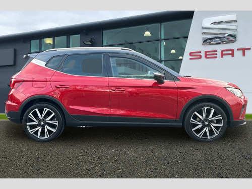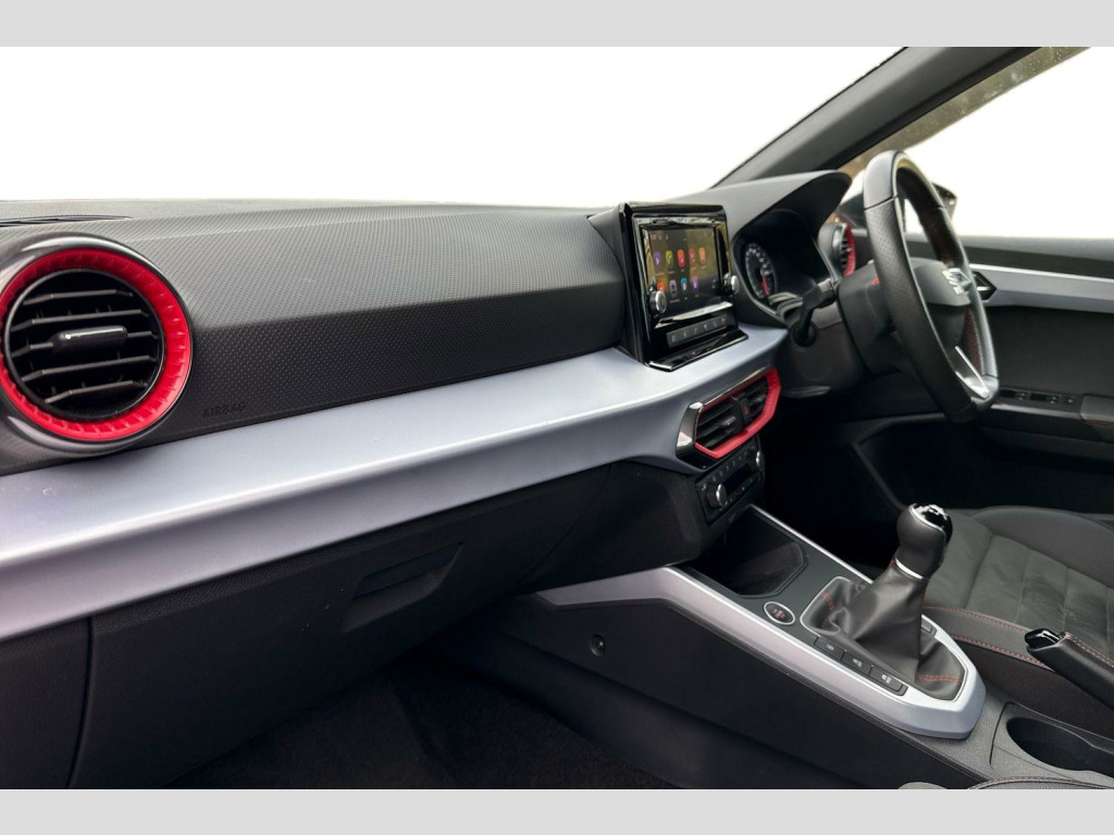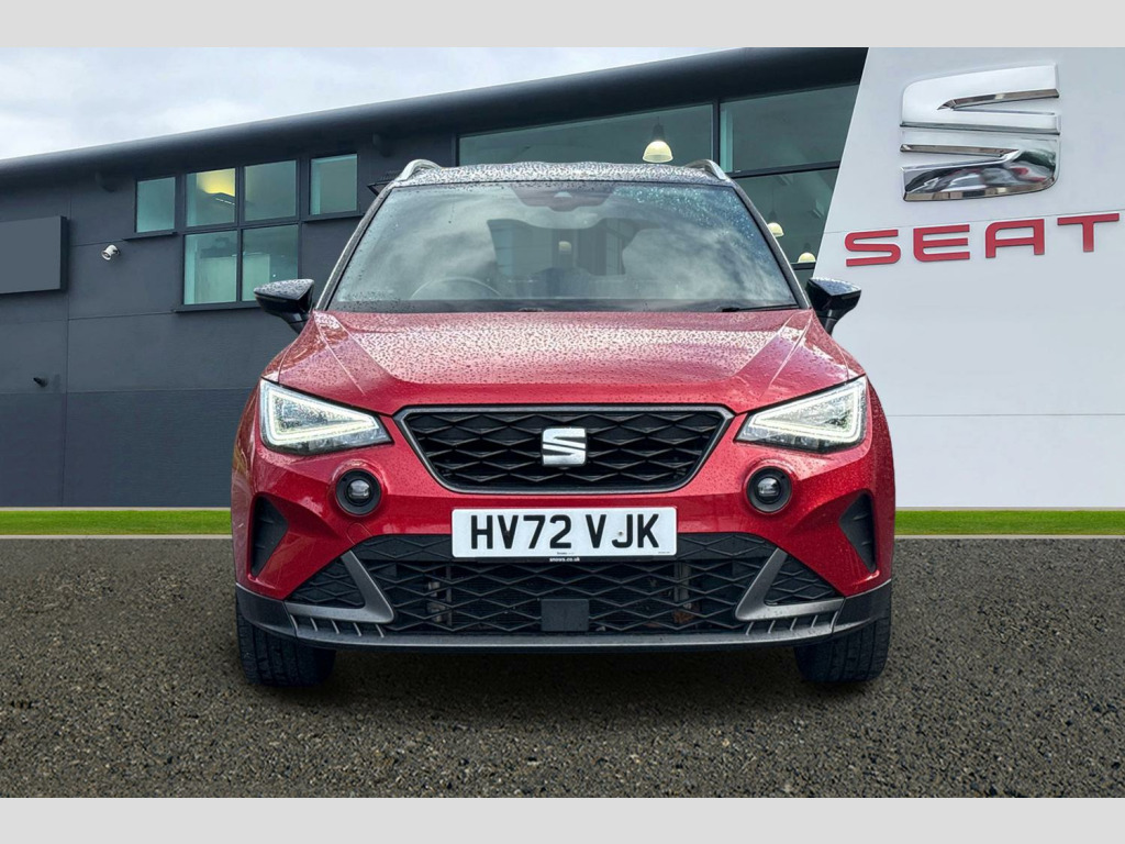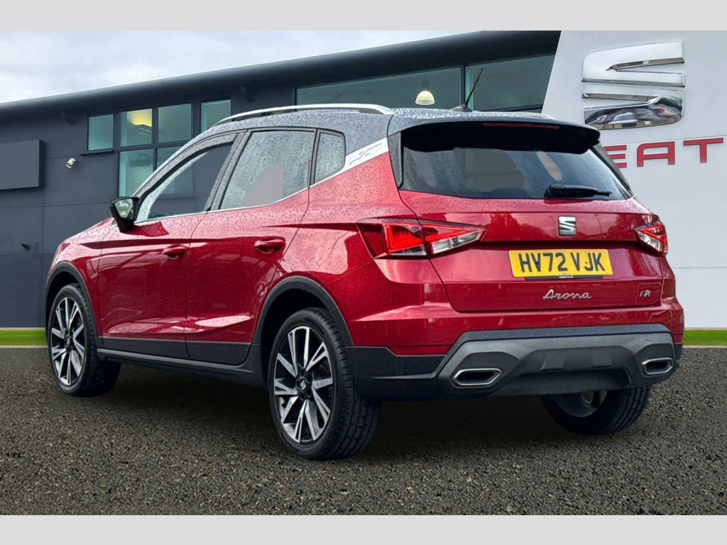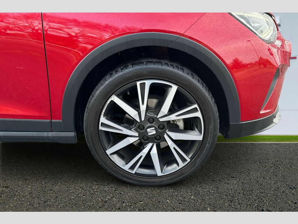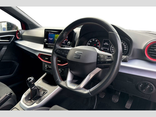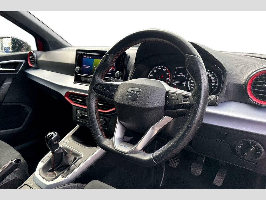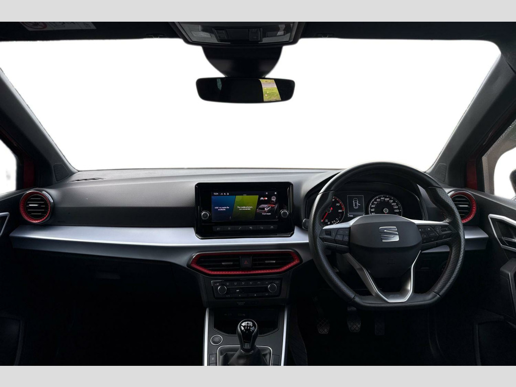 'Lights On' Reminder warning buzzer, Analogue cockpit with physical dials, Digital clock, E-call, Electric speed sensitive power steering, Full Link Smartphone Integration with Mirror Link, Apple Car Play, Google Android Auto with USB Type C cable for Apple and Android compatibility, Lane keeping system, Low fuel warning light, Outside temperature display, Rear parking sensor, RPM counter, Seat connect with safety, service and remote, SEAT Drive profile - Four different models normal-sport-eco-individual, steering response, throttle response, Trip computer, Wireless phone charger, Bluetooth interface for hands free and audio streaming, DAB digital radio and AM/FM radio, Media system with 8.25" colour touchscreen with USB port (type c), Steering wheel mounted audio controls, Anti theft roof antenna, Automatic activation of hazard warning lights, Body coloured bumpers, Body coloured door handle inserts, Chrome roof rails and window surrounds, Dark tinted rear windows, Dimming rear view mirror, Electric front/rear windows, Electrically adjustable and heated door mirrors, Front fog lights with cornering function and rear fog light, FULL LED automatic headlights with dynamic headlight range control, coming and leaving home, LED daytime running lights, LED rear tail lights and licence plate lights, Protective side mouldings, Rear side wing doors, Rear spoiler, Rear window wash/wipe, Roof colour door mirrors, Third brake light, Twin exhaust pipe styling hidden exhaust pipe, Visible VIN plate, Windshield wiper with intermittent control and potentiometer, 2 cupholders, 3 seat bench in 2nd row, 60/40 split folding rear seat, Aircare filter, Black interior roof, Double boot floor, Driver sunvisor with covered mirror + card holder, Dual zone climate control, Front comfort seats, Front courtesy light with 2x front and 2x rear reading lights, Gear shift indicator, Height adjustable front seats, Height/reach adjustable steering column, Illuminated boot, Instrument lighting with brightness control, Interior ambient lighting, Interior light in footwell, central console and door panel, ISOFIX points in outer rear seats with top tether anchorage points, Microsuede cloth upholstery, Passenger sunvisor with vanity mirror, Perforated flat bottomed leather steering wheel/gear knob/handbrake with red stitching and FR logo, Single front passenger seat, Two front and three rear height adjustable headrests, Interior chrome pack - Arona, 3 point seatbelts on all rear seats, ABS, Active front headrests, Child locks on rear doors, Driver and front passenger airbags with front passenger airbag de activation, front side and curtain airbags, Electronic stability control, Emergency Brake Assist (EBA) and front assist, Front and rear seatbelt reminder, Hill hold control, Multi-Collision braking, Tiredness recognition system, Traction control, Tyre pressure monitoring system, Alarm with back-up horn, Electronic engine immobiliser, KESSY Keyless entry and go, Locking wheel bolts, Remote central locking + deadlocks, Tow away protection, Titan black dashboard