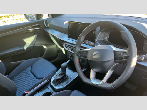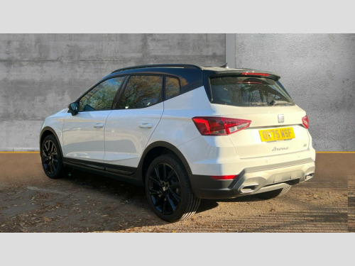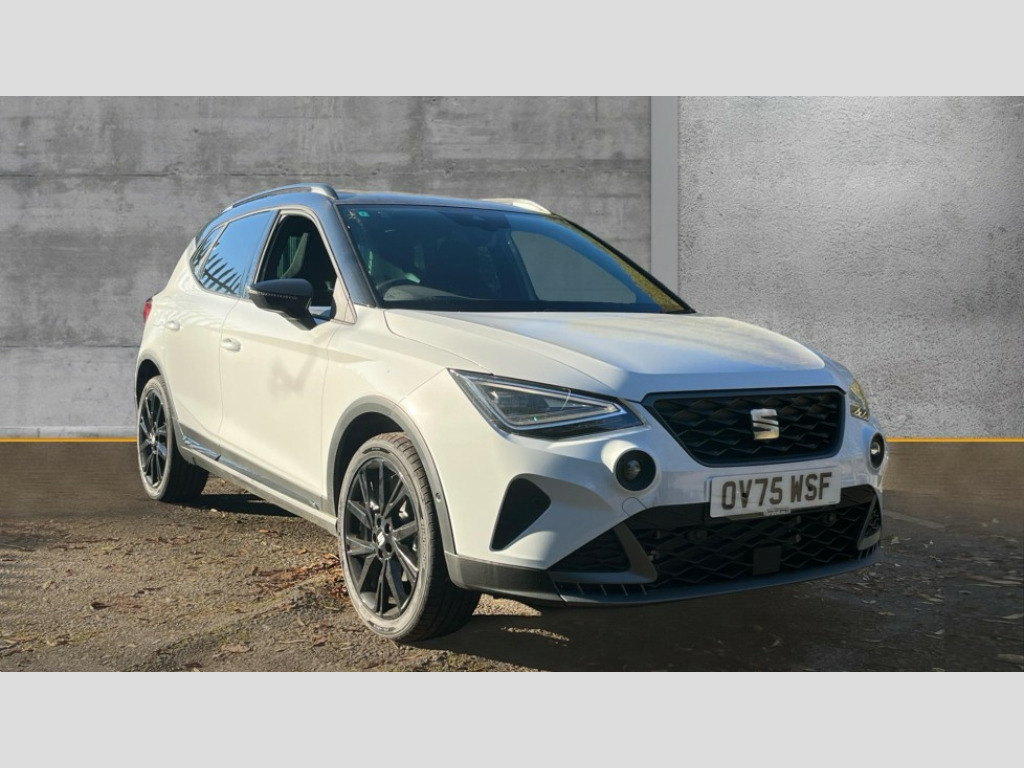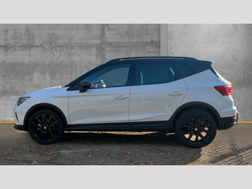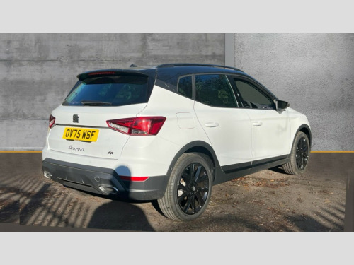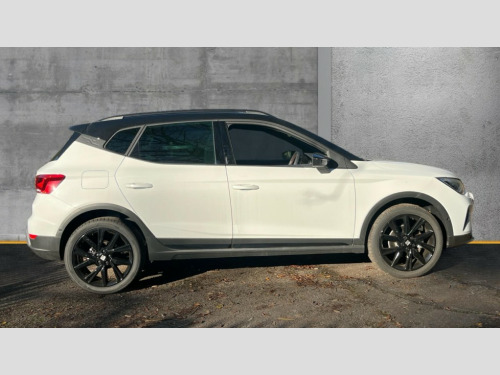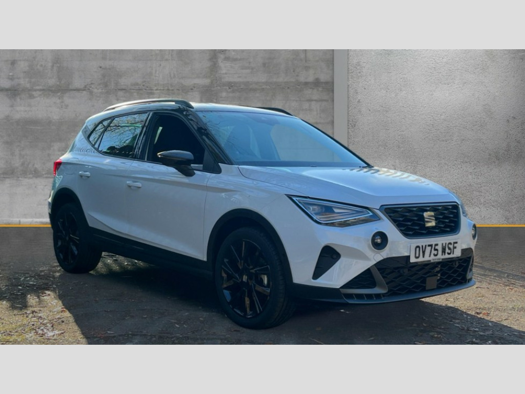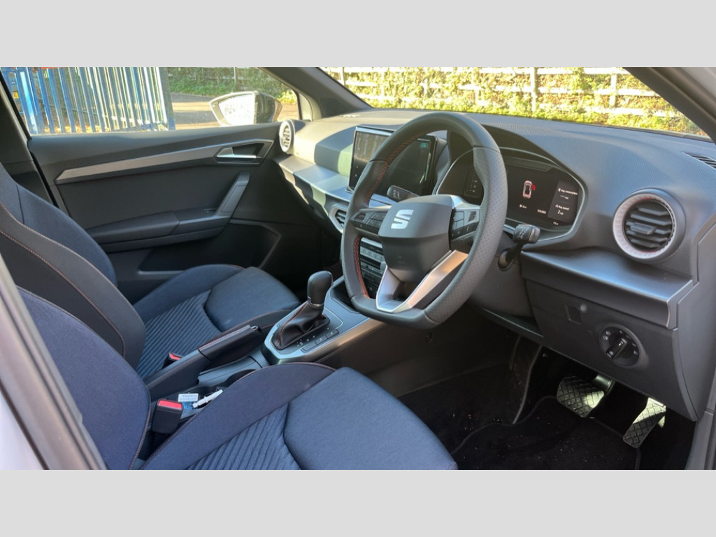 Seat Arona 1.0 TSI 115 FR Black Edition 5dr DSG 'Lights On' Reminder warning buzzer, 10" Digital cockpit, Digital clock, E-call, Electric speed sensitive power steering, Full link smartphone integration with mirror link, wireless apple carplay, Google android auto + USB Type C cable for apple and android devices, Lane keeping system, Low fuel warning light, Outside temperature display, Park assist system, Rear view camera, RPM counter, SEAT Drive profile - Four different models normal-sport-eco-individual, steering response, throttle response and gear shifts mode, Trip computer, Wireless phone charger, 9.2" colour touchscreen with navigation system, voice control and USB port (type c), Bluetooth interface for hands free and audio streaming, DAB digital radio and AM/FM radio, Steering wheel mounted audio controls, Anti theft roof antenna, Auto dimming interior rear view mirror, Automatic activation of hazard warning lights, Black roof rails and window surrounds, Black side skirts, Body coloured bumpers, Body coloured door handle inserts, Dark tinted rear windows, Electric front/rear windows, Electrically adjustable, heated and folding door mirrors, Front fog lights with cornering function and rear fog light, FULL LED automatic headlights with dynamic headlight range control, coming and leaving home, LED daytime running lights, Lasered lettering on B pillar, LED rear tail lights and licence plate lights, Protective side mouldings, Rain sensing wipers, Rear side wing doors, Rear spoiler, Rear window wash/wipe, Roof colour door mirrors, Third brake light, Twin exhaust pipe styling hidden exhaust pipe, Visible VIN plate, 2 cupholders, 3 seat bench in 2nd row, 60/40 split folding rear seat, Aircare filter, Black interior roof, Double boot floor, Driver sunvisor with covered mirror + card holder, Dual zone climate control, Front courtesy light with front reading lights, Front seat back storage pockets, Gear shift indicator, Grey interior air vents, Heated front seats, Height adjustable front seats, Height/reach adjustable steering column, Illuminated air vent surrounds, Illuminated boot, Instrument lighting with brightness control, Interior ambient lighting, Interior light in footwell, central console and door panel, ISOFIX points in outer rear seats with top tether anchorage points, Microsuede cloth upholstery, Passenger sunvisor with vanity mirror, Perforated flat bottomed leather steering wheel/gear knob/handbrake with red stitching and FR logo, Potentiometer, Single front passenger seat, Sports cloth bucket seats, Steering wheel mounted gearshift paddles, Two front and three rear height adjustable headrests, Interior chrome pack - Arona, Safe and driving pack (S) - Arona, Safety and driving pack (M) - Arona, ABS, Active front headrests, Child locks on rear doors, Driver and front passenger airbags with front passenger airbag de activation, front side and curtain airbags, Emergency Brake Assist (EBA) and front assist, Front and rear seatbelt reminder, Hill hold control, Multi-Collision braking, Tiredness recognition system, Traction control, Tyre pressure monitoring system, Alarm with back up horn with tow away protection, Deadlock, Electronic engine immobiliser, KESSY Keyless entry and go, Locking wheel bolts, Remote central locking, Titan black dashboard, 18" Black alloy wheels