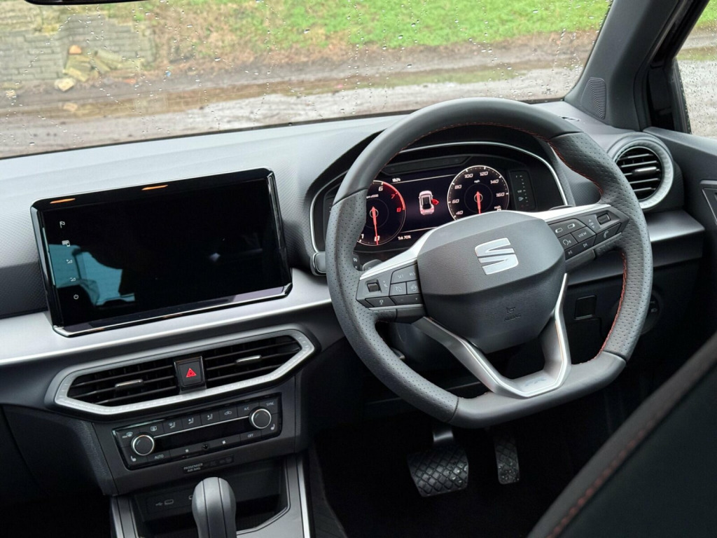 **LIMITED AVAILABILITY** 18in Alloy Wheels - Black, 9.2in Touchscreen Display, Aircare Filter, Alarm - Perimeter and Interior Monitoring with Back-up Horn and Tow-Away Protection, Auto Dimming Rear View Mirror, Black Interior Roof, Black Roof Rails and Window Surround, Black Side Skirts, Bluetooth Audio Streaming with Handsfree System, Contrast Roof, Dark Tinted Rear Windows, Digital Cockpit - 10in, Double Boot Floor, Driver and Front Passenger Airbags, Dual Zone Climate Control, EBA - Emergency Brake Assist and Front Assist, Electrically Adjustable Folding and Heated Door Mirrors, Electronic Engine Immobiliser, Emergency Tyre Repair Kit, Front Courtesy Light with Front Reading Lights, Front Fog Lights with Cornering Function, Front Seats with Back Storage Pockets, Front and Rear Electric Windows, Front and Rear Seatbelt Reminder, Full LED Automatic Headlight, Full Link Smartphone Integration, Grey Interior Air Vents, Heated Front Seats, Height Adjustable Front Seats, Hill Hold Control, ISOFIX Points in Outer Rear Seats with Top Tether Anchorage Points, Illuminated Air Vent Surrounds, Interior Ambient Light, Interior Chrome Pack, Interior Light in Footwell - Centre Console and Door Panel, KESSY - Keyless Entry and Go, LED Rear Taillights, Lane Keeping System, Lasered Lettering on B Pillar, Licence Plate Lights, Locking Wheel Bolts, Park Assist, Perforated Leather Flat-Bottomed Steering Wheel with Red Stitching and FR Logo with Leather Gear Knob and Handbrake, Protective Side Moulding, Rain Sensing Wipers, Rear Fog Light, Rear Spoiler, Rear View Camera, Roof Coloured Door Mirrors, SEAT Connect - Safety - Service - Remote - Online, SEAT Connect Plus, SEAT Drive Profile, Safety and Driving Pack - Medium, Safety and Driving Pack - Small, Side Airbag in Front with Curtain Airbag, Six Speakers, Split Folding Rear Seats - 60-40, Sports Cloth Bucket Seats, Steering System - C-EPS - Column Electric Power System, Sunvisors with Mirror and Cardholder - Driver Side, Three-Point Seatbelts on All Rear Seats, Tiredness Recognition System, Titan Black Dashboard, Twin Exhaust Pipes, Two Front and Three Rear Height-Adjustable Headrests, Tyre Pressure Monitoring System, Wireless Phone Charger