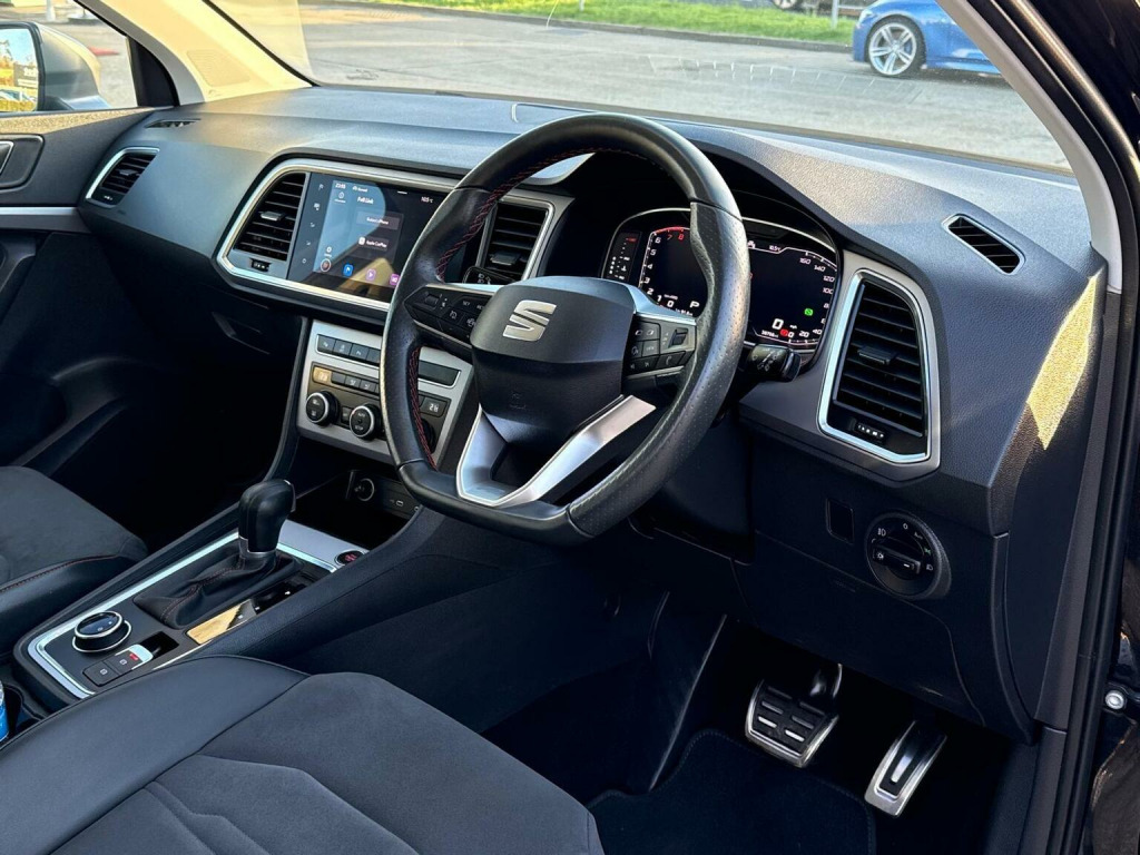 This 2023 SEAT Ateca TSI EVO FR is a superb example, having had only one owner since new. This stylish SUV boasts a 1.5 litre Euro 6 petrol engine, offering a responsive drive. The FR trim level enhances its sporty appeal, and youll appreciate the convenience of Full LED Headlights for excellent visibility. Navigating tight spots is made easier with the Park Assist system, which includes front and rear parking sensors. Inside, the Dual Zone Climate Control ensures comfort for all occupants, and the Convenience Pack adds automatic headlights for effortless driving. Plus, keep your devices powered up with the integrated Wireless Phone Charger. The SEAT Ateca TSI EVO FR delivers an impressive performance, reaching 0-62mph in just 9.0 seconds, demonstrating its agility. This particular model also offers generous boot space, making it a practical choice for families or those who need ample room for luggage or shopping. These features combined, along with its single owner provenance, set this Ateca apart from other vehicles in its class, offering a well maintained and well equipped driving experience.