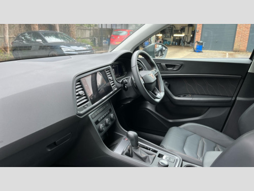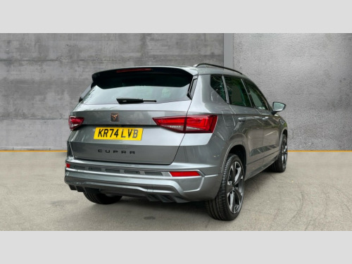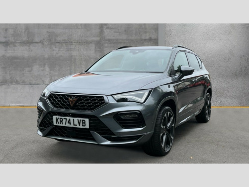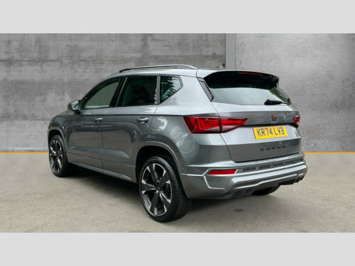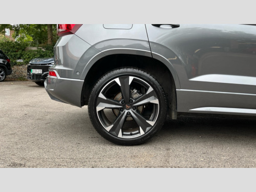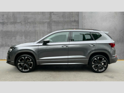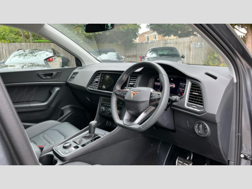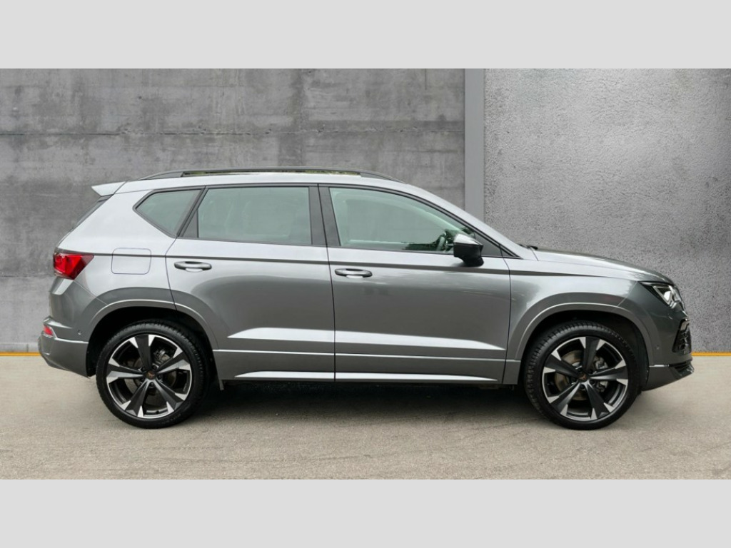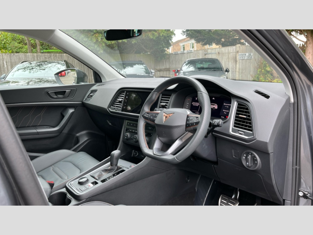 Cupra Ateca 1.5 EcoTSI V2 5dr DSG Cruise control system with speed limiter, Digital cockpit, Driving profile selection and conventional shock absorber, E-call, Electric tailgate with virtual pedal, Outside temperature gauge, Progressive power assisted steering, Rear view camera, Self parking functionality (includes front and rear parking sensors), Trip computer, wired and wireless full link smartphone integration, Wireless phone charger, Front and rear shock absorption, chassis with increased ride height, Steering wheel mounted audio/phone controls, Body colour bumpers with dark aluminium diffusor, Body coloured wheel arch surrounds, Dark tinted rear windows, Daytime running lights, Door mirrors with welcome CUPRA light silhouette, Dynamic headlight range control with self adjusting whilst driving, Electric adjustable/heated/folding door mirrors, Front and rear electric windows, Front grille frame in chrome, Full LED headlamps with lens and LED front fog lamps with cornering function, Gloss black door mirrors, Gloss black roof rails, Gloss black side mouldings, Gloss black side window trim, Illuminated aluminium front door sill, LED rear tail lights with dynamic indicators, Rear fog lights, Rear side wing doors, Rear spoiler, Rear wash/wipe, Specific CUPRA design front bumper, Standard rear exhaust tailpipes, Third brake light, 12v socket in front, 3 seat bench in 2nd row, 60/40 split folding rear seat, Aluminium pedals, Cupra steering wheel emblem, Dual zone climate control, Electric driver seat with memory function, Front and rear head restraints, Front centre armrest, Front seat back storage pockets, Grey roof lining, Heated front seats, Heated steering wheel, Height adjustable driver and passenger seat with lumbar adjustment, ISOFIX points in outer rear seats with top tether anchorage points, Leather sport bucket seats, Leather steering wheel and gear knob, Multicoloured ambient lighting with LED interior illumination, Pedal cluster, Rear armrest and easy back seat release mechanism from boot, Single front passenger seat, Sports steering wheel, Steering wheel mounted gearshift paddles, Storage compartment in roof console for sunglass, Storage compartment under driver's seat, Convenience pack - Ateca, Interior lighting pack - Ateca, Navigation system plus pack with DAB - Ateca, Safety and driving pack - Ateca, 3x3 point rear seatbelts, ABS, Traction control system (TCS), Electronic stability control (ESC) and Electronic differential lock system (XDS), Airbags - Driver and front passenger airbag with deactivation, front side, two curtain and driver's knee airbags, Black brake callipers with CUPRA logo, Electric parking brake with auto hold function, Front and rear seatbelt reminder, Front assist with autonomous emergency braking, Hill hold control, Manual rear child locks, Single tone horn, Tiredness recognition system, Tyre pressure monitoring system, Alarm, Keyless entry, Locking wheel bolts, 19" Sport machined alloy wheels 36/3 in black/silver