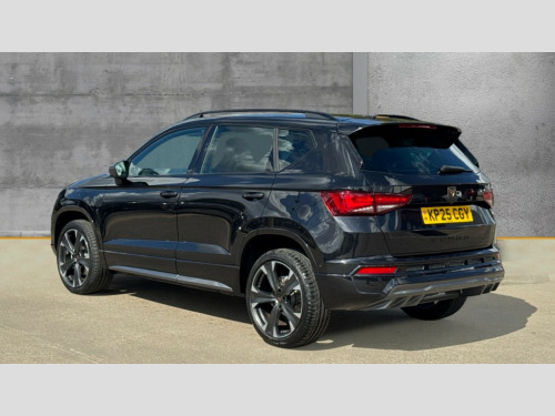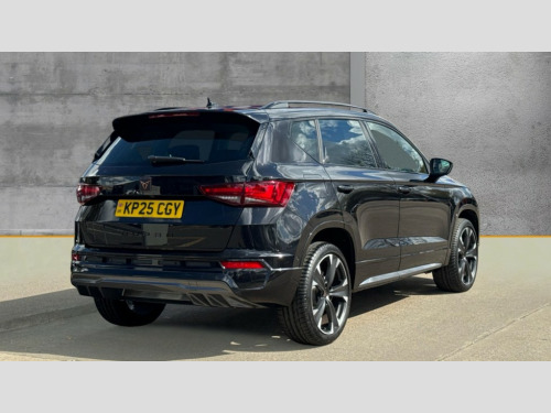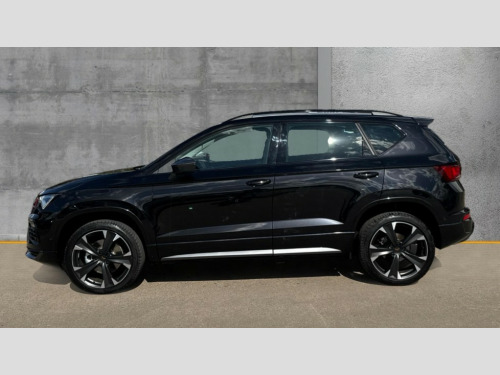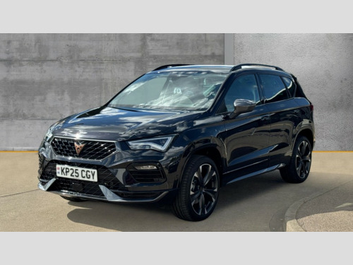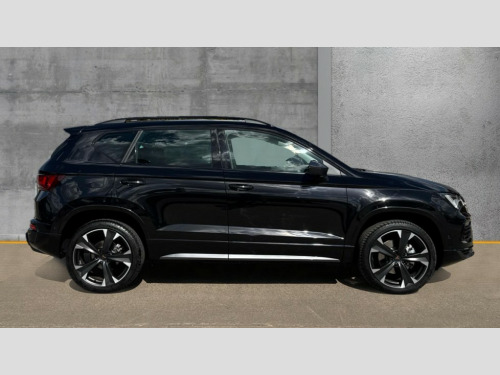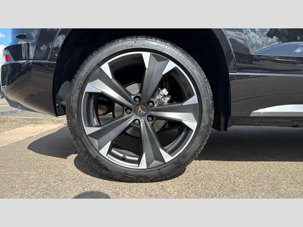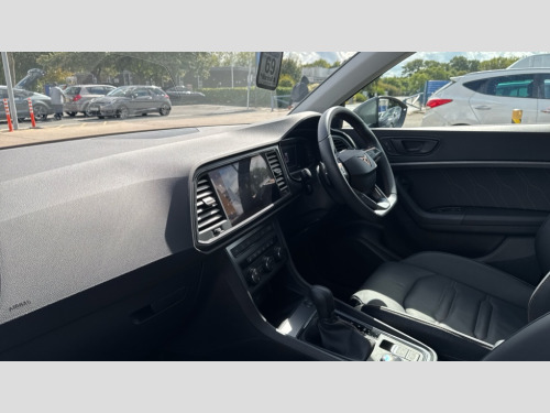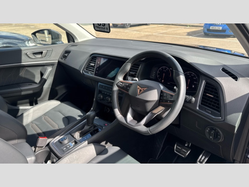 Cupra Ateca 1.5 EcoTSI V2 5dr DSG Cruise control system with speed limiter, Digital cockpit, Driving profile selection and conventional shock absorber, E-call, Electric tailgate with virtual pedal, Outside temperature gauge, Progressive power assisted steering, Rear view camera, Self parking functionality (includes front and rear parking sensors), Trip computer, wired and wireless full link smartphone integration, Wireless phone charger, Front and rear shock absorption, chassis with increased ride height, Steering wheel mounted audio/phone controls, Body colour bumpers with dark aluminium diffusor, Body coloured wheel arch surrounds, Dark tinted rear windows, Daytime running lights, Door mirrors with welcome CUPRA light silhouette, Dynamic headlight range control with self adjusting whilst driving, Electric adjustable/heated/folding door mirrors, Front and rear electric windows, Front grille frame in chrome, Full LED headlamps with lens and LED front fog lamps with cornering function, Gloss black door mirrors, Gloss black roof rails, Gloss black side mouldings, Gloss black side window trim, Illuminated aluminium front door sill, LED rear tail lights with dynamic indicators, Rear fog lights, Rear side wing doors, Rear spoiler, Rear wash/wipe, Specific CUPRA design front bumper, Standard rear exhaust tailpipes, Third brake light, 12v socket in front, 3 seat bench in 2nd row, 60/40 split folding rear seat, Aluminium pedals, Cupra steering wheel emblem, Dual zone climate control, Electric driver seat with memory function, Front and rear head restraints, Front centre armrest, Front seat back storage pockets, Grey roof lining, Heated front seats, Heated steering wheel, Height adjustable driver and passenger seat with lumbar adjustment, ISOFIX points in outer rear seats with top tether anchorage points, Leather sport bucket seats, Leather steering wheel and gear knob, Multicoloured ambient lighting with LED interior illumination, Pedal cluster, Rear armrest and easy back seat release mechanism from boot, Single front passenger seat, Sports steering wheel, Steering wheel mounted gearshift paddles, Storage compartment in roof console for sunglass, Storage compartment under driver's seat, Convenience pack - Ateca, Interior lighting pack - Ateca, Navigation system plus pack with DAB - Ateca, Safety and driving pack - Ateca, 3x3 point rear seatbelts, ABS, Traction control system (TCS), Electronic stability control (ESC) and Electronic differential lock system (XDS), Airbags - Driver and front passenger airbag with deactivation, front side, two curtain and driver's knee airbags, Black brake callipers with CUPRA logo, Electric parking brake with auto hold function, Front and rear seatbelt reminder, Front assist with autonomous emergency braking, Hill hold control, Manual rear child locks, Single tone horn, Tiredness recognition system, Tyre pressure monitoring system, Alarm, Keyless entry, Locking wheel bolts, 19" Sport machined alloy wheels 36/3 in black/silver