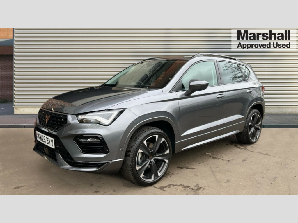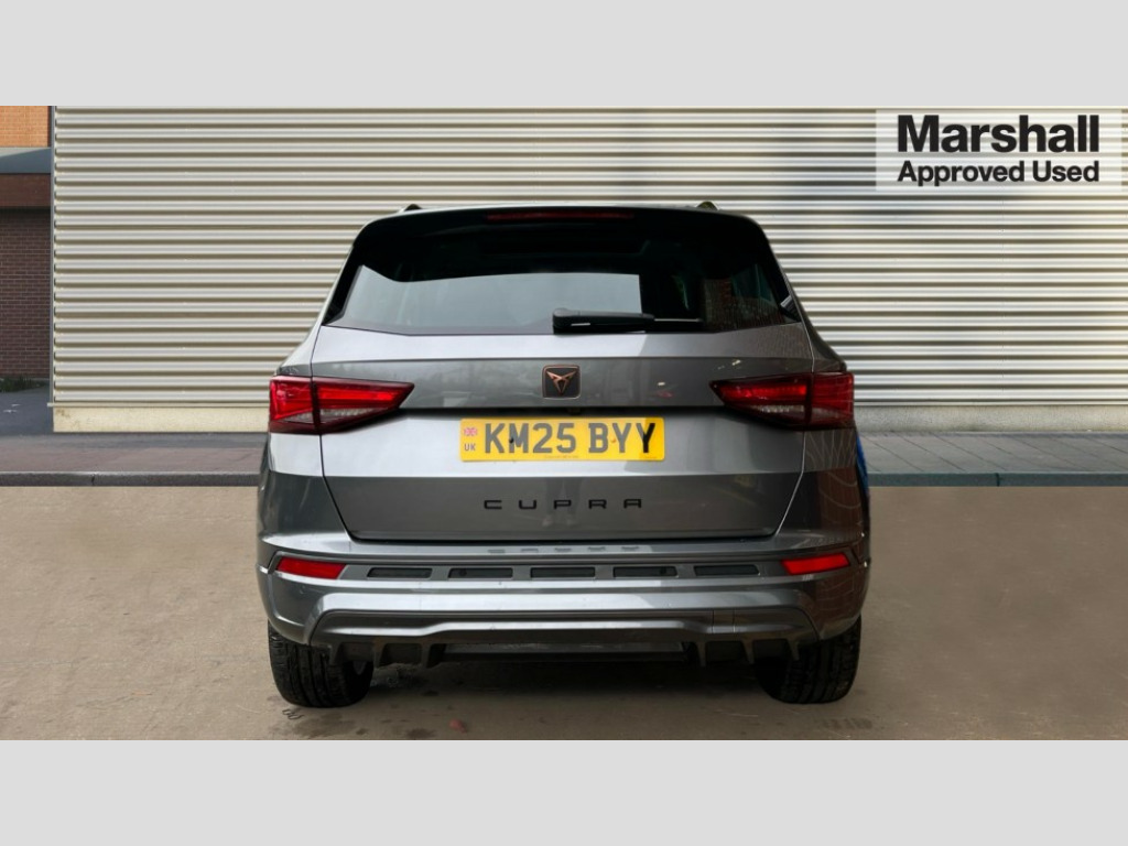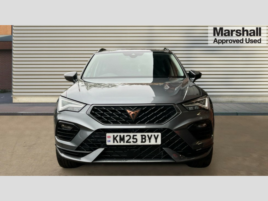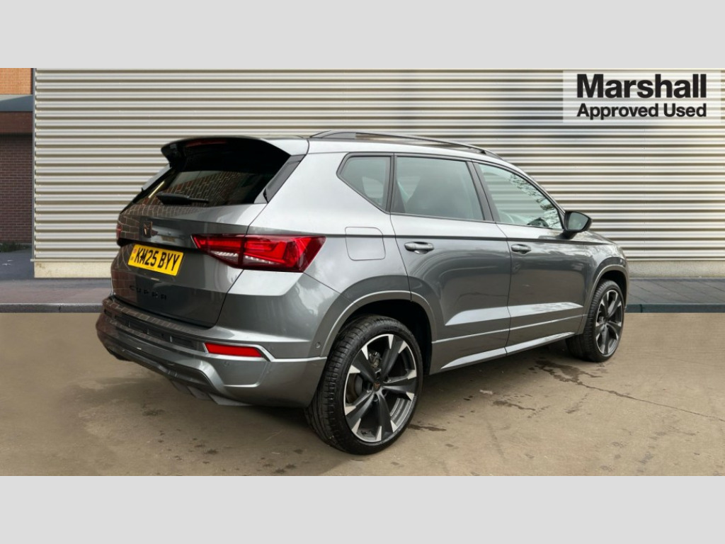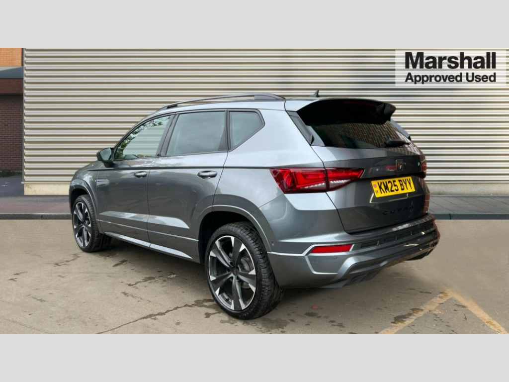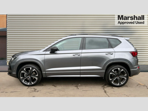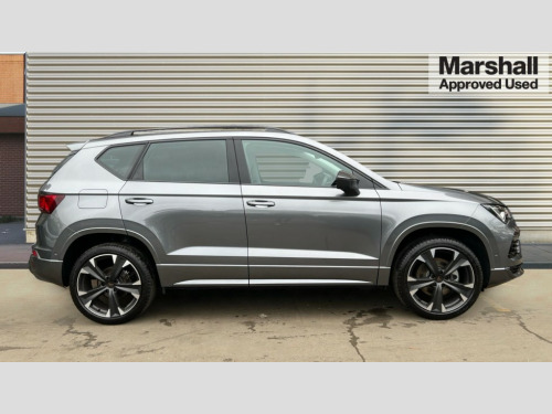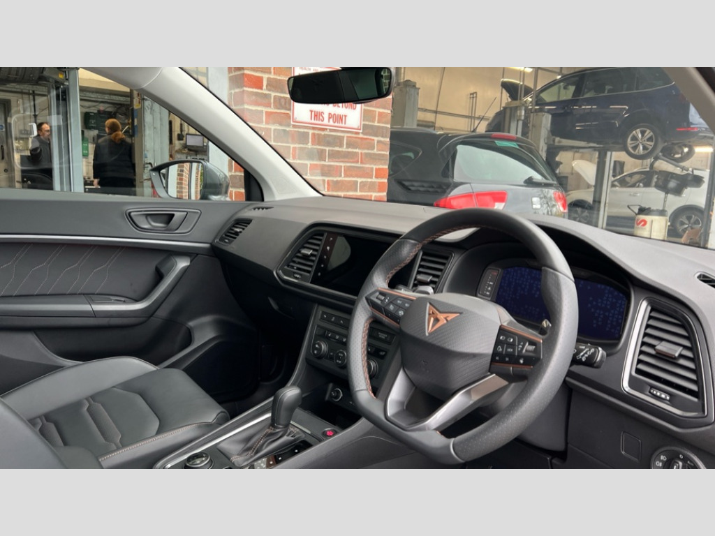 Cupra Ateca 1.5 EcoTSI V2 5dr DSG Cruise control system with speed limiter, Digital cockpit, Driving profile selection and conventional shock absorber, E-call, Electric tailgate with virtual pedal, Outside temperature gauge, Progressive power assisted steering, Rear view camera, Self parking functionality (includes front and rear parking sensors), Trip computer, wired and wireless full link smartphone integration, Wireless phone charger, Front and rear shock absorption, chassis with increased ride height, Steering wheel mounted audio/phone controls, Body colour bumpers with dark aluminium diffusor, Body coloured wheel arch surrounds, Dark tinted rear windows, Daytime running lights, Door mirrors with welcome CUPRA light silhouette, Dynamic headlight range control with self adjusting whilst driving, Electric adjustable/heated/folding door mirrors, Front and rear electric windows, Front grille frame in chrome, Full LED headlamps with lens and LED front fog lamps with cornering function, Gloss black door mirrors, Gloss black roof rails, Gloss black side mouldings, Gloss black side window trim, Illuminated aluminium front door sill, LED rear tail lights with dynamic indicators, Rear fog lights, Rear side wing doors, Rear spoiler, Rear wash/wipe, Specific CUPRA design front bumper, Standard rear exhaust tailpipes, Third brake light, 12v socket in front, 3 seat bench in 2nd row, 60/40 split folding rear seat, Aluminium pedals, Cupra steering wheel emblem, Dual zone climate control, Electric driver seat with memory function, Front and rear head restraints, Front centre armrest, Front seat back storage pockets, Grey roof lining, Heated front seats, Heated steering wheel, Height adjustable driver and passenger seat with lumbar adjustment, ISOFIX points in outer rear seats with top tether anchorage points, Leather sport bucket seats, Leather steering wheel and gear knob, Multicoloured ambient lighting with LED interior illumination, Pedal cluster, Rear armrest and easy back seat release mechanism from boot, Single front passenger seat, Sports steering wheel, Steering wheel mounted gearshift paddles, Storage compartment in roof console for sunglass, Storage compartment under driver's seat, Convenience pack - Ateca, Interior lighting pack - Ateca, Navigation system plus pack with DAB - Ateca, Safety and driving pack - Ateca, 3x3 point rear seatbelts, ABS, Traction control system (TCS), Electronic stability control (ESC) and Electronic differential lock system (XDS), Airbags - Driver and front passenger airbag with deactivation, front side, two curtain and driver's knee airbags, Black brake callipers with CUPRA logo, Electric parking brake with auto hold function, Front and rear seatbelt reminder, Front assist with autonomous emergency braking, Hill hold control, Manual rear child locks, Single tone horn, Tiredness recognition system, Tyre pressure monitoring system, Alarm, Keyless entry, Locking wheel bolts, 19" Sport machined alloy wheels 36/3 in black/silver