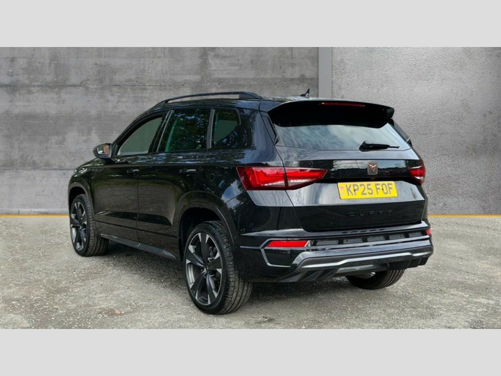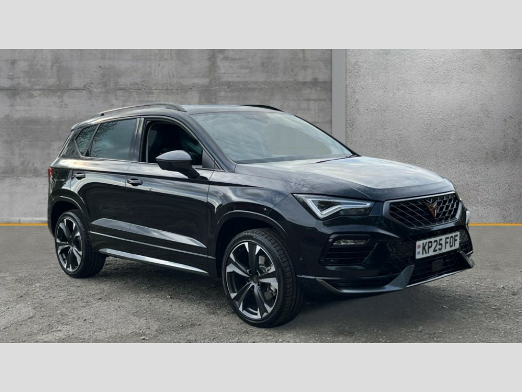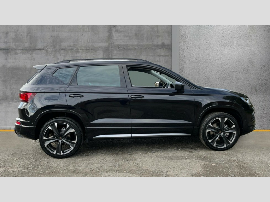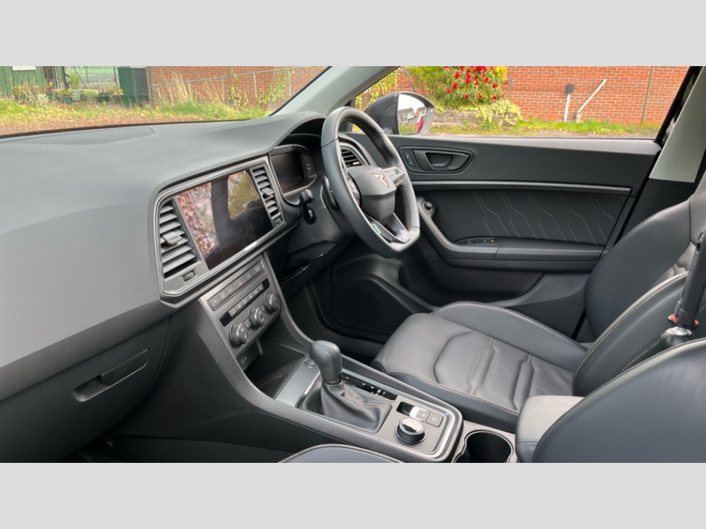 Cupra Ateca 1.5 EcoTSI V2 5dr DSG Cruise control system with speed limiter, Digital cockpit, Driving profile selection and conventional shock absorber, E-call, Electric tailgate with virtual pedal, Outside temperature gauge, Progressive power assisted steering, Rear view camera, Self parking functionality (includes front and rear parking sensors), Trip computer, wired and wireless full link smartphone integration, Wireless phone charger, Front and rear shock absorption, chassis with increased ride height, Steering wheel mounted audio/phone controls, Body colour bumpers with dark aluminium diffusor, Body coloured wheel arch surrounds, Dark tinted rear windows, Daytime running lights, Door mirrors with welcome CUPRA light silhouette, Dynamic headlight range control with self adjusting whilst driving, Electric adjustable/heated/folding door mirrors, Front and rear electric windows, Front grille frame in chrome, Full LED headlamps with lens and LED front fog lamps with cornering function, Gloss black door mirrors, Gloss black roof rails, Gloss black side mouldings, Gloss black side window trim, Illuminated aluminium front door sill, LED rear tail lights with dynamic indicators, Rear fog lights, Rear side wing doors, Rear spoiler, Rear wash/wipe, Specific CUPRA design front bumper, Standard rear exhaust tailpipes, Third brake light, 12V socket in front, 3 seat bench in 2nd row, 60/40 split folding rear seat, Aluminium pedals, Cupra steering wheel emblem, Dual zone climate control, Electric driver seat with memory function, Front and rear head restraints, Front centre armrest, Front seat back storage pockets, Grey roof lining, Heated front seats, Heated steering wheel, Height adjustable driver and passenger seat with lumbar adjustment, ISOFIX points in outer rear seats with top tether anchorage points, Leather sport bucket seats, Leather steering wheel and gear knob, Multicoloured ambient lighting with LED interior illumination, Pedal cluster, Rear armrest and easy back seat release mechanism from boot, Single front passenger seat, Sports steering wheel, Steering wheel mounted gearshift paddles, Storage compartment in roof console for sunglass, Storage compartment under driver's seat, Convenience pack - Ateca, Interior lighting pack - Ateca, Navigation system plus pack with DAB - Ateca, Safety and driving pack - Ateca, 3x3 point rear seatbelts, ABS, Traction control system (TCS), Electronic stability control (ESC) and Electronic differential lock system (XDS), Airbags - Driver and front passenger airbag with deactivation, front side, two curtain and driver's knee airbags, Black brake callipers with CUPRA logo, Electric parking brake with auto hold function, Front and rear seatbelt reminder, Front assist with autonomous emergency braking, Hill hold control, Manual rear child locks, Single tone horn, Tiredness recognition system, Tyre pressure monitoring system, Alarm, Keyless entry, Locking wheel bolts, 19" Sport machined alloy wheels 36/3 in black/silver