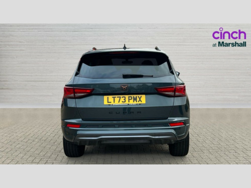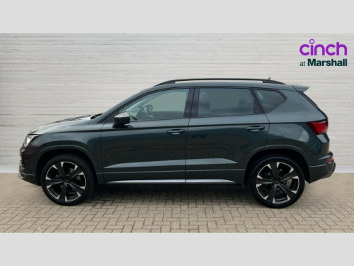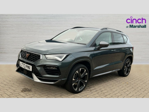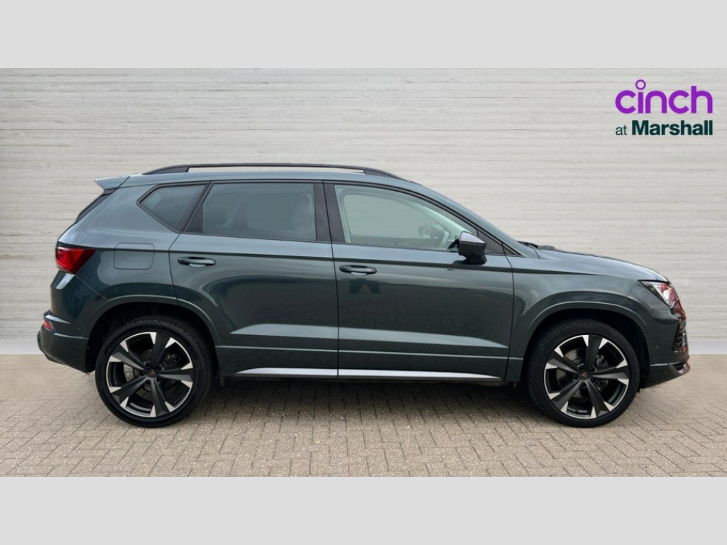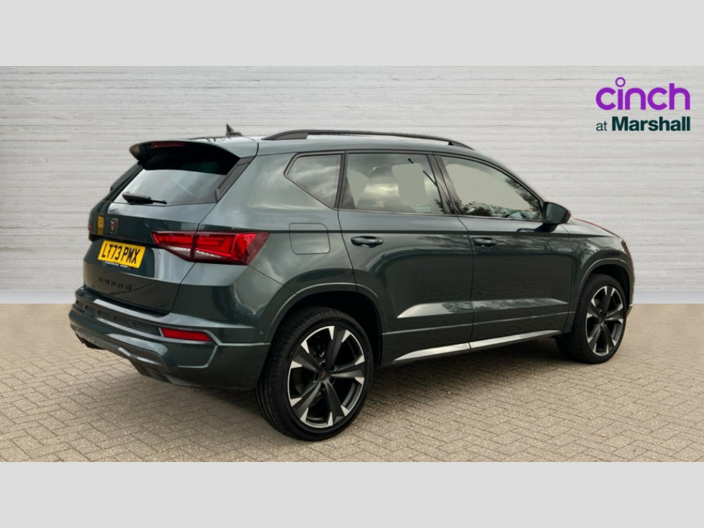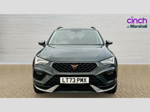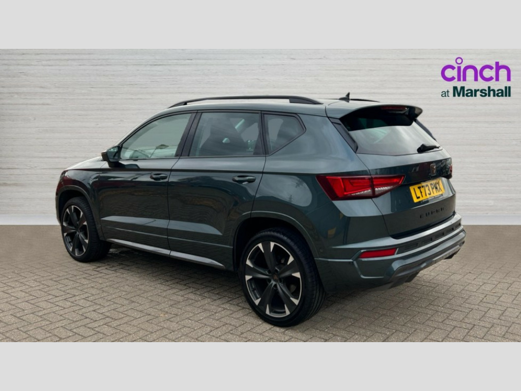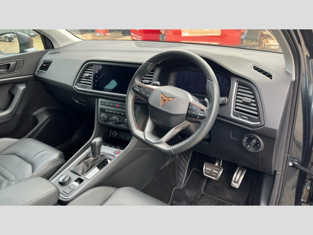 Cupra Ateca 1.5 EcoTSI V2 5dr DSG Cruise control system with speed limiter, Digital cockpit, Driving profile selection and conventional shock absorber, E-call, Electric tailgate with virtual pedal, Outside temperature gauge, Progressive power assisted steering, Rear view camera, Self parking functionality (includes front and rear parking sensors), Trip computer, Wireless full link smartphone integration, Wireless phone charger, Front and rear shock absorption, chassis with increased ride height, Steering wheel mounted audio/phone controls, Body colour bumpers with dark aluminium diffusor, Body coloured wheel arch surrounds, Dark tinted rear windows, Daytime running lights, Door mirrors with welcome CUPRA light silhouette, Dynamic headlight range control with self adjusting whilst driving, Electric adjustable/heated/folding door mirrors, Front and rear electric windows, Front grille frame in chrome, Full LED headlamps with lens and LED front fog lamps with cornering function, Gloss black door mirrors, Gloss black roof rails, Gloss black side mouldings, Gloss black side window trim, Illuminated aluminium front door sill, LED rear tail lights with dynamic indicators, Rear fog lights, Rear side wing doors, Rear spoiler, Rear wash/wipe, Specific CUPRA design front bumper, Standard rear exhaust tailpipes, Third brake light, 12V socket in front, 3 seat bench in 2nd row, 60/40 split folding rear seat, Aluminium pedals, Cupra steering wheel emblem, Dual zone climate control, Electric driver seat with memory function, Front and rear head restraints, Front centre armrest, Front seat back storage pockets, Grey roof lining, Heated steering wheel, Height adjustable driver and passenger seat with lumbar adjustment, ISOFIX points in outer rear seats with top tether anchorage points, Leather sport bucket seats, Leather steering wheel and gear knob, Multicoloured ambient lighting with LED interior illumination, Pedal cluster, Rear armrest and easy back seat release mechanism from boot, Single front passenger seat, Sports steering wheel, Steering wheel mounted gearshift paddles, Storage compartment in roof console for sunglass, Storage compartment under driver's seat, Convenience pack - Ateca, Interior lighting pack - Ateca, Navigation system plus pack with DAB - Ateca, 3x3 point rear seatbelts, ABS, Traction control system (TCS), Electronic stability control (ESC) and Electronic differential lock system (XDS), Airbags - Driver and front passenger airbag with deactivation, front side, two curtain and driver's knee airbags, Black brake callipers with CUPRA logo, Electric parking brake with auto hold function, Front and rear seatbelt reminder, Front assist with autonomous emergency braking, Hill hold control, Manual rear child locks, Single tone horn, Tiredness recognition system, Tyre pressure monitoring system, Alarm, Keyless entry, Locking wheel bolts, 19" Sport machined alloy wheels 36/3 in black/silver