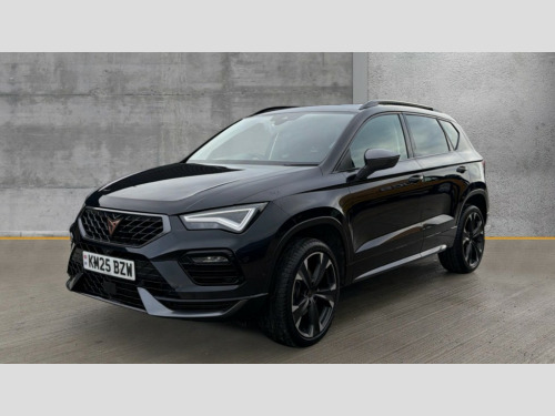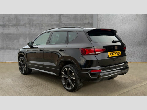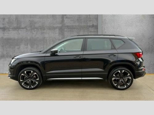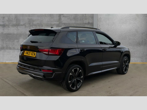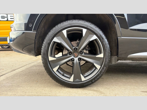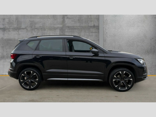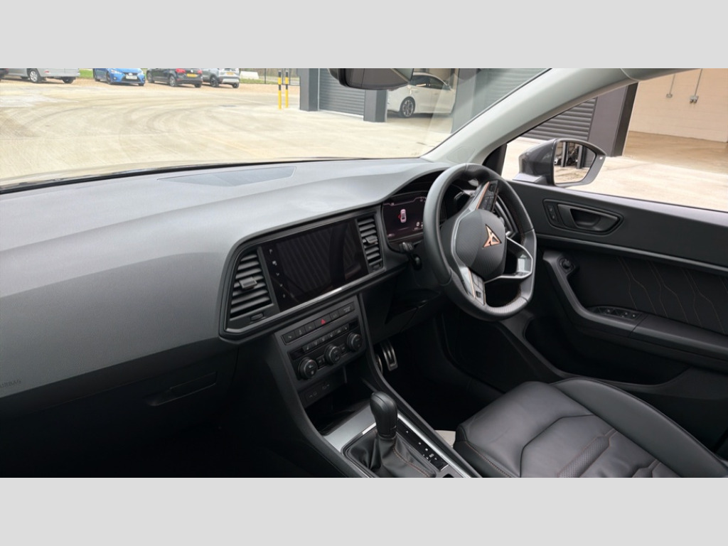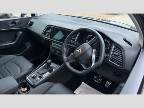 Cupra Ateca 1.5 EcoTSI V2 5dr DSG Cruise control system with speed limiter, Digital cockpit, Driving profile selection and conventional shock absorber, E-call, Electric tailgate with virtual pedal, Outside temperature gauge, Progressive power assisted steering, Rear view camera, Self parking functionality (includes front and rear parking sensors), Trip computer, wired and wireless full link smartphone integration, Wireless phone charger, Front and rear shock absorption, chassis with increased ride height, Steering wheel mounted audio/phone controls, Body colour bumpers with dark aluminium diffusor, Body coloured wheel arch surrounds, Dark tinted rear windows, Daytime running lights, Door mirrors with welcome CUPRA light silhouette, Dynamic headlight range control with self adjusting whilst driving, Electric adjustable/heated/folding door mirrors, Front and rear electric windows, Front grille frame in chrome, Full LED headlamps with lens and LED front fog lamps with cornering function, Gloss black door mirrors, Gloss black roof rails, Gloss black side mouldings, Gloss black side window trim, Illuminated aluminium front door sill, LED rear tail lights with dynamic indicators, Rear fog lights, Rear side wing doors, Rear spoiler, Rear wash/wipe, Specific CUPRA design front bumper, Standard rear exhaust tailpipes, Third brake light, 12V socket in front, 3 seat bench in 2nd row, 60/40 split folding rear seat, Aluminium pedals, Cupra steering wheel emblem, Dual zone climate control, Electric driver seat with memory function, Front and rear head restraints, Front centre armrest, Front seat back storage pockets, Grey roof lining, Heated front seats, Heated steering wheel, Height adjustable driver and passenger seat with lumbar adjustment, ISOFIX points in outer rear seats with top tether anchorage points, Leather sport bucket seats, Leather steering wheel and gear knob, Multicoloured ambient lighting with LED interior illumination, Pedal cluster, Rear armrest and easy back seat release mechanism from boot, Single front passenger seat, Sports steering wheel, Steering wheel mounted gearshift paddles, Storage compartment in roof console for sunglass, Storage compartment under driver's seat, Convenience pack - Ateca, Interior lighting pack - Ateca, Navigation system plus pack with DAB - Ateca, Safety and driving pack - Ateca, 3x3 point rear seatbelts, ABS, Traction control system (TCS), Electronic stability control (ESC) and Electronic differential lock system (XDS), Airbags - Driver and front passenger airbag with deactivation, front side, two curtain and driver's knee airbags, Black brake callipers with CUPRA logo, Electric parking brake with auto hold function, Front and rear seatbelt reminder, Front assist with autonomous emergency braking, Hill hold control, Manual rear child locks, Single tone horn, Tiredness recognition system, Tyre pressure monitoring system, Alarm, Keyless entry, Locking wheel bolts, 19" Sport machined alloy wheels 36/3 in black/silver