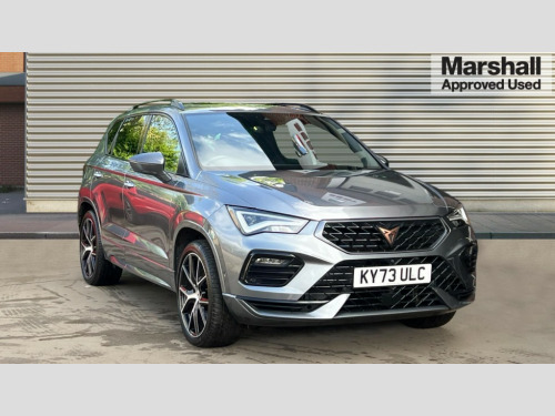 Cupra Ateca 2.0 TSI VZ2 5dr DSG 4Drive CUPRA drive profile -Normal, Sport, CUPRA and Individual modes, steering/throttle response, gearshift mode, sound actuator and dynamic chassis control, Digital cockpit, E-call, Electric tailgate with virtual pedal, Front and rear view camera, Outside temperature gauge, Progressive power assisted steering, Self parking functionality (includes front and rear parking sensors), Top view camera, Trip computer, Wireless full link smartphone integration, Wireless phone charger, CUPRA sport suspension, Steering wheel mounted audio/phone controls, Body colour bumpers with dark aluminium diffusor, Body coloured wheel arch surrounds, Dark tinted rear windows, Daytime running lights, Door mirrors with welcome CUPRA light silhouette, Dynamic headlight range control with self adjusting whilst driving, Electric adjustable/heated/folding door mirrors, Front and rear electric windows, Front grille frame in chrome, Full LED headlamps with lens and LED front fog lamps with cornering function, Gloss black door mirrors, Gloss black roof rails, Gloss black side mouldings, Gloss black side window trim, Illuminated aluminium front door sill, LED rear tail lights with dynamic indicators, Rear fog lights, Rear side wing doors, Rear spoiler, Rear wash/wipe, Specific CUPRA design front bumper, Third brake light, Visible twin black exhaust pipes in both sides with dark aluminium diffuser, 12v socket in front, 3 seat bench in 2nd row, 60/40 split folding rear seat, Aluminium pedals, Black roof lining, Cupra steering wheel emblem, Dual zone climate control, Electric driver seat with memory function, Front and rear head restraints, Front centre armrest, Front seat back storage pockets, Heated front seats, Heated steering wheel, Height adjustable driver and passenger seat with lumbar adjustment, ISOFIX points in outer rear seats with top tether anchorage points, Leather sport bucket seats, Leather steering wheel and gear knob, Multicoloured ambient lighting with LED interior illumination, Pedal cluster, Rear armrest and easy back seat release mechanism from boot, Single front passenger seat, Sports steering wheel, Steering wheel mounted gearshift paddles, Storage compartment in roof console for sunglass, Storage compartment under driver's seat, Convenience pack - Ateca, Interior lighting pack - Ateca, Navigation system plus pack with DAB - Ateca, Safe and driving pack with High beam control - Ateca, 3x3 point rear seatbelts, ABS, Traction control system (TCS), Electronic stability control (ESC) and Electronic differential lock system (XDS), Airbags - Driver and front passenger airbag with deactivation, front side, two curtain and driver's knee airbags, Black brake callipers with CUPRA logo, Electric parking brake with auto hold function, Front and rear seatbelt reminder, Front assist with autonomous emergency braking, Hill hold control, Manual rear child locks, Single tone horn, Tiredness recognition system, Tyre pressure monitoring system, Alarm, Keyless entry, Locking wheel bolts