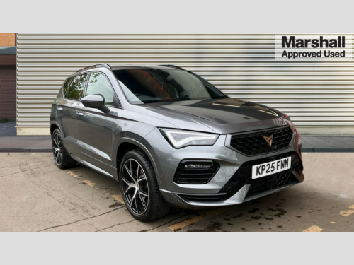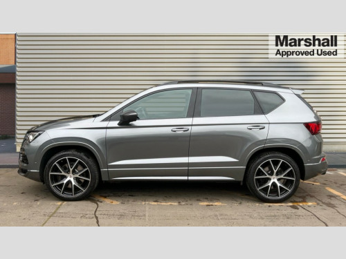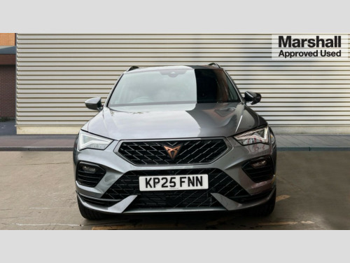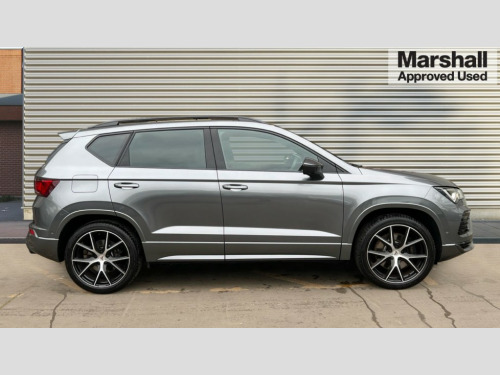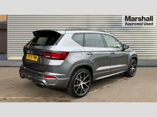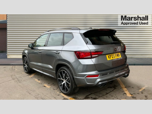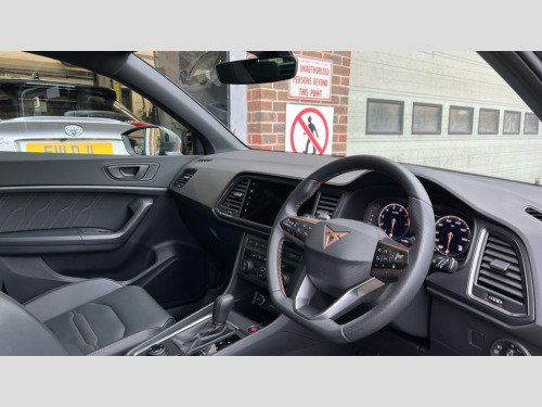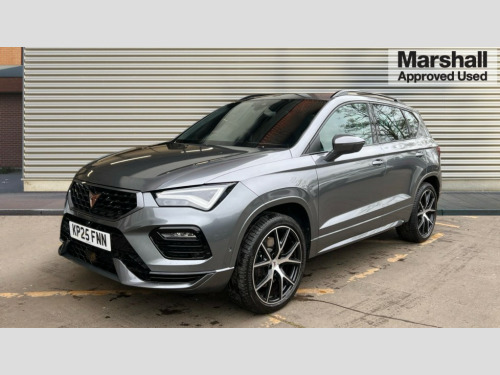 Cupra Ateca 2.0 TSI VZ2 5dr DSG 4Drive CUPRA drive profile - Normal, sport, CUPRA and individual modes and Hydraulic damper control (DCC), Digital cockpit, E-call, Electric tailgate with virtual pedal, Front and rear view camera, Outside temperature gauge, Progressive power assisted steering, Self parking functionality (includes front and rear parking sensors), Top view camera, Trip computer, wired and wireless full link smartphone integration, Wireless phone charger, CUPRA sport suspension, Steering wheel mounted audio/phone controls, Body colour bumpers with dark aluminium diffusor, Body coloured wheel arch surrounds, Dark tinted rear windows, Daytime running lights, Door mirrors with welcome CUPRA light silhouette, Dynamic headlight range control with self adjusting whilst driving, Electric adjustable/heated/folding door mirrors, Front and rear electric windows, Front grille frame in chrome, Full LED headlamps with lens and LED front fog lamps with cornering function, Gloss black door mirrors, Gloss black roof rails, Gloss black side mouldings, Gloss black side window trim, Illuminated aluminium front door sill, LED rear tail lights with dynamic indicators, Rear fog lights, Rear side wing doors, Rear spoiler, Rear wash/wipe, Specific CUPRA design front bumper, Third brake light, Visible twin black exhaust pipes in both sides, 12v socket in front, 3 seat bench in 2nd row, 60/40 split folding rear seat, Aluminium pedals, Black roof lining, Cupra steering wheel emblem, Dual zone climate control, Electric driver seat with memory function, Front and rear head restraints, Front centre armrest, Front seat back storage pockets, Heated front seats, Heated steering wheel, Height adjustable driver and passenger seat with lumbar adjustment, ISOFIX points in outer rear seats with top tether anchorage points, Leather sport bucket seats, Leather steering wheel and gear knob, Multicoloured ambient lighting with LED interior illumination, Pedal cluster, Rear armrest and easy back seat release mechanism from boot, Single front passenger seat, Sports steering wheel, Steering wheel mounted gearshift paddles, Storage compartment in roof console for sunglass, Storage compartment under driver's seat, Convenience pack - Ateca, Interior lighting pack - Ateca, Navigation system plus pack with DAB - Ateca, Safe and driving pack with High beam control - Ateca, 3x3 point rear seatbelts, ABS, Traction control system (TCS), Electronic stability control (ESC) and Electronic differential lock system (XDS), Airbags - Driver and front passenger airbag with deactivation, front side, two curtain and driver's knee airbags, Attention and drowsiness assist, Black brake callipers with CUPRA logo, Electric parking brake with auto hold function, Front and rear seatbelt reminder, Hill hold control, Manual rear child locks, Single tone horn, Tiredness recognition system, Tyre pressure monitoring system, Tyre pressure warning light, Alarm, Keyless entry, Locking wheel bolts