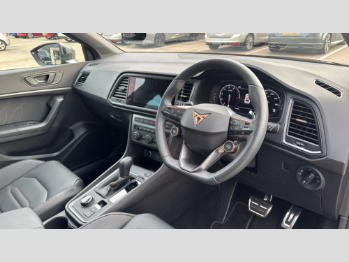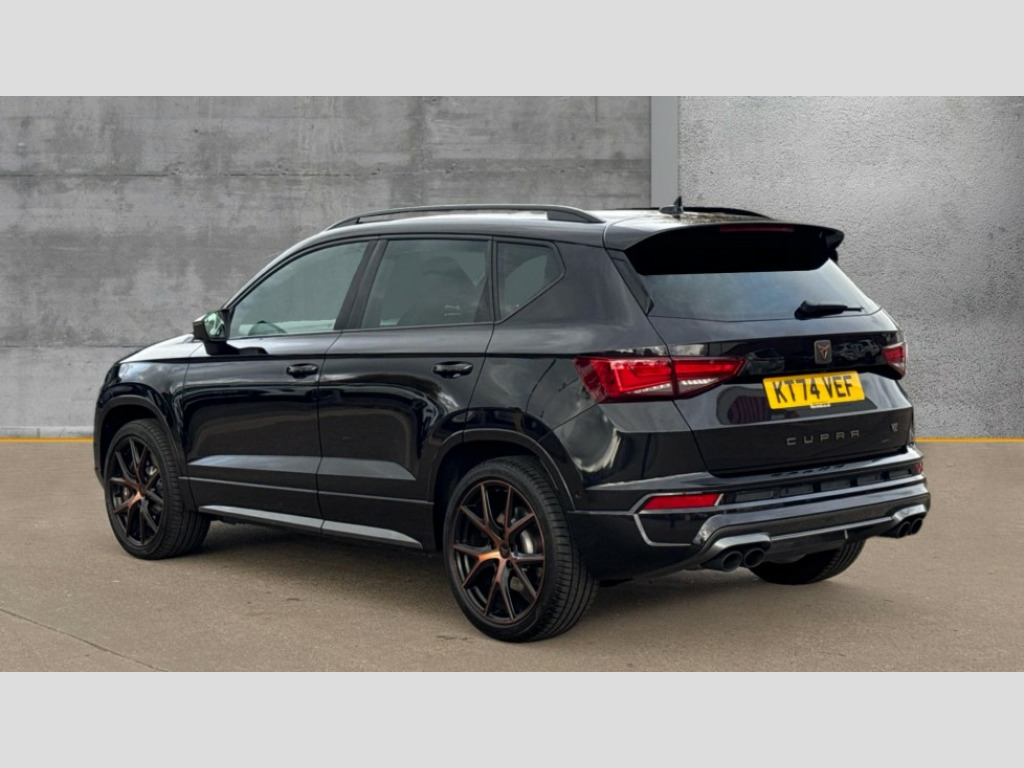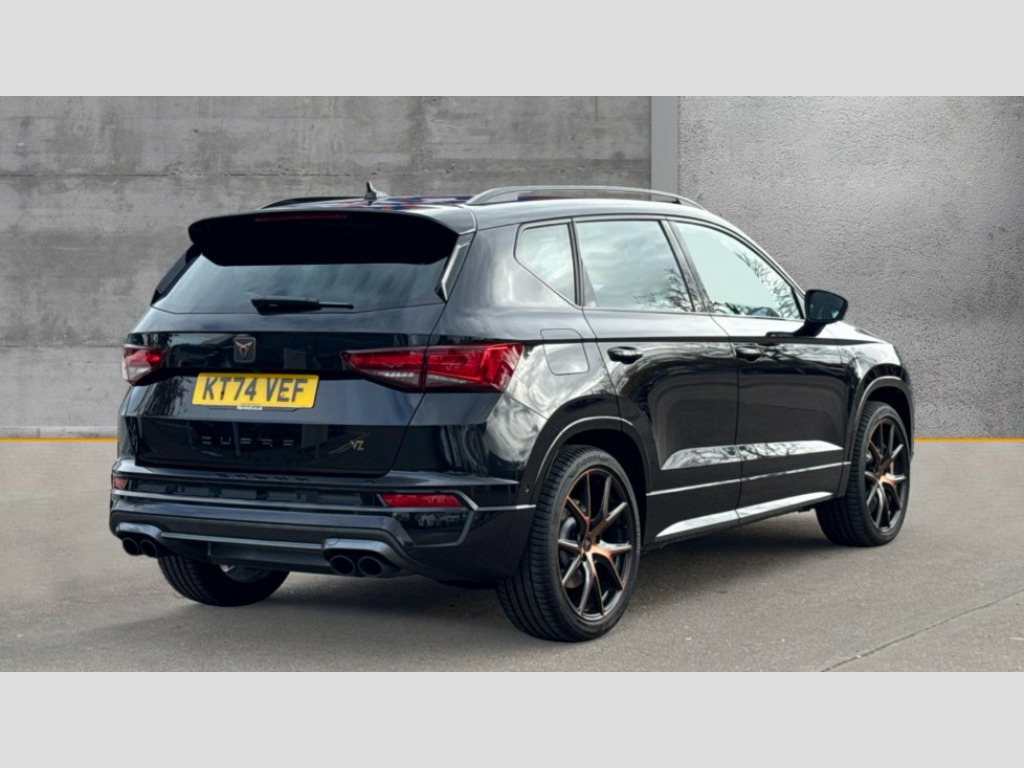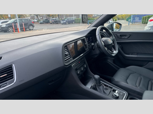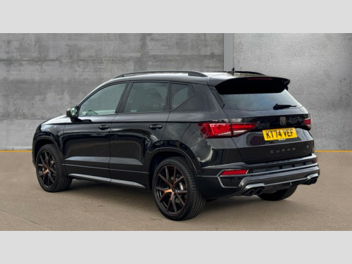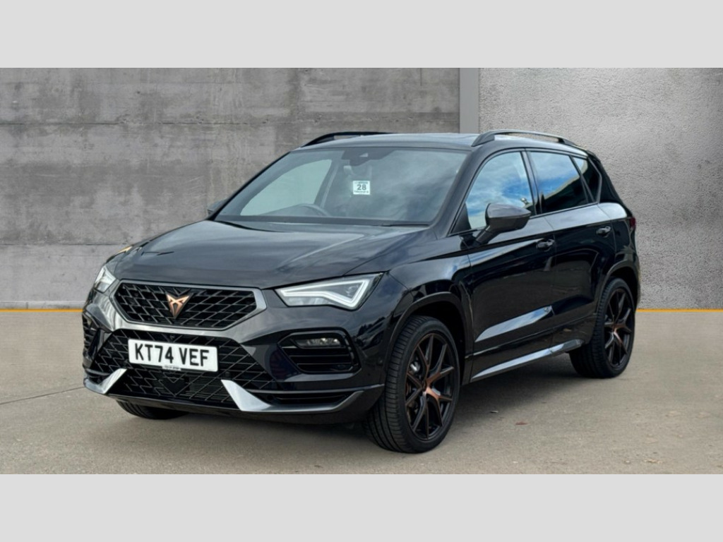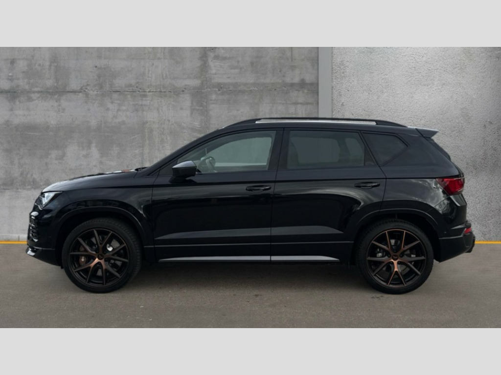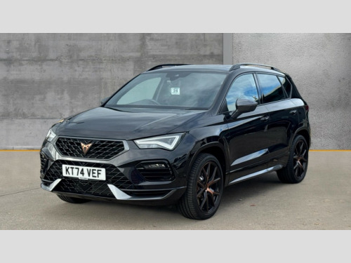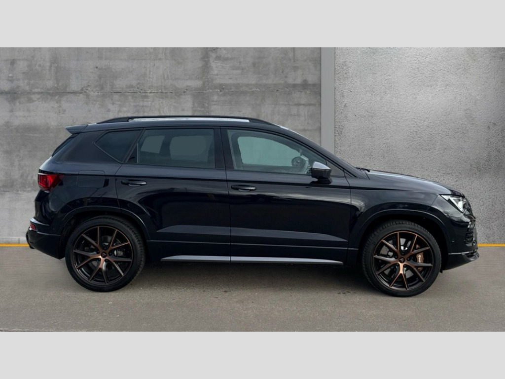 Cupra Ateca 2.0 TSI VZ3 5dr DSG 4Drive CUPRA drive profile - Normal, sport, CUPRA and individual modes and Hydraulic damper control (DCC), Digital cockpit, E-call, Electric tailgate with virtual pedal, Front and rear view camera, Outside temperature gauge, Progressive power assisted steering, Self parking functionality (includes front and rear parking sensors), Top view camera, Trip computer, wired and wireless full link smartphone integration, Wireless phone charger, CUPRA sport suspension, Steering wheel mounted audio/phone controls, Body colour bumpers with dark aluminium diffusor, Body coloured wheel arch surrounds, Dark tinted rear windows, Daytime running lights, Door mirrors with welcome CUPRA light silhouette, Dynamic headlight range control with self adjusting whilst driving, Electric adjustable/heated/folding door mirrors, Front and rear electric windows, Front grille frame in chrome, Full LED headlamps with lens and LED front fog lamps with cornering function, Gloss black door mirrors, Gloss black roof rails, Gloss black side mouldings, Gloss black side window trim, Illuminated aluminium front door sill, LED rear tail lights with dynamic indicators, Rear fog lights, Rear side wing doors, Rear spoiler, Rear wash/wipe, Specific CUPRA design front bumper, Third brake light, Visible twin black exhaust pipes in both sides, 12v socket in front, 3 seat bench in 2nd row, 60/40 split folding rear seat, Aluminium pedals, Black roof lining, Cupra steering wheel emblem, CUPRA supersports steering wheel including satellite buttons, Dual zone climate control, Electric driver seat with memory function, Front and rear head restraints, Front centre armrest, Front seat back storage pockets, Heated front seats, Heated steering wheel, Height adjustable driver and passenger seat with lumbar adjustment, ISOFIX points in outer rear seats with top tether anchorage points, Leather sport bucket seats, Multicoloured ambient lighting with LED interior illumination, Pedal cluster, Rear armrest and easy back seat release mechanism from boot, Single front passenger seat, Storage compartment in roof console for sunglass, Storage compartment under driver's seat, Convenience pack - Ateca, Interior lighting pack - Ateca, Navigation system plus pack with DAB - Ateca, Safe and driving pack with High beam control - Ateca, 3x3 point rear seatbelts, ABS, Traction control system (TCS), Electronic stability control (ESC) and Electronic differential lock system (XDS), Airbags - Driver and front passenger airbag with deactivation, front side, two curtain and driver's knee airbags, Attention and drowsiness assist, Black brake callipers with CUPRA logo, Electric parking brake with auto hold function, Front and rear seatbelt reminder, Hill hold control, Manual rear child locks, Performance brakes with front brembo calipers, Single tone horn, Tiredness recognition system, Tyre pressure monitoring system, Tyre pressure warning light, Alarm, Keyless entry, Locking wheel bolts, 19" Copper alloy wheels, Tyre repair kit