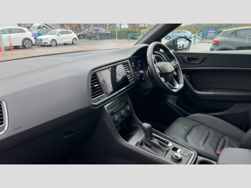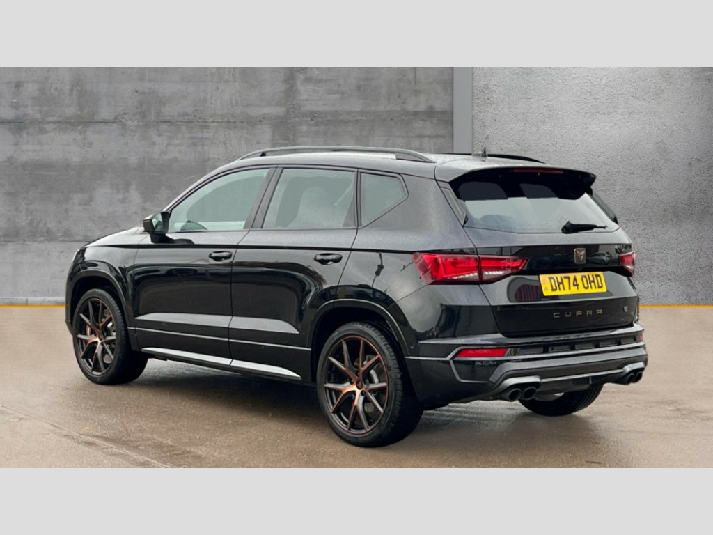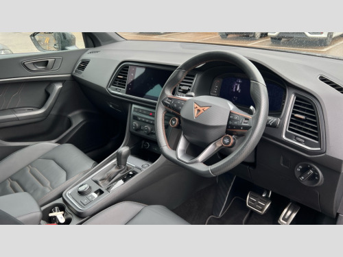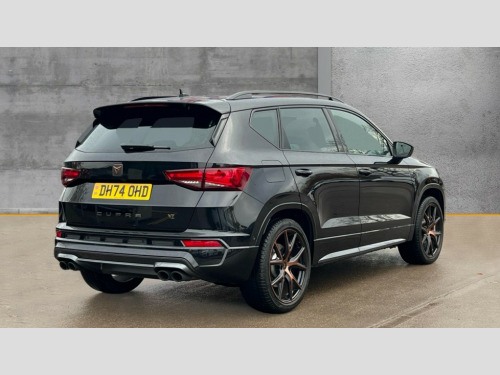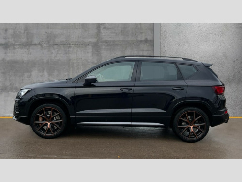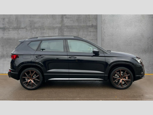 Cupra Ateca 2.0 TSI VZ3 5dr DSG 4Drive CUPRA drive profile - Normal, sport, CUPRA and individual modes and Hydraulic damper control (DCC), Digital cockpit, E-call, Electric tailgate with virtual pedal, Front and rear view camera, Outside temperature gauge, Progressive power assisted steering, Self parking functionality (includes front and rear parking sensors), Top view camera, Trip computer, wired and wireless full link smartphone integration, Wireless phone charger, CUPRA sport suspension, Steering wheel mounted audio/phone controls, Body colour bumpers with dark aluminium diffusor, Body coloured wheel arch surrounds, Dark tinted rear windows, Daytime running lights, Door mirrors with welcome CUPRA light silhouette, Dynamic headlight range control with self adjusting whilst driving, Electric adjustable/heated/folding door mirrors, Front and rear electric windows, Front grille frame in chrome, Full LED headlamps with lens and LED front fog lamps with cornering function, Gloss black door mirrors, Gloss black roof rails, Gloss black side mouldings, Gloss black side window trim, Illuminated aluminium front door sill, LED rear tail lights with dynamic indicators, Rear fog lights, Rear side wing doors, Rear spoiler, Rear wash/wipe, Specific CUPRA design front bumper, Third brake light, Visible twin black exhaust pipes in both sides, 12V socket in front, 3 seat bench in 2nd row, 60/40 split folding rear seat, Aluminium pedals, Black roof lining, Cupra steering wheel emblem, CUPRA supersports steering wheel including satellite buttons, Dual zone climate control, Electric driver seat with memory function, Front and rear head restraints, Front centre armrest, Front seat back storage pockets, Heated front seats, Heated steering wheel, Height adjustable driver and passenger seat with lumbar adjustment, ISOFIX points in outer rear seats with top tether anchorage points, Leather sport bucket seats, Multicoloured ambient lighting with LED interior illumination, Pedal cluster, Rear armrest and easy back seat release mechanism from boot, Single front passenger seat, Storage compartment in roof console for sunglass, Storage compartment under driver's seat, Convenience pack - Ateca, Interior lighting pack - Ateca, Navigation system plus pack with DAB - Ateca, Safe and driving pack with High beam control - Ateca, 3x3 point rear seatbelts, ABS, Traction control system (TCS), Electronic stability control (ESC) and Electronic differential lock system (XDS), Airbags - Driver and front passenger airbag with deactivation, front side, two curtain and driver's knee airbags, Attention and drowsiness assist, Black brake callipers with CUPRA logo, Electric parking brake with auto hold function, Front and rear seatbelt reminder, Hill hold control, Manual rear child locks, Performance brakes with front brembo calipers, Single tone horn, Tiredness recognition system, Tyre pressure monitoring system, Tyre pressure warning light, Alarm, Keyless entry, Locking wheel bolts, 19" Copper alloy wheels, Tyre repair kit
