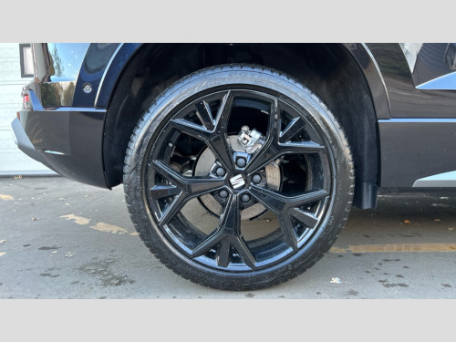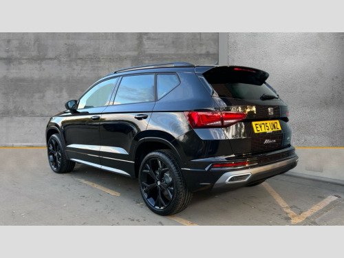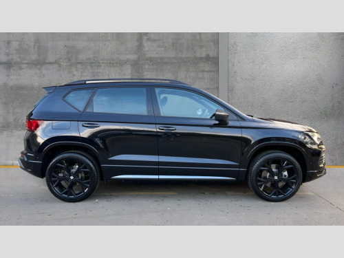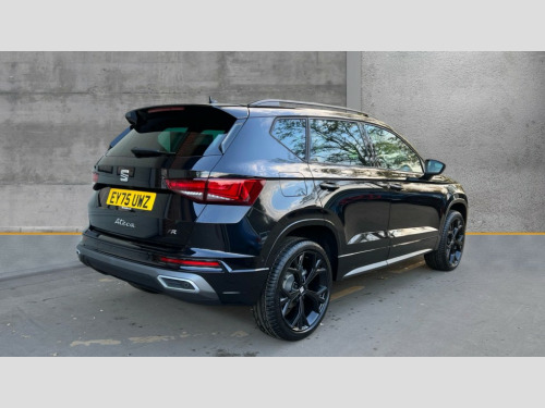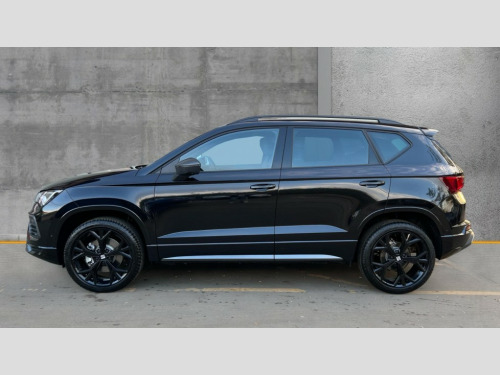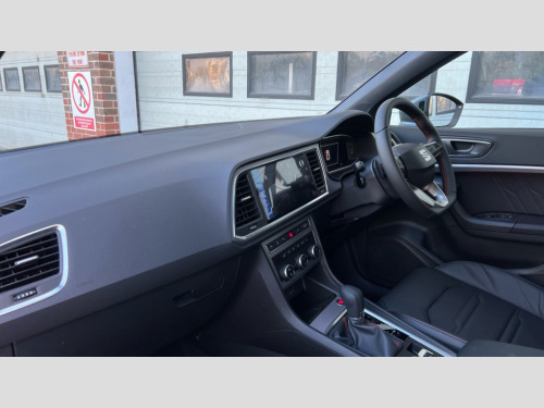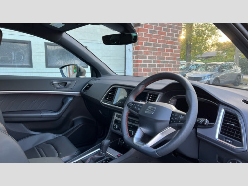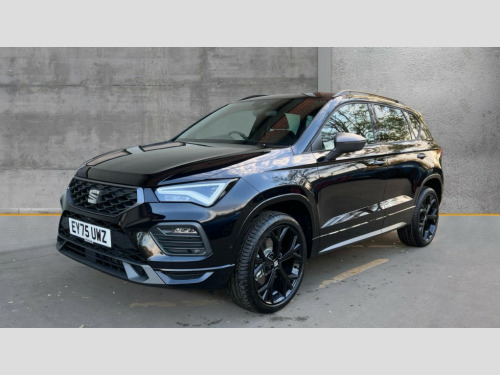 Seat Ateca 1.5 TSI EVO FR Black Edition 5dr DSG 10" Digital cockpit, Bluetooth audio streaming with handsfree system, E-call, Electric tailgate with virtual pedal, Outside temperature gauge, Progressive power assisted steering, SEAT drive profile with driving experience button - Normal, Sport, Eco and Individual mode, steering and throttle response, Self parking functionality (includes front and rear parking sensors), Speed limiter, Start/stop system, Top view camera with rear view camera, Trip computer, wired and wireless full link smartphone integration, Wireless phone charger, Steering wheel mounted audio/phone controls, Black roof rails, Black side window trim, Body colour bumpers, Body coloured wheel arch surrounds, Chrome front grille frame, Dark tinted rear windows, Daytime running lights, Door mirrors with welcome light silhouette, Dynamic headlight range control with self adjusting whilst driving, Electric adjustable/heated/folding door mirrors, Front and rear electric windows, Illuminated aluminium front door sill, LED 3rd brake light, LED headlamps with lens and LED front fog lamps with cornering function, LED rear tail lights with dynamic indicators, Rear exhaust tailpipe, Rear fog lights, Rear side wing doors, Rear spoiler, Rear wash/wipe, Variable front intermittent wipers, 12v socket in front, 3 seat bench in 2nd row, 60/40 split folding rear seat, Aluminium pedals, Black greenhouse interior roof, Dual zone climate control, Electric adjustable driver seat with memory function, Front and rear head restraints, Front centre armrest, Front seat back storage pockets, Heated front seats, Height adjustable passenger seats with lumbar adjustment, ISOFIX points in outer rear seats with top tether anchorage points, Leather sports steering wheel and gear knob, Leather upholstery with front comfort seats, Rear armrest and easy back seat release mechanism from boot, Single front passenger seat, Convenience pack - Ateca, Interior lighting pack - Ateca, Navigation system pack with DAB - Ateca, Safety and driving pack (L) - Ateca, Safety and driving pack with attention and drowsiness assist - Ateca, 3x3 point rear seatbelts, ABS, Traction control system (TCS), Electronic stability control (ESC) and Electronic differential lock system (XDS), Airbags - Driver and front passenger airbag with deactivation, front side, two curtain and driver's knee airbags, Electric parking brake with auto hold function, Front and rear seatbelt reminder, Hill hold control, Manual rear child locks, Single tone horn, Tyre pressure monitoring system, Alarm, Keyless entry, Locking wheel bolts, Remote central locking, Chrome interior detailing, 19" Exclusive alloy whelels 36/10 in glossy black, Tool kit