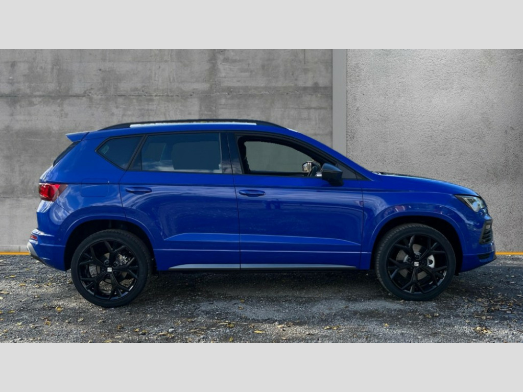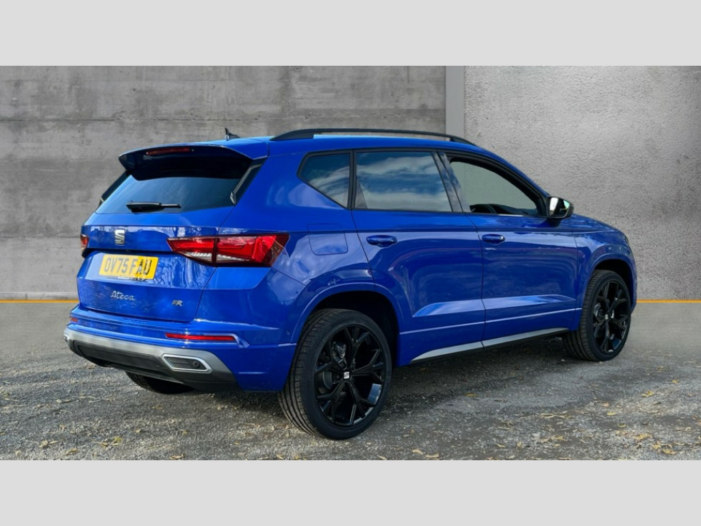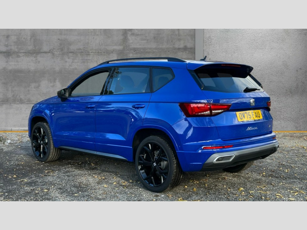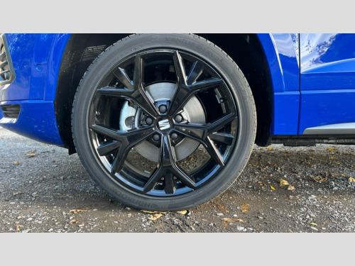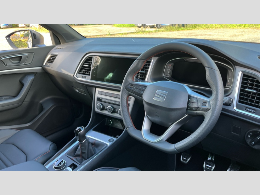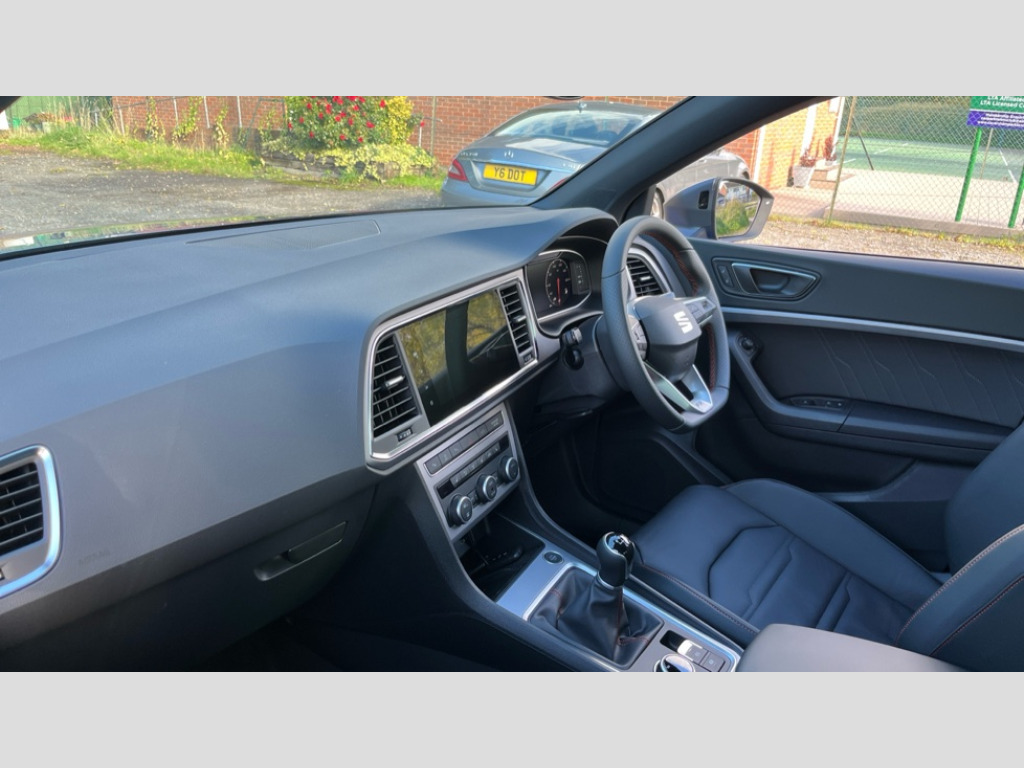 Seat Ateca 1.5 TSI EVO FR Black Edition 5dr 10" Digital cockpit, Bluetooth audio streaming with handsfree system, E-call, Electric tailgate with virtual pedal, Outside temperature gauge, Progressive power assisted steering, SEAT drive profile with driving experience button - Normal, Sport, Eco and Individual mode, steering and throttle response, Self parking functionality (includes front and rear parking sensors), Speed limiter, Start/stop system, Top view camera with rear view camera, Trip computer, wired and wireless full link smartphone integration, Wireless phone charger, Steering wheel mounted audio/phone controls, Black roof rails, Black side window trim, Body colour bumpers, Body coloured wheel arch surrounds, Chrome front grille frame, Dark tinted rear windows, Daytime running lights, Door mirrors with welcome light silhouette, Dynamic headlight range control with self adjusting whilst driving, Electric adjustable/heated/folding door mirrors, Front and rear electric windows, Illuminated aluminium front door sill, LED 3rd brake light, LED headlamps with lens and LED front fog lamps with cornering function, LED rear tail lights with dynamic indicators, Rear exhaust tailpipe, Rear fog lights, Rear side wing doors, Rear spoiler, Rear wash/wipe, Variable front intermittent wipers, 12V socket in front, 3 seat bench in 2nd row, 60/40 split folding rear seat, Aluminium pedals, Black greenhouse interior roof, Dual zone climate control, Electric adjustable driver seat with memory function, Front and rear head restraints, Front centre armrest, Front seat back storage pockets, Heated front seats, Height adjustable passenger seats with lumbar adjustment, ISOFIX points in outer rear seats with top tether anchorage points, Leather sports steering wheel and gear knob, Leather upholstery with front comfort seats, Rear armrest and easy back seat release mechanism from boot, Single front passenger seat, Convenience pack - Ateca, Interior lighting pack - Ateca, Navigation system pack with DAB - Ateca, Safety and driving pack (L) - Ateca, Safety and driving pack with attention and drowsiness assist - Ateca, 3x3 point rear seatbelts, ABS, Traction control system (TCS), Electronic stability control (ESC) and Electronic differential lock system (XDS), Airbags - Driver and front passenger airbag with deactivation, front side, two curtain and driver's knee airbags, Electric parking brake with auto hold function, Front and rear seatbelt reminder, Hill hold control, Manual rear child locks, Single tone horn, Tyre pressure monitoring system, Alarm, Keyless entry, Locking wheel bolts, Remote central locking, Chrome interior detailing, 19" Exclusive alloy whelels 36/10 in glossy black, Tool kit
