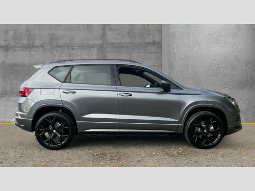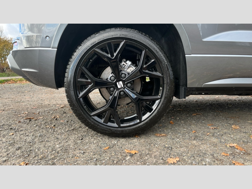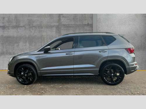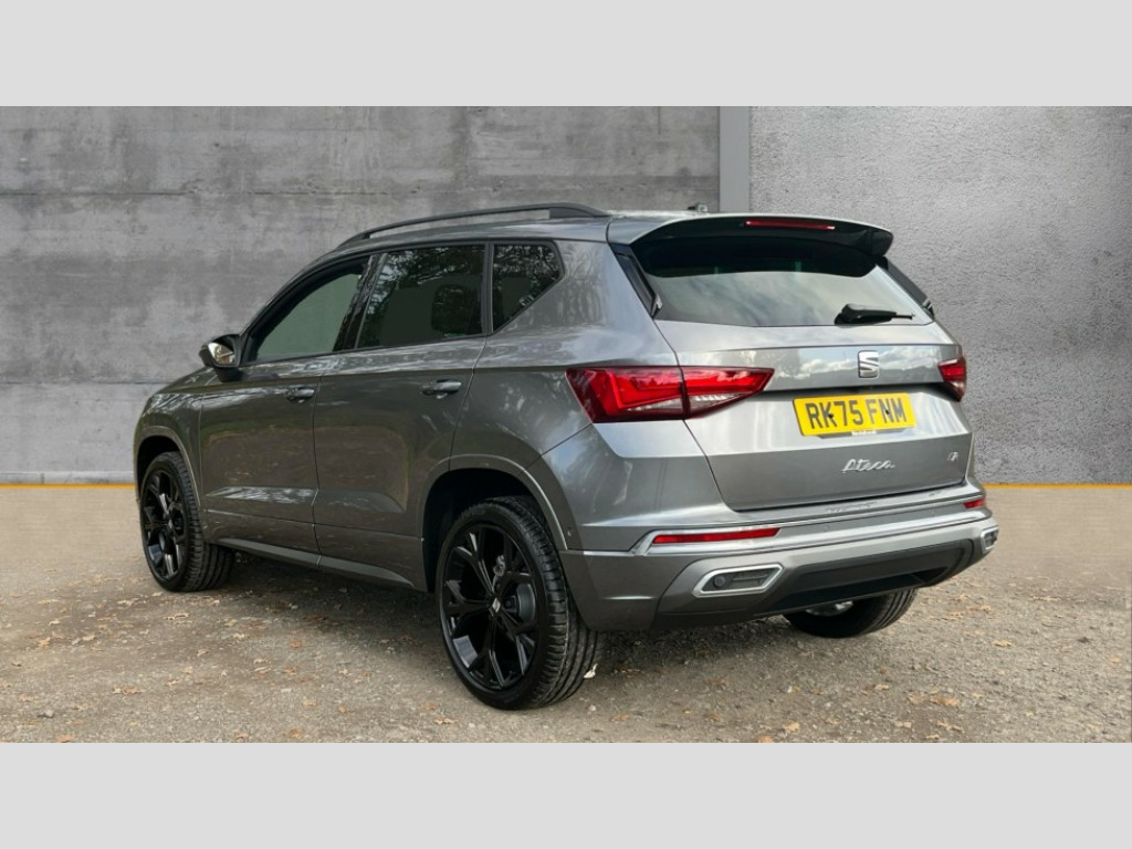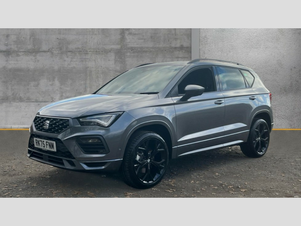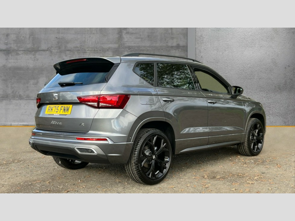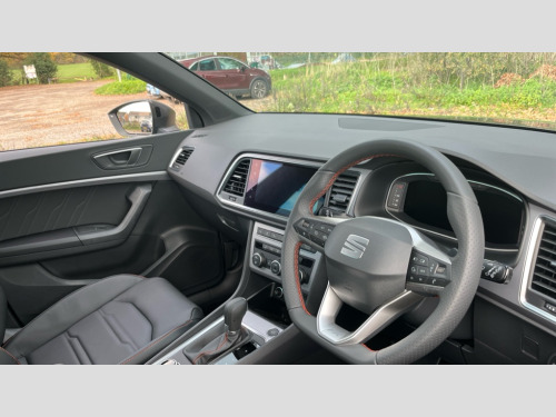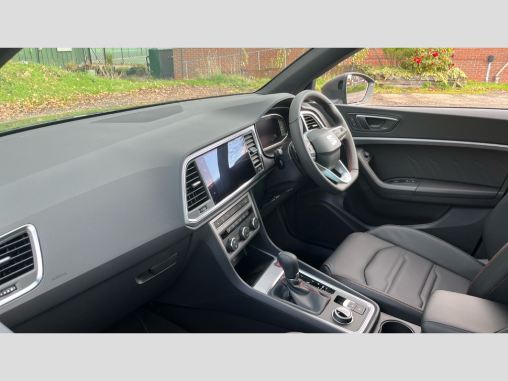 Seat Ateca 1.5 TSI EVO FR Black Edition 5dr DSG 10" Digital cockpit, Bluetooth audio streaming with handsfree system, E-call, Electric tailgate with virtual pedal, Outside temperature gauge, Progressive power assisted steering, SEAT drive profile with driving experience button - Normal, Sport, Eco and Individual mode, steering and throttle response, Self parking functionality (includes front and rear parking sensors), Speed limiter, Start/stop system, Top view camera with rear view camera, Trip computer, wired and wireless full link smartphone integration, Wireless phone charger, Steering wheel mounted audio/phone controls, Black roof rails, Black side window trim, Body colour bumpers, Body coloured wheel arch surrounds, Chrome front grille frame, Dark tinted rear windows, Daytime running lights, Door mirrors with welcome light silhouette, Dynamic headlight range control with self adjusting whilst driving, Electric adjustable/heated/folding door mirrors, Front and rear electric windows, Illuminated aluminium front door sill, LED 3rd brake light, LED headlamps with lens and LED front fog lamps with cornering function, LED rear tail lights with dynamic indicators, Rear exhaust tailpipe, Rear fog lights, Rear side wing doors, Rear spoiler, Rear wash/wipe, Variable front intermittent wipers, 12V socket in front, 3 seat bench in 2nd row, 60/40 split folding rear seat, Aluminium pedals, Black greenhouse interior roof, Dual zone climate control, Electric adjustable driver seat with memory function, Front and rear head restraints, Front centre armrest, Front seat back storage pockets, Heated front seats, Height adjustable passenger seats with lumbar adjustment, ISOFIX points in outer rear seats with top tether anchorage points, Leather sports steering wheel and gear knob, Leather upholstery with front comfort seats, Rear armrest and easy back seat release mechanism from boot, Single front passenger seat, Convenience pack - Ateca, Interior lighting pack - Ateca, Navigation system pack with DAB - Ateca, Safety and driving pack (L) - Ateca, Safety and driving pack with attention and drowsiness assist - Ateca, 3x3 point rear seatbelts, ABS, Traction control system (TCS), Electronic stability control (ESC) and Electronic differential lock system (XDS), Airbags - Driver and front passenger airbag with deactivation, front side, two curtain and driver's knee airbags, Electric parking brake with auto hold function, Front and rear seatbelt reminder, Hill hold control, Manual rear child locks, Single tone horn, Tyre pressure monitoring system, Alarm, Keyless entry, Locking wheel bolts, Remote central locking, Chrome interior detailing, 19" Exclusive alloy whelels 36/10 in glossy black, Tool kit