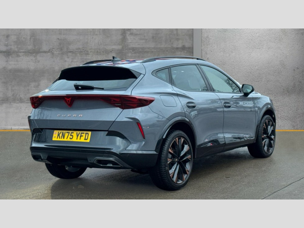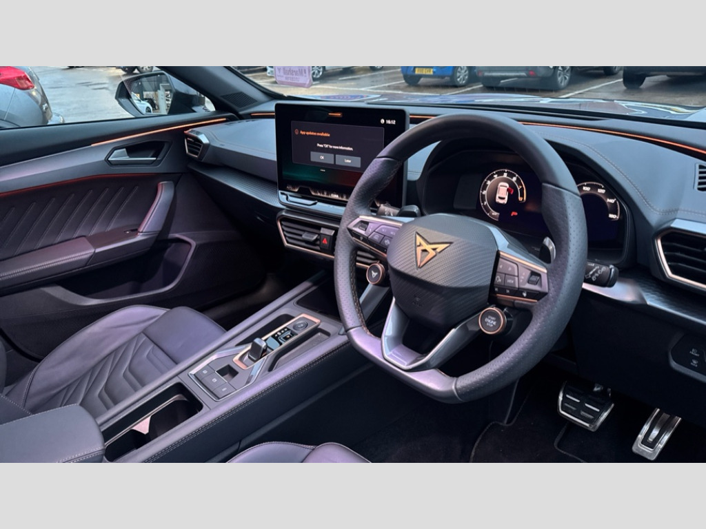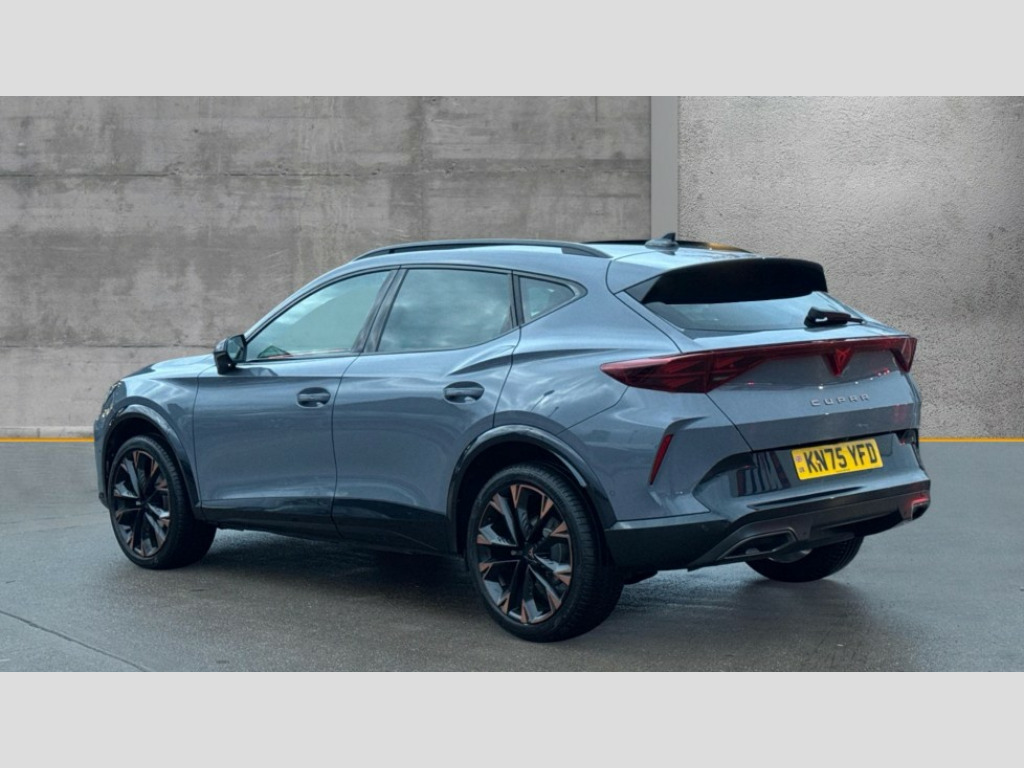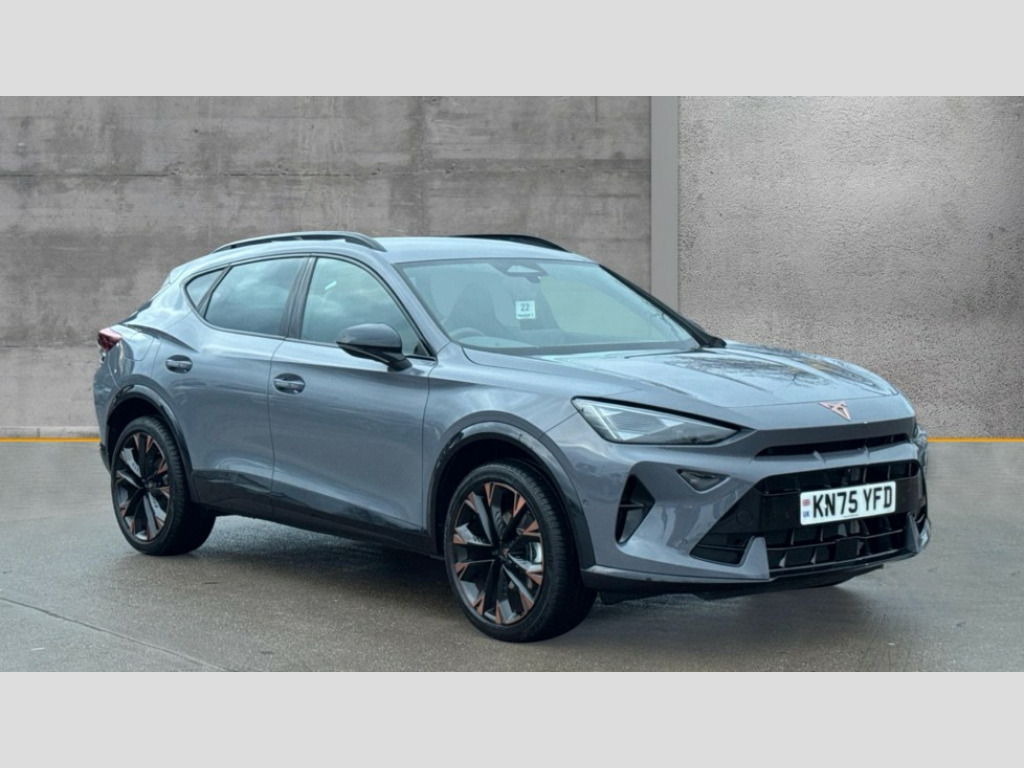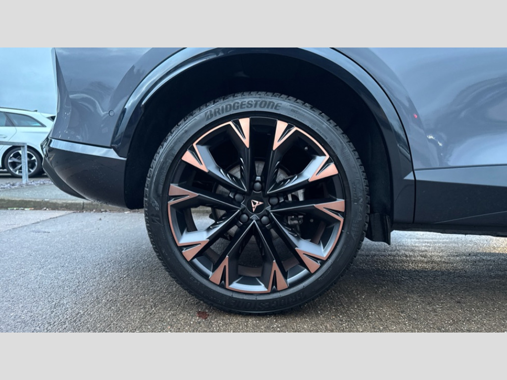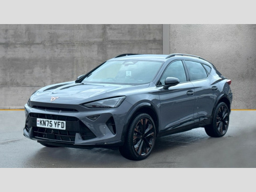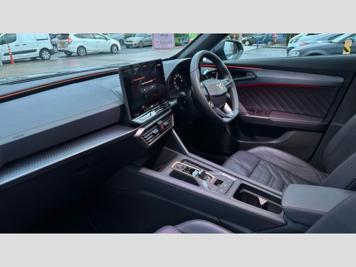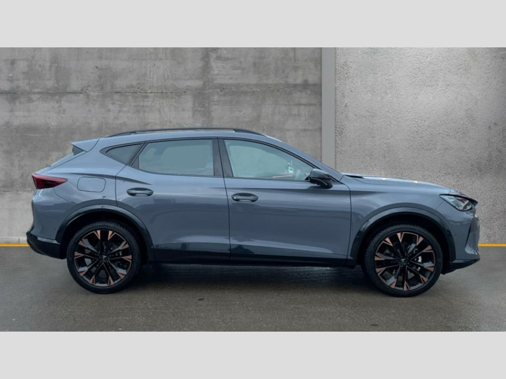 Cupra Formentor 1.5 eTSI 150 V3 5dr DSG 10.25" digital cockpit and configurable dashboard, Adaptive cruise control with follow-to-stop and speed limiter, Advanced driver alert system, Advanced lane assist with semi-automatic vehicle control in a medical emergency and traffic jam assist, Driving profile selection, Dynamic road sign display, Emergency steering support with turn assist, Forward collision warning with automatic braking, Front cross traffic assist, Full link phone integration, Intelligent park assist, Progressive steering, RPM, trip computer, outside temp gauge, instrument light brightness, low fuel warning light, lights on reminder, gearshift indicator, Service interval indicator, Side and exit assist, Start/stop system with regenerative braking, Top view camera, Virtual pedal and electric tailgate, Voice control system, Wired Android Auto, Wireless apple carplay, Wireless phone charger, CUPRA sport suspension, Electronic locking differential and dynamic traction support, 2 front and 2 rear USB type C sockets, Media system with navigation, 12.9" touchscreen display, voice control, DAB, steering wheel mounted controls, Auto dimming rear view mirror, Body colour door handles, Body coloured bumpers, Dark grey wing mirror, Daytime running light with automatic headlight control and coming home feature, Door panel ambient lighting, Dynamic headlight range control, Electric front/rear windows, Electrically adjustable heated and folding door mirrors with memory function, Gloss black roof rails and window surrounds, High beam assist, LED 3rd brake light, LED front fog lamps with cornering function, LED Headlights, LED Taillights with dynamic indicator, Rain sensing wipers, Rear diffuser with black simulated exhaust pipes, Rear fog lights, Rear side wing doors, Rear wash/wipe, Tinted rear windows, Welcome lights (within exterior mirror housing), 12V socket, 2 front and 2 rear reading lights, 3 seat bench in 2nd row, 60/40 split rear bench seat with armrest and mechanical seat release, Black headlining, Black interior roof lining, Cupra sports pedals, Dust/pollen filter, Electrically adjustable front seats with lumbar support and memory function, Front and rear head restraints, Front centre armrest, Heated front seats, Heated supersports multifunction leather steering wheel with satellite buttons and gear shift paddles, Height/reach adjust steering wheel, Illuminated aluminium doorsteps, Illuminated interior front door sills, Illuminated sunvisor with mirror, Isofix, Leather dashboard, door insert and side trim panel, LED smart wraparound lighting, PVC/Leather upholstery, Satellite steering wheel, Single front passenger seat, Storage pockets on rear of front seats, Three zone climate control with control panel in rear, Variable luggage/load compartment floor, 3 point seatbelts on all rear seats, ABS, Brake control system - ESC and brake booster, Child proof door locks, Driver and front passenger airbags with front passenger airbag de-activation, Electronic parking brake, Front and rear disc brakes, Front side curtain airbags, Hill hold control, Pre-crash front and rear seat belt tensioner, window closure and hazard lights, Public e-call, Seat belt reminder for front and rear seats, Tyre pressure monitoring system, Anti theft alarm system, KESSY Advanced - Keyless start, keyless entry with SAFELOCK, Locking wheel bolts, Warranty - 5 years/90,000 miles, Copper and aluminium interior detailing
