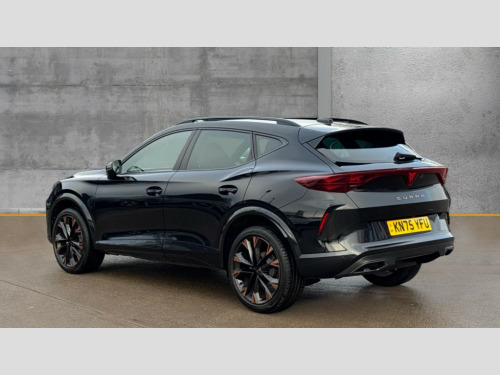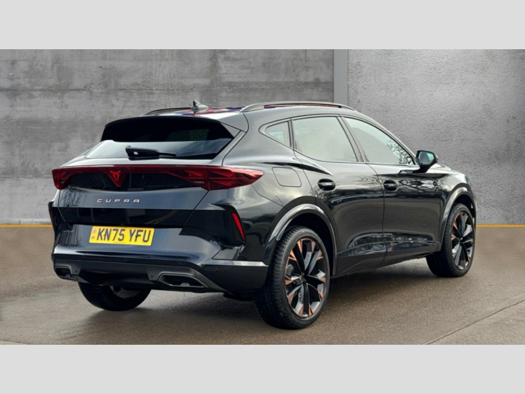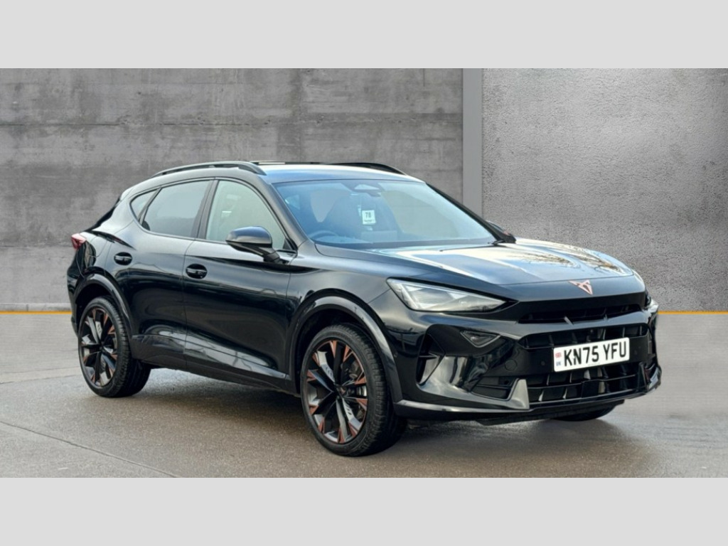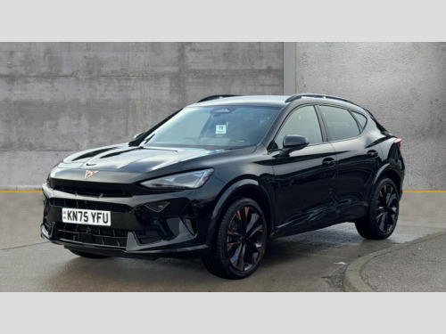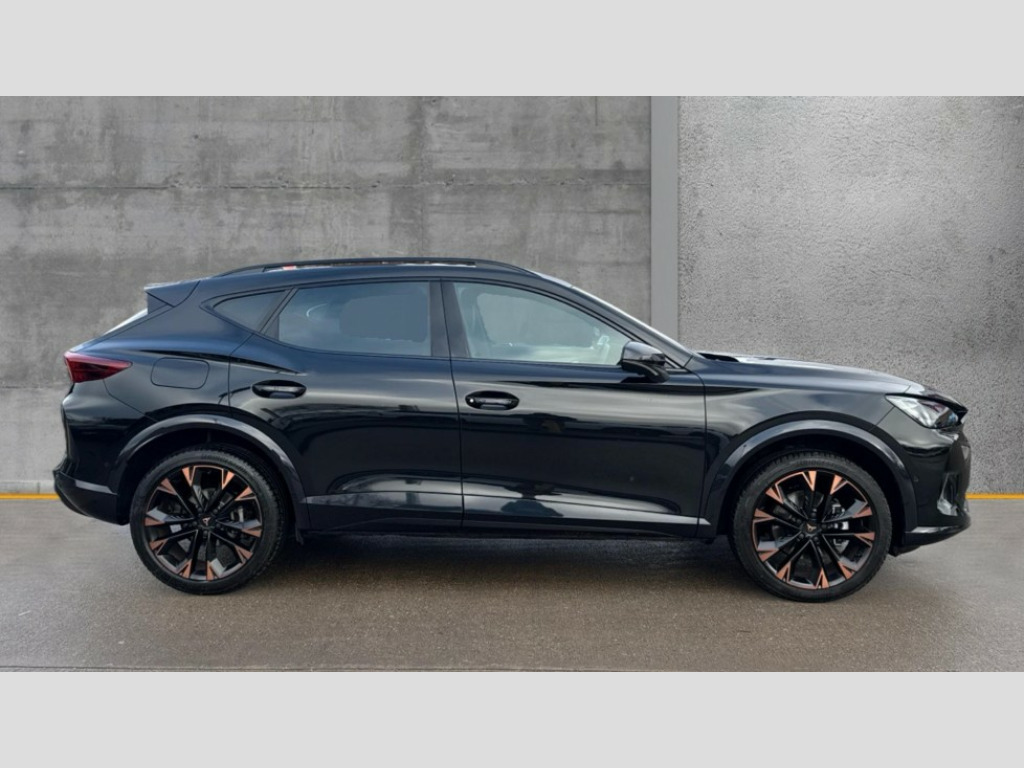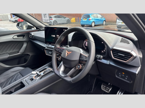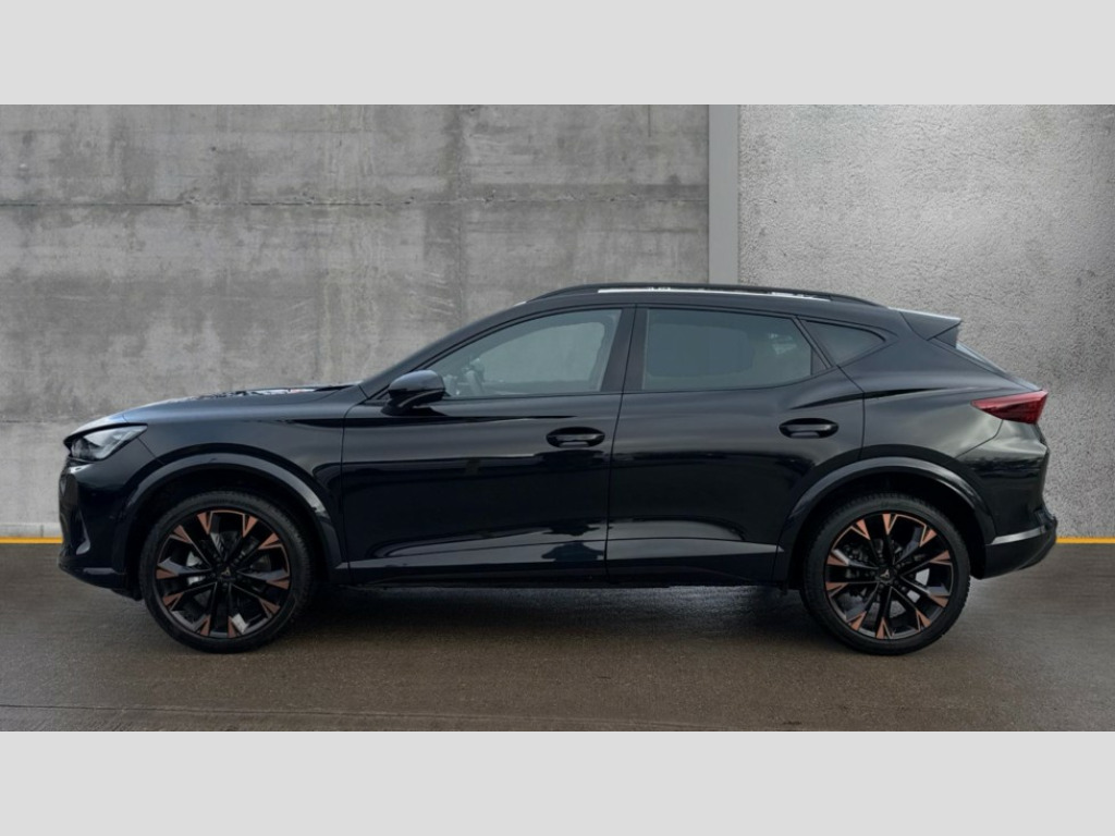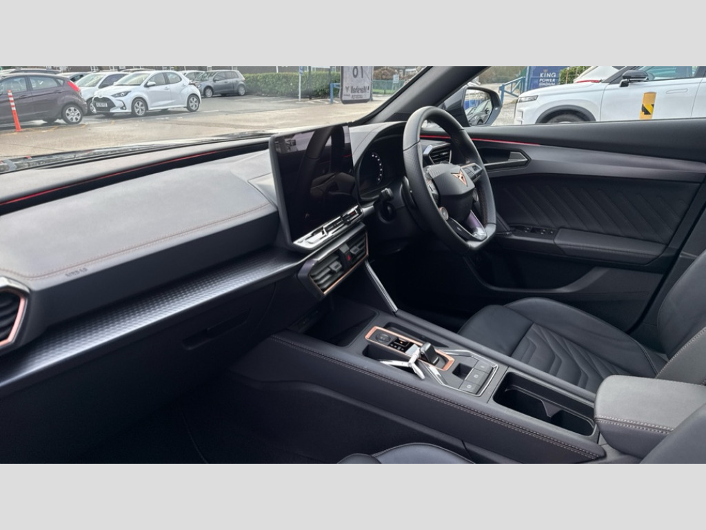 Cupra Formentor 1.5 eTSI 150 V3 5dr DSG 10.25" digital cockpit and configurable dashboard, Adaptive cruise control with follow-to-stop and speed limiter, Advanced driver alert system, Advanced lane assist with semi-automatic vehicle control in a medical emergency and traffic jam assist, Driving profile selection, Dynamic road sign display, Emergency steering support with turn assist, Forward collision warning with automatic braking, Front cross traffic assist, Full link phone integration, Intelligent park assist, Progressive steering, RPM, trip computer, outside temp gauge, instrument light brightness, low fuel warning light, lights on reminder, gearshift indicator, Service interval indicator, Side and exit assist, Start/stop system with regenerative braking, Top view camera, Virtual pedal and electric tailgate, Voice control system, Wired Android Auto, Wireless apple carplay, Wireless phone charger, CUPRA sport suspension, Electronic locking differential and dynamic traction support, 2 front and 2 rear USB type C sockets, Media system with navigation, 12.9" touchscreen display, voice control, DAB, steering wheel mounted controls, Auto dimming rear view mirror, Body colour door handles, Body coloured bumpers, Dark grey wing mirror, Daytime running light with automatic headlight control and coming home feature, Door panel ambient lighting, Dynamic headlight range control, Electric front/rear windows, Electrically adjustable heated and folding door mirrors with memory function, Gloss black roof rails and window surrounds, High beam assist, LED 3rd brake light, LED front fog lamps with cornering function, LED Headlights, LED Taillights with dynamic indicator, Rain sensing wipers, Rear diffuser with black simulated exhaust pipes, Rear fog lights, Rear side wing doors, Rear wash/wipe, Tinted rear windows, Welcome lights (within exterior mirror housing), 12V socket, 2 front and 2 rear reading lights, 3 seat bench in 2nd row, 60/40 split rear bench seat with armrest and mechanical seat release, Black headlining, Black interior roof lining, Cupra sports pedals, Dust/pollen filter, Electrically adjustable front seats with lumbar support and memory function, Front and rear head restraints, Front centre armrest, Heated front seats, Heated supersports multifunction leather steering wheel with satellite buttons and gear shift paddles, Height/reach adjust steering wheel, Illuminated aluminium doorsteps, Illuminated interior front door sills, Illuminated sunvisor with mirror, Isofix, Leather dashboard, door insert and side trim panel, LED smart wraparound lighting, PVC/Leather upholstery, Satellite steering wheel, Single front passenger seat, Storage pockets on rear of front seats, Three zone climate control with control panel in rear, Variable luggage/load compartment floor, 3 point seatbelts on all rear seats, ABS, Brake control system - ESC and brake booster, Child proof door locks, Driver and front passenger airbags with front passenger airbag de-activation, Electronic parking brake, Front and rear disc brakes, Front side curtain airbags, Hill hold control, Pre-crash front and rear seat belt tensioner, window closure and hazard lights, Public e-call, Seat belt reminder for front and rear seats, Tyre pressure monitoring system, Anti theft alarm system, KESSY Advanced - Keyless start, keyless entry with SAFELOCK, Locking wheel bolts, Warranty - 5 years/90,000 miles, Copper and aluminium interior detailing