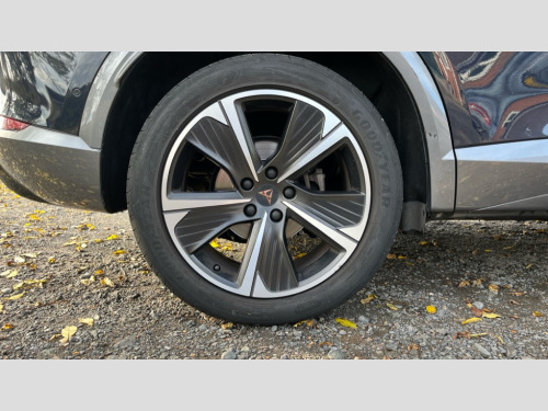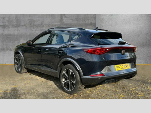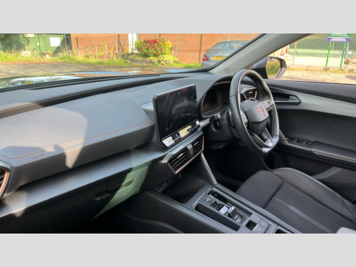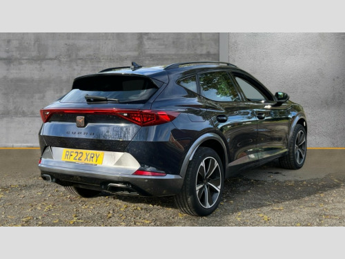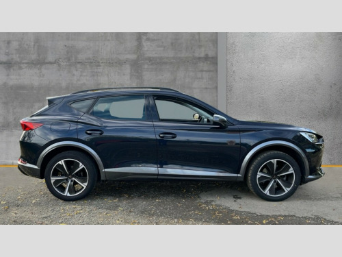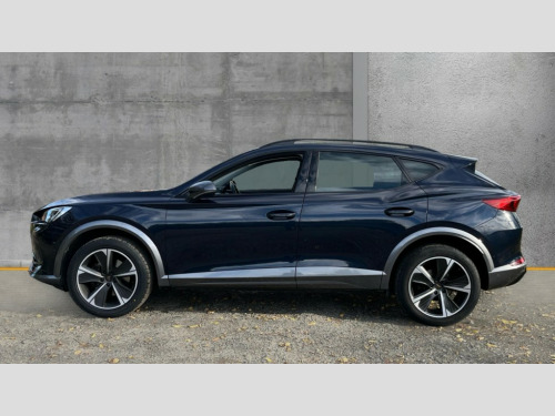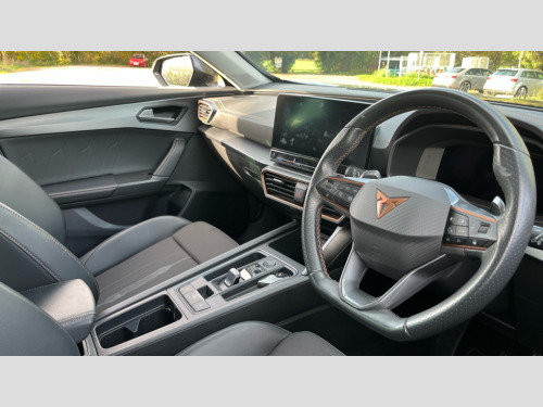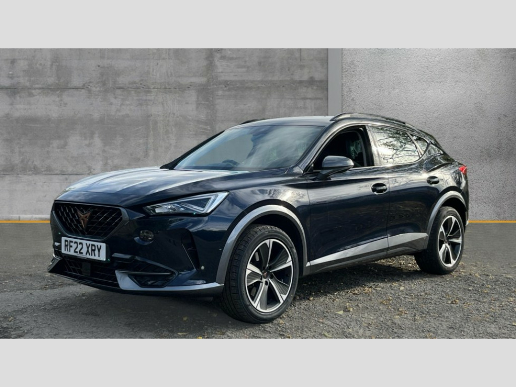 Cupra Formentor 1.5 TSI 150 V1 5dr DSG Digital cockpit and configurable dashboard, Driver alert system, Driving profile selection, E-call, Forward collision warning with automatic braking, Lane assist, Navigation system with 12'' Touchscreen Display, PAS, Predictive adaptive cruise control with speed limiter, Rear parking sensors, RPM, trip computer, outside temp gauge, instrument light brightness, low fuel warning light, lights on reminder, gearshift indicator, Service interval indicator, Start/stop system with regenerative braking, Voice control system, Wireless apple carplay, Wireless phone charger, Electronic locking differential and dynamic traction support, Standard suspension, 2 front and 2 rear USB type C sockets, Auxiliary input socket, DAB radio, Auto dimming rear view mirror, Body colour door handles, Body coloured bumpers, Dark grey wing mirror, Daytime running light with automatic headlight control and coming home feature, Dynamic headlight range control, Electric front/rear windows, Electrically adjustable, heated and folding door mirrors, Front fog lamps with cornering function, Gloss black roof rails and window surrounds, LED Headlights, LED Taillights with dynamic indicator, Rain sensing wipers, Rear diffuser with black simulated exhaust pipes, Rear side wing doors, Rear wash/wipe, Third brake light, Tinted rear windows, Welcome lights, 12v power supply in centre console, 12V socket, 12v socket in loadspace, 2 front and 2 rear reading lights, 230V socket, 3 seat bench in 2nd row, 60/40 split rear bench seat with armrest and mechanical seat release, Dust/pollen filter, Front and rear head restraints, Front centre armrest, Height/reach adjust steering wheel, Illuminated interior front door sills, Illuminated sunvisor with mirror, Interior ambient lighting, Isofix, Leather multi function steering wheel, Luggage tie-down hooks, Manually adjustable height and lumbar support for front seats, PVC/Cloth upholstery with copper stitching + Sport seats, Single front passenger seat, Three zone climate control with control panel in rear, Variable luggage/load compartment floor, Safety and driving pack (M) - Formentor, 3 point seatbelts on all rear seats, ABS, Brake control system - ESC and brake booster, Child proof door locks, Driver and front passenger airbags with front passenger airbag de-activation, Electronic parking brake, Front and rear disc brakes, Front side curtain airbags, Hill hold control, Seat belt reminder for front and rear seats, Tyre pressure monitoring system, Anti theft alarm system, Keyless entry and start system (KESSY), Locking wheel bolts, Copper and aluminium interior detailing