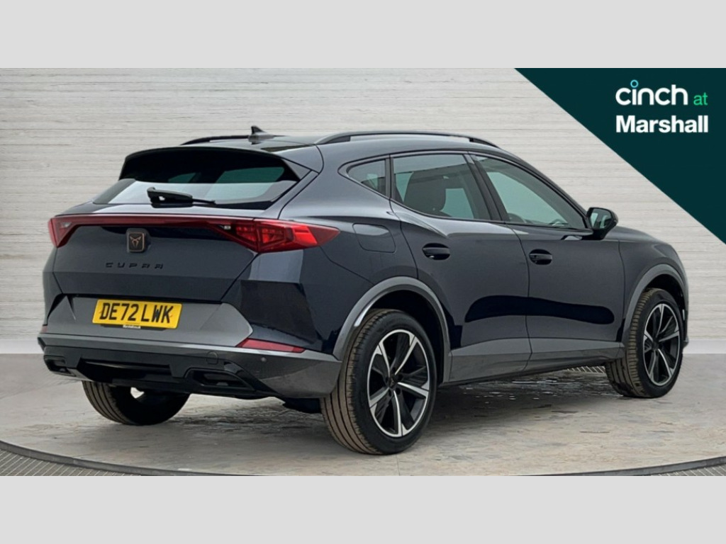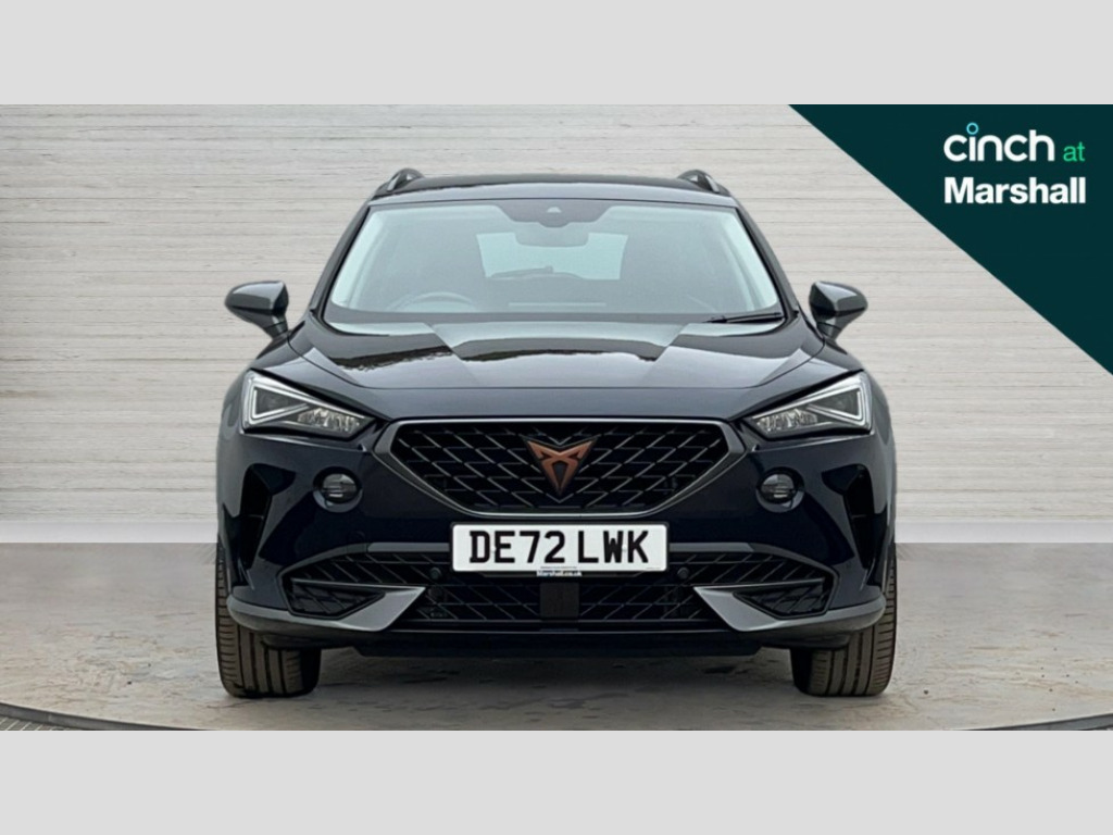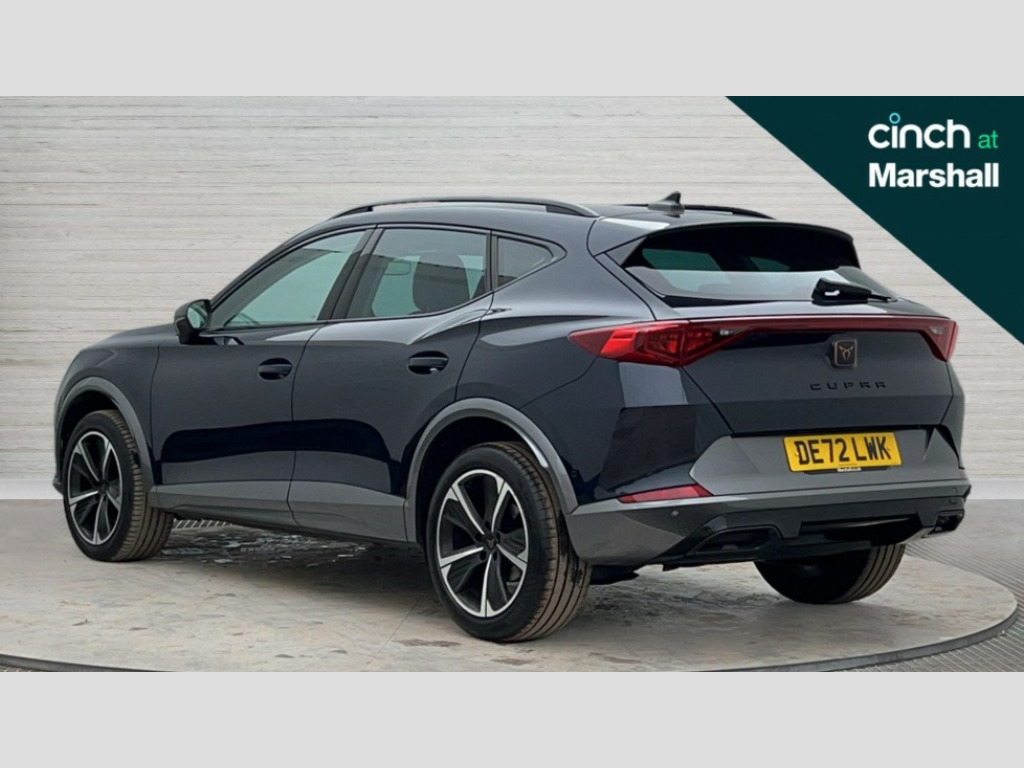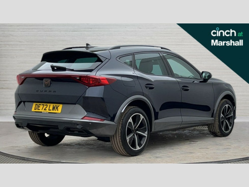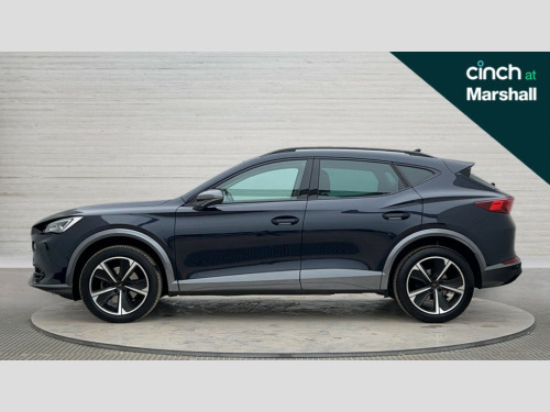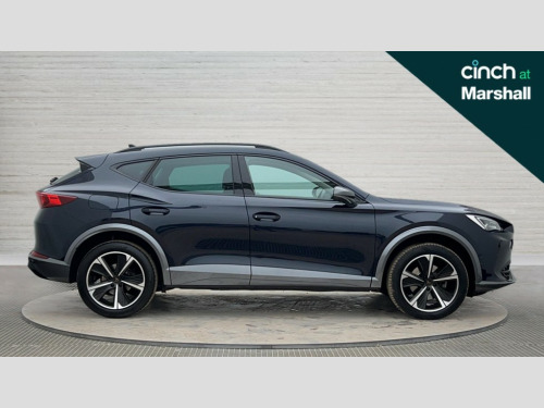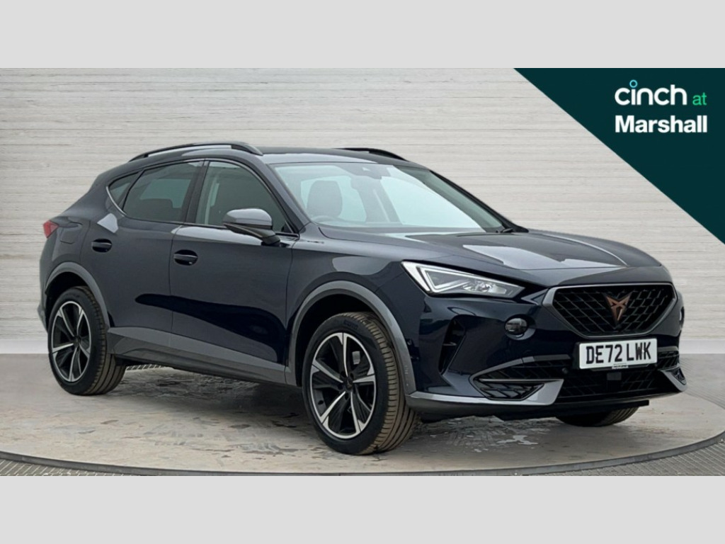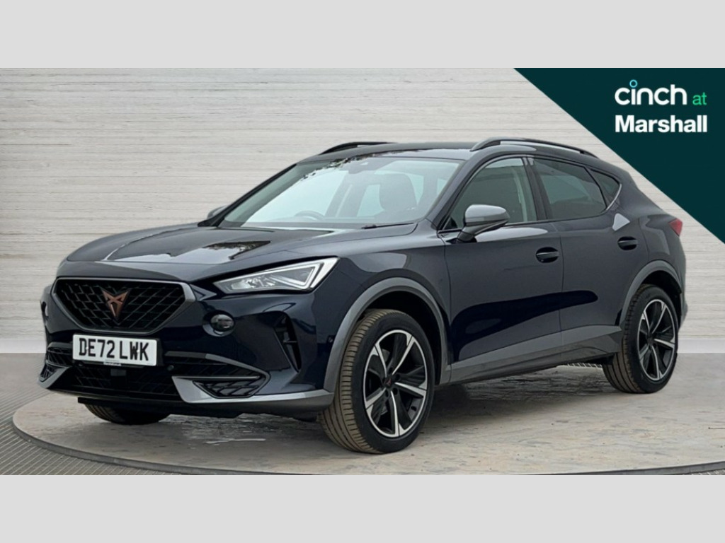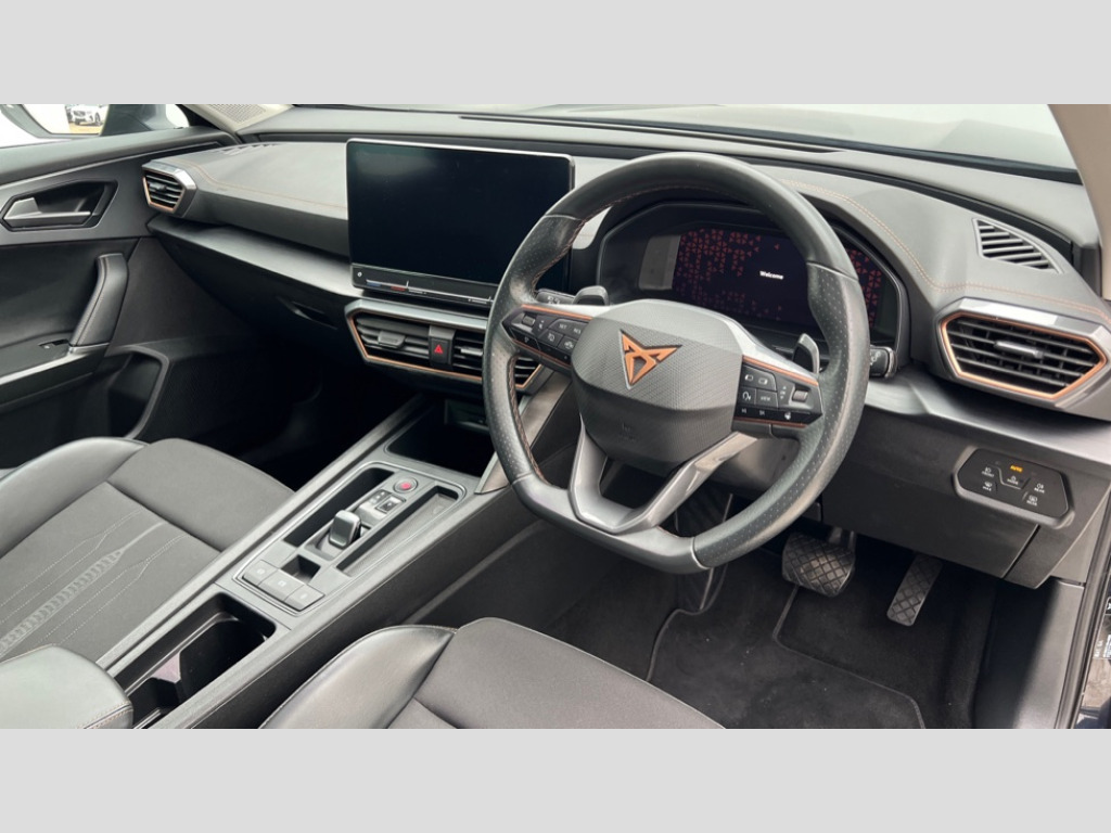 Cupra Formentor 1.5 TSI 150 V1 5dr DSG Digital cockpit and configurable dashboard, Driver alert system, Driving profile selection, E-call, Forward collision warning with automatic braking, Lane assist, Navigation system with 12'' Touchscreen Display, PAS, Predictive adaptive cruise control with speed limiter, Rear parking sensors, RPM, trip computer, outside temp gauge, instrument light brightness, low fuel warning light, lights on reminder, gearshift indicator, Service interval indicator, Start/stop system with regenerative braking, Voice control system, Wireless apple carplay, Wireless phone charger, Electronic locking differential and dynamic traction support, Standard suspension, 2 front and 2 rear USB type C sockets, Auxiliary input socket, DAB radio, Auto dimming rear view mirror, Body colour door handles, Body coloured bumpers, Dark grey wing mirror, Daytime running light with automatic headlight control and coming home feature, Dynamic headlight range control, Electric front/rear windows, Electrically adjustable, heated and folding door mirrors, Front fog lamps with cornering function, Gloss black roof rails and window surrounds, LED Headlights, LED Taillights with dynamic indicator, Rain sensing wipers, Rear diffuser with black simulated exhaust pipes, Rear side wing doors, Rear wash/wipe, Third brake light, Tinted rear windows, Welcome lights, 12v power supply in centre console, 12V socket, 12v socket in loadspace, 2 front and 2 rear reading lights, 230V socket, 3 seat bench in 2nd row, 60/40 split rear bench seat with armrest and mechanical seat release, Dust/pollen filter, Front and rear head restraints, Front centre armrest, Height/reach adjust steering wheel, Illuminated interior front door sills, Illuminated sunvisor with mirror, Interior ambient lighting, Isofix, Leather multi function heated steering wheel with gear shift paddles, Luggage tie-down hooks, Manually adjustable height and lumbar support for front seats, PVC/Cloth upholstery with copper stitching + Sport seats, Single front passenger seat, Three zone climate control with control panel in rear, Variable luggage/load compartment floor, Safety and driving pack (M) - Formentor, 3 point seatbelts on all rear seats, ABS, Brake control system - ESC and brake booster, Child proof door locks, Driver and front passenger airbags with front passenger airbag de-activation, Electronic parking brake, Front and rear disc brakes, Front side curtain airbags, Hill hold control, Seat belt reminder for front and rear seats, Tyre pressure monitoring system, Anti theft alarm system, Keyless entry and start system (KESSY), Locking wheel bolts, Copper and aluminium interior detailing