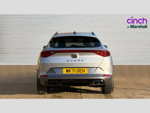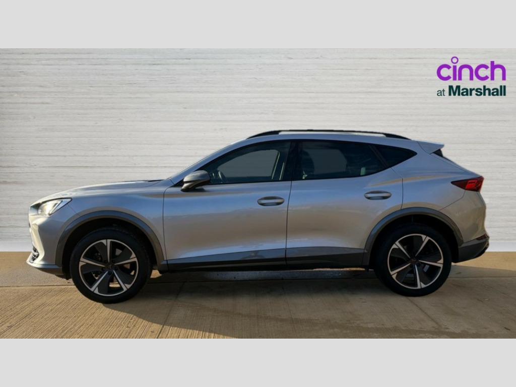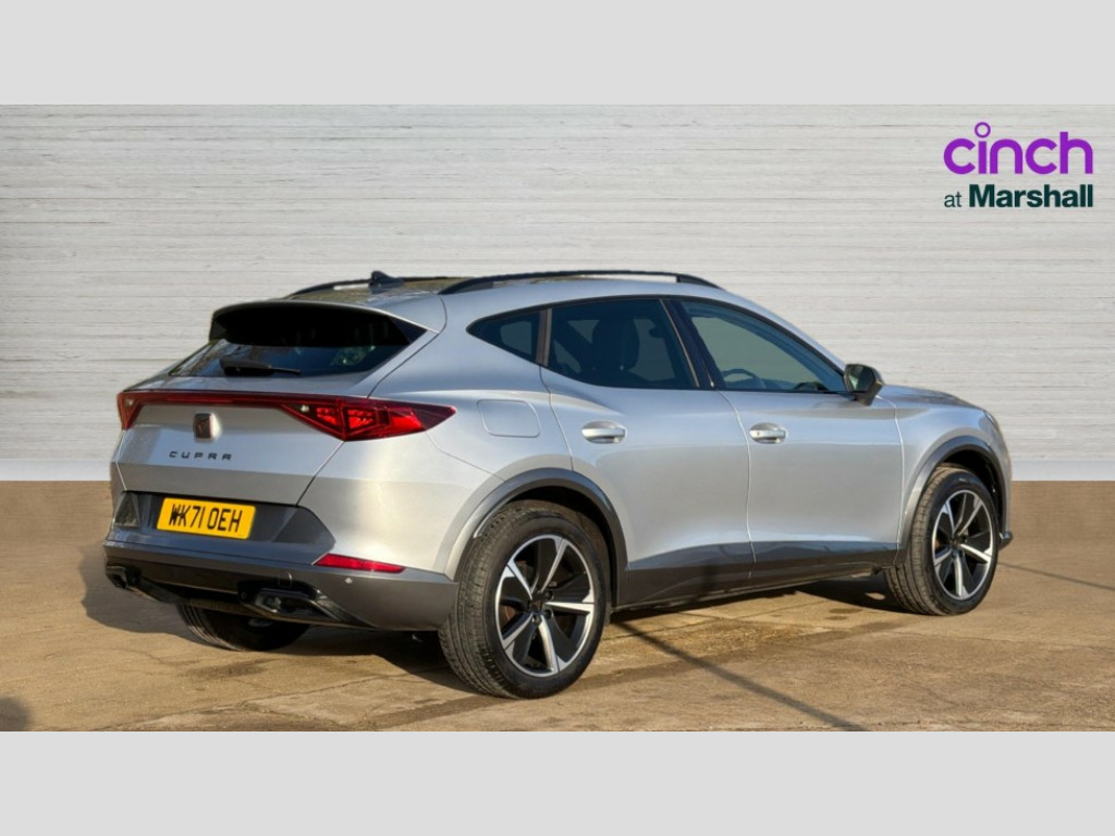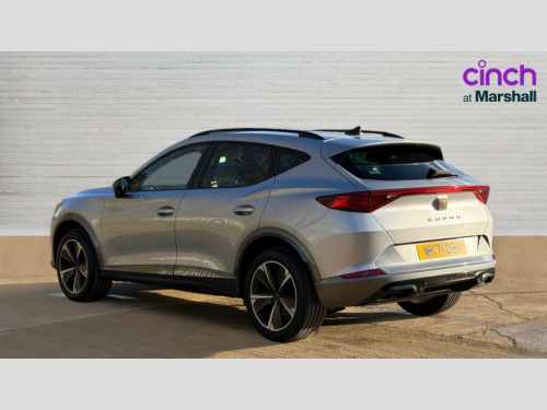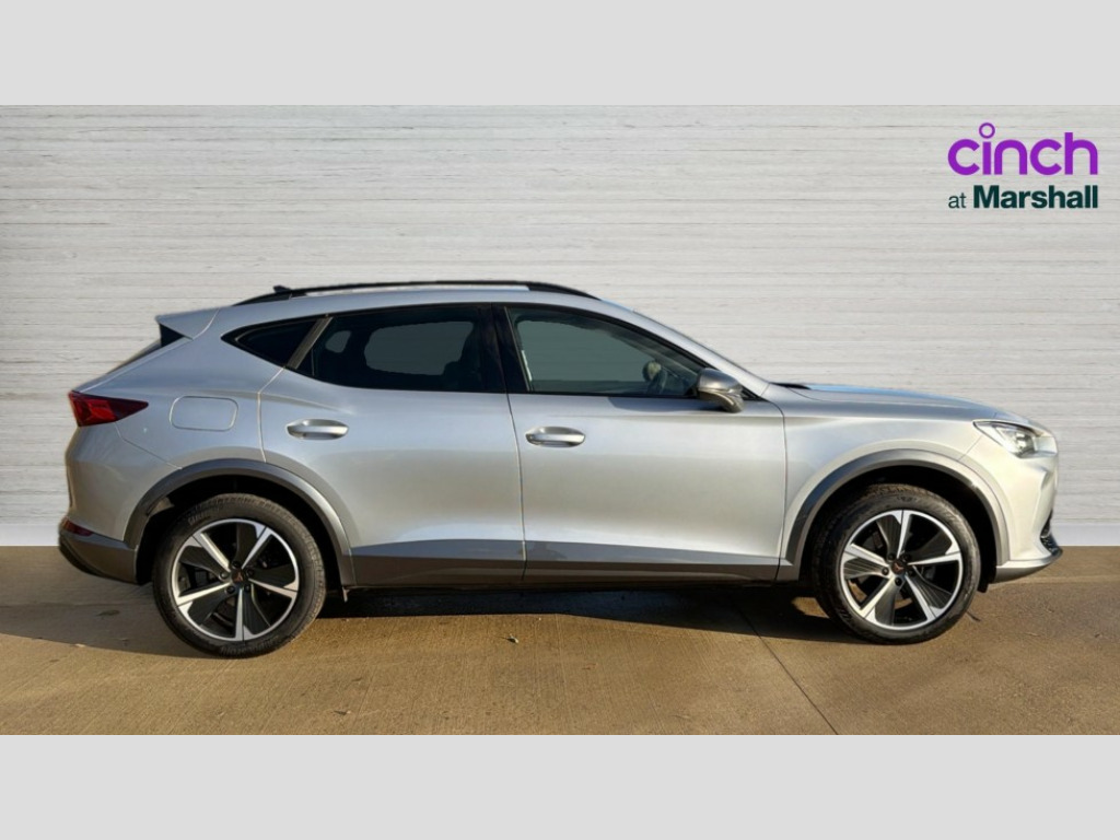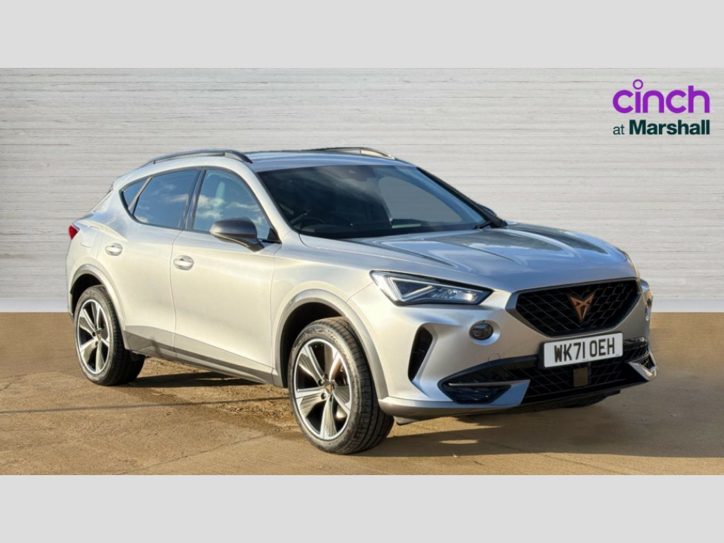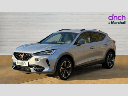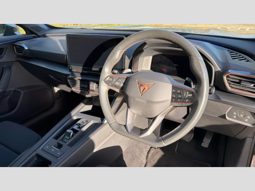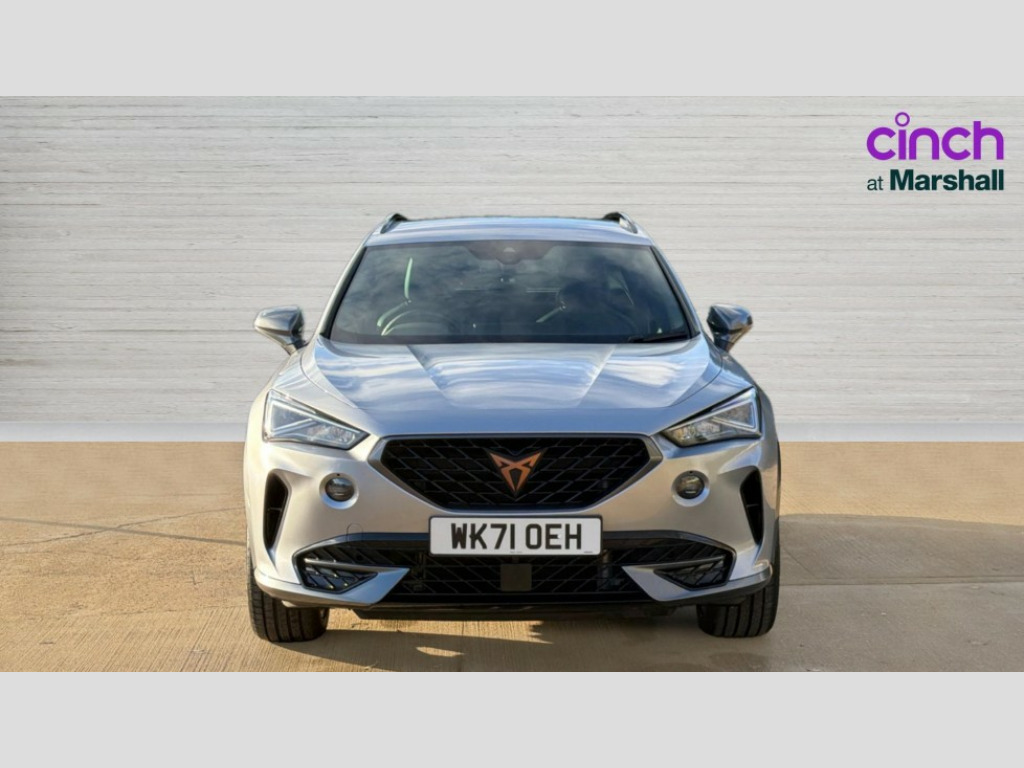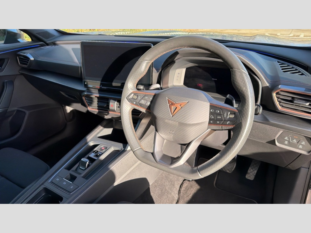 Cupra Formentor 1.5 TSI 150 V1 5dr DSG Digital cockpit and configurable dashboard, Driver alert system, Driving profile selection, Forward collision warning with automatic braking, Lane assist, PAS, Predictive adaptive cruise control with speed limiter, Rear parking sensors, RPM, trip computer, outside temp gauge, instrument light brightness, low fuel warning light, lights on reminder, gearshift indicator, Service interval indicator, Start/stop system with regenerative braking, Wireless apple carplay, Wireless phone charger, Electronic locking differential and dynamic traction support, Standard suspension, 2 front and 2 rear USB type C sockets, Auxiliary input socket, DAB radio, Auto dimming rear view mirror, Body colour door handles, Body coloured bumpers, Dark grey wing mirror, Daytime running light with automatic headlight control and coming home feature, Dynamic headlight range control, Electric front/rear windows, Electrically adjustable, heated and folding door mirrors, Front fog lamps with cornering function, Gloss black roof rails and window surrounds, LED Headlights, LED Taillights with dynamic indicator, Rain sensing wipers, Rear diffuser with black simulated exhaust pipes, Rear wash/wipe, Tinted rear windows, Welcome lights, 12v power supply in centre console, 12V socket, 12v socket in loadspace, 2 front and 2 rear reading lights, 230V socket, 60/40 split rear bench seat with armrest and mechanical seat release, Dust/pollen filter, Front and rear head restraints, Front centre armrest, Height/reach adjust steering wheel, Illuminated interior front door sills, Illuminated sunvisor with mirror, Interior ambient lighting, Isofix, Leather multi function heated steering wheel with gear shift paddles, Luggage tie-down hooks, Manually adjustable height and lumbar support for front seats, PVC/Cloth upholstery with copper stitching + Sport seats, Three zone climate control with control panel in rear, Variable luggage/load compartment floor, Navigation system pack with 10" navigation system - Formentor, Safety and driving pack (M) - Formentor, 3 point seatbelts on all rear seats, ABS, Brake control system - ESC and brake booster, Child proof door locks, Driver and front passenger airbags with front passenger airbag de-activation, Electronic parking brake, Front and rear disc brakes, Front side curtain airbags, Hill hold control, Seat belt reminder for front and rear seats, Tyre pressure monitoring system, Anti theft alarm system, Keyless entry and start system (KESSY), Locking wheel bolts, Copper and aluminium interior detailing