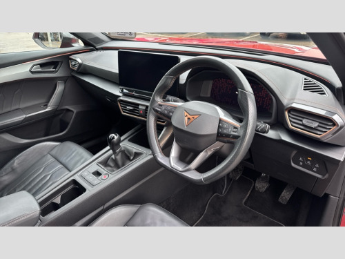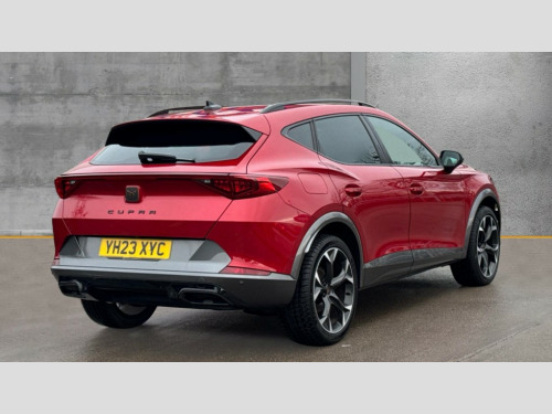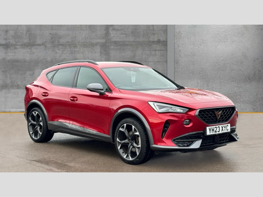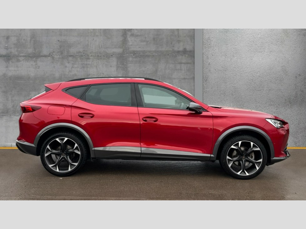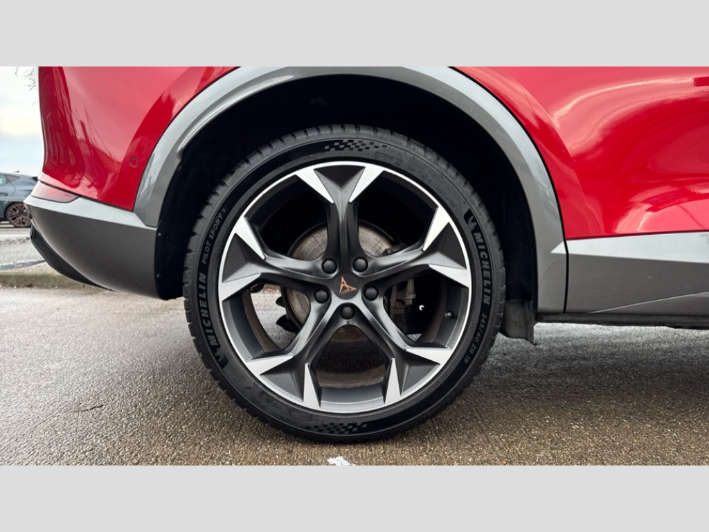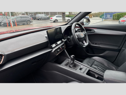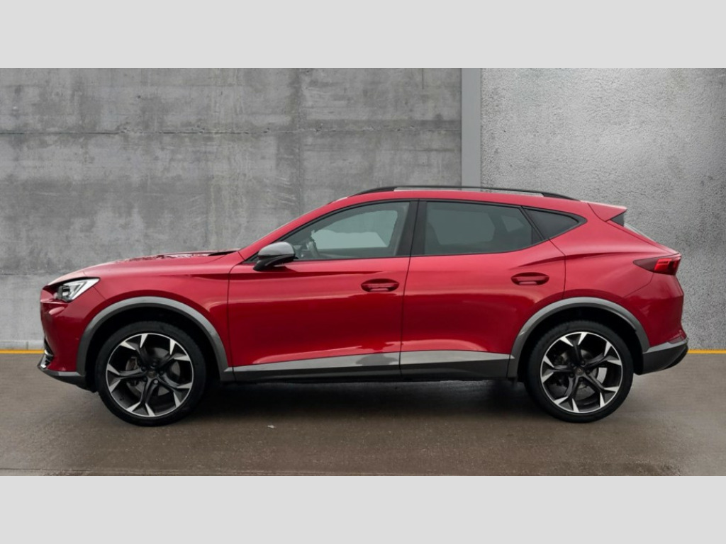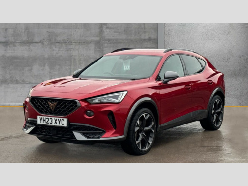 Cupra Formentor 1.5 TSI 150 V2 5dr Digital cockpit and configurable dashboard, Driver alert system, Driving profile selection, Forward collision warning with automatic braking, Lane assist, Navigation system with 12'' Touchscreen Display, Park assist (inc front/rear parking sensors), PAS, Predictive adaptive cruise control with speed limiter, Rear view camera, RPM, trip computer, outside temp gauge, instrument light brightness, low fuel warning light, lights on reminder, gearshift indicator, Service interval indicator, Start/stop system with regenerative braking, Voice control system, Wireless apple carplay, Wireless phone charger, Electronic locking differential and dynamic traction support, Standard suspension, 2 front and 2 rear USB type C sockets, Auxiliary input socket, DAB radio, Auto dimming rear view mirror, Body colour door handles, Body coloured bumpers, Dark grey wing mirror, Daytime running light with automatic headlight control and coming home feature, Dynamic headlight range control, Electric front/rear windows, Electrically adjustable heated and folding door mirrors with memory function, Front fog lamps with cornering function, Gloss black roof rails and window surrounds, LED Headlights, LED Taillights with dynamic indicator, Rain sensing wipers, Rear diffuser with black simulated exhaust pipes, Rear side wing doors, Rear wash/wipe, Third brake light, Tinted rear windows, Welcome lights, 12v power supply in centre console, 12V socket, 12v socket in loadspace, 2 front and 2 rear reading lights, 230V socket, 3 seat bench in 2nd row, 60/40 split rear bench seat with armrest and mechanical seat release, Black headlining, Dust/pollen filter, Front and rear head restraints, Front centre armrest, Height/reach adjust steering wheel, Illuminated interior front door sills, Illuminated sunvisor with mirror, Isofix, Leather multi function steering wheel, Luggage tie-down hooks, Single front passenger seat, Three zone climate control with control panel in rear, Variable luggage/load compartment floor, Wraparound lighting, Genuine Nappa leather Pack - Cupra, Safety and driving pack (M) - Formentor, 3 point seatbelts on all rear seats, ABS, Brake control system - ESC and brake booster, Child proof door locks, Driver and front passenger airbags with front passenger airbag de-activation, Electronic parking brake, Front and rear disc brakes, Front side curtain airbags, Hill hold control, Public e-call, Seat belt reminder for front and rear seats, Tyre pressure monitoring system, Anti theft alarm system, Keyless entry and start system (KESSY), Locking wheel bolts, Copper and aluminium interior detailing, 19" 'Exclusive' machined sport matte black and silver alloy wheels