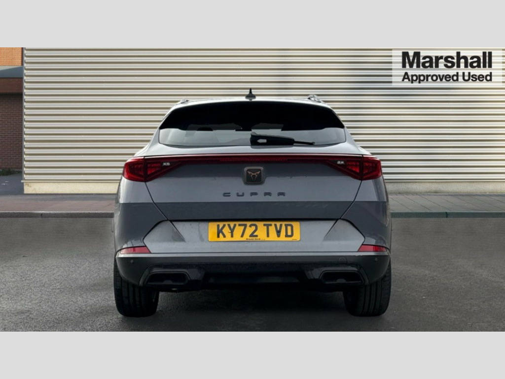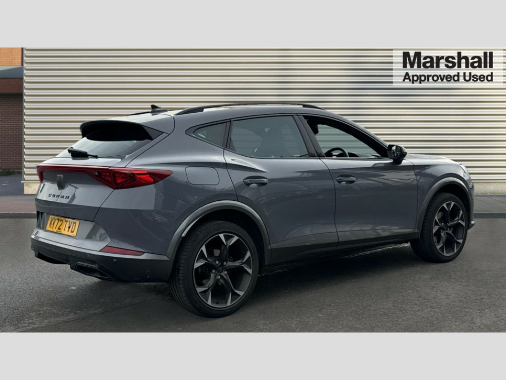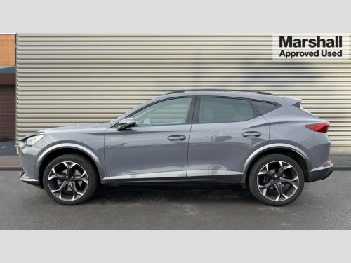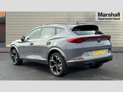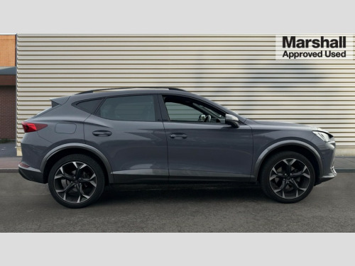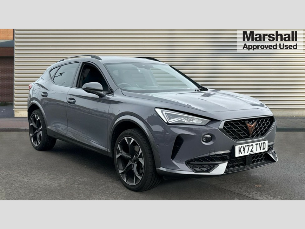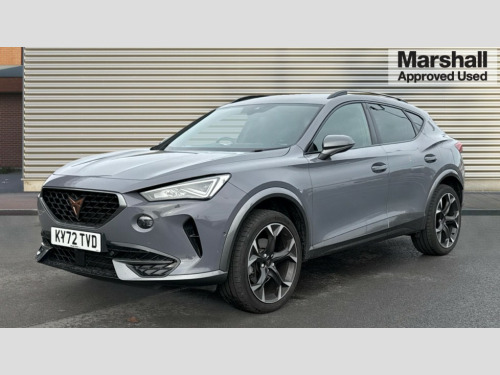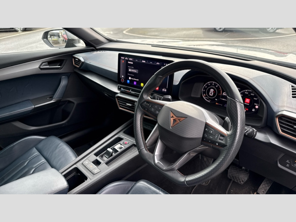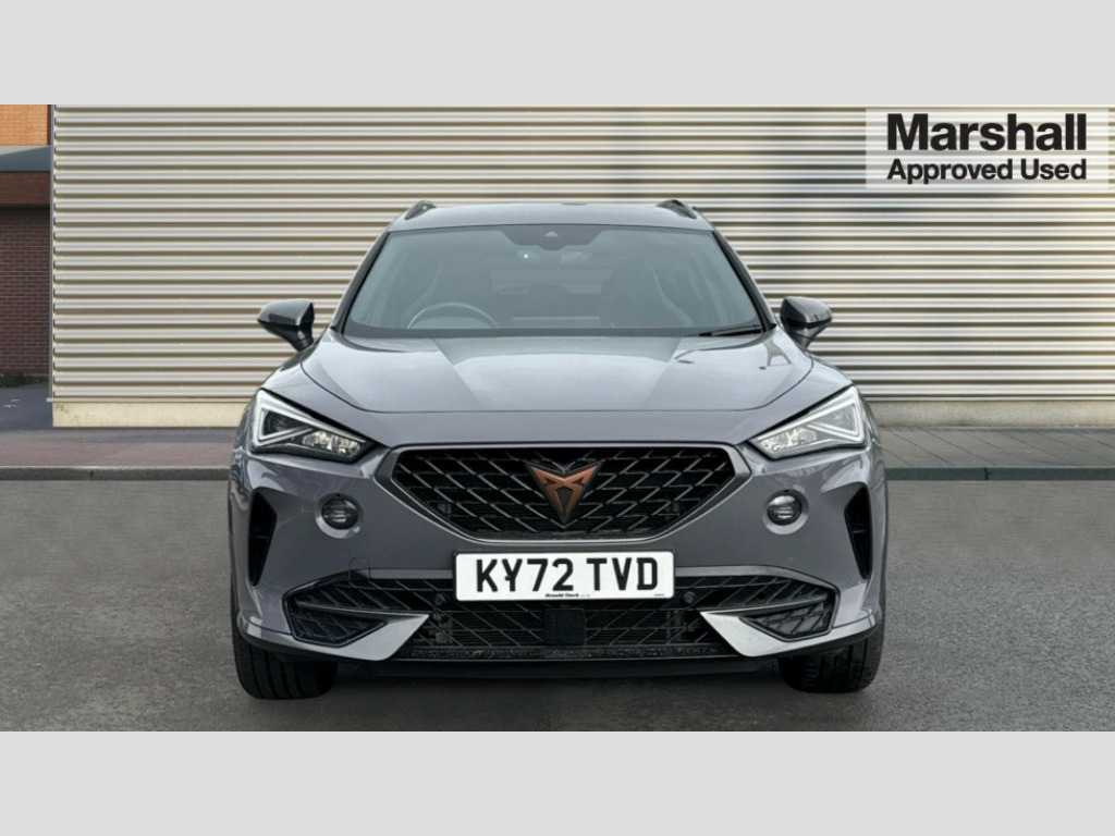 Cupra Formentor 1.5 TSI 150 V2 5dr DSG Digital cockpit and configurable dashboard, Driver alert system, Driving profile selection, E-call, Forward collision warning with automatic braking, Lane assist, Navigation system with 12'' Touchscreen Display, Park assist (inc front/rear parking sensors), PAS, Predictive adaptive cruise control with speed limiter, Rear view camera, RPM, trip computer, outside temp gauge, instrument light brightness, low fuel warning light, lights on reminder, gearshift indicator, Service interval indicator, Start/stop system with regenerative braking, Voice control system, Wireless apple carplay, Wireless phone charger, Electronic locking differential and dynamic traction support, Standard suspension, 2 front and 2 rear USB type C sockets, Auxiliary input socket, DAB radio, Auto dimming rear view mirror, Body colour door handles, Body coloured bumpers, Dark grey wing mirror, Daytime running light with automatic headlight control and coming home feature, Dynamic headlight range control, Electric front/rear windows, Electrically adjustable heated and folding door mirrors with memory function, Front fog lamps with cornering function, Gloss black roof rails and window surrounds, LED Headlights, LED Taillights with dynamic indicator, Rain sensing wipers, Rear diffuser with black simulated exhaust pipes, Rear side wing doors, Rear wash/wipe, Third brake light, Tinted rear windows, Welcome lights, 12v power supply in centre console, 12V socket, 12v socket in loadspace, 2 front and 2 rear reading lights, 230V socket, 3 seat bench in 2nd row, 60/40 split rear bench seat with armrest and mechanical seat release, Black headlining, Dust/pollen filter, Front and rear head restraints, Front centre armrest, Height/reach adjust steering wheel, Illuminated interior front door sills, Illuminated sunvisor with mirror, Isofix, Leather multi function heated steering wheel with gear shift paddles, Luggage tie-down hooks, Single front passenger seat, Three zone climate control with control panel in rear, Variable luggage/load compartment floor, Wraparound lighting, Genuine Nappa leather Pack - Cupra, 3 point seatbelts on all rear seats, ABS, Brake control system - ESC and brake booster, Child proof door locks, Driver and front passenger airbags with front passenger airbag de-activation, Electronic parking brake, Front and rear disc brakes, Front side curtain airbags, Hill hold control, Seat belt reminder for front and rear seats, Tyre pressure monitoring system, Anti theft alarm system, Keyless entry and start system (KESSY), Locking wheel bolts, Copper and aluminium interior detailing, 19" 'Exclusive' machined sport matte black and silver alloy wheels