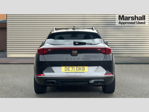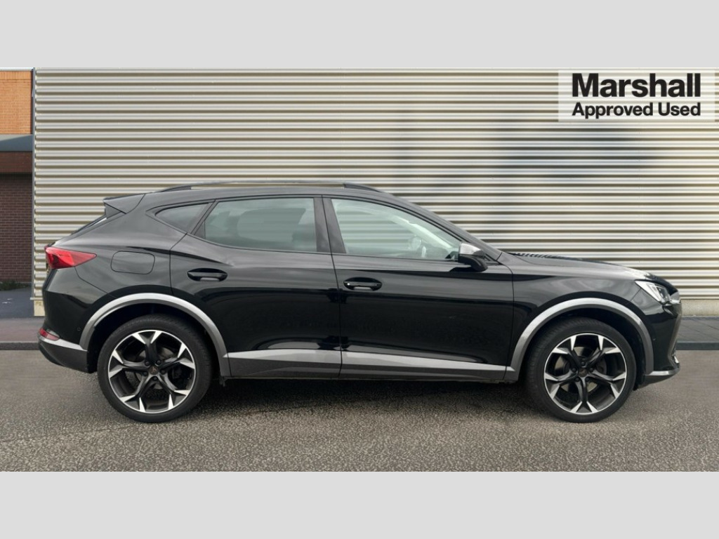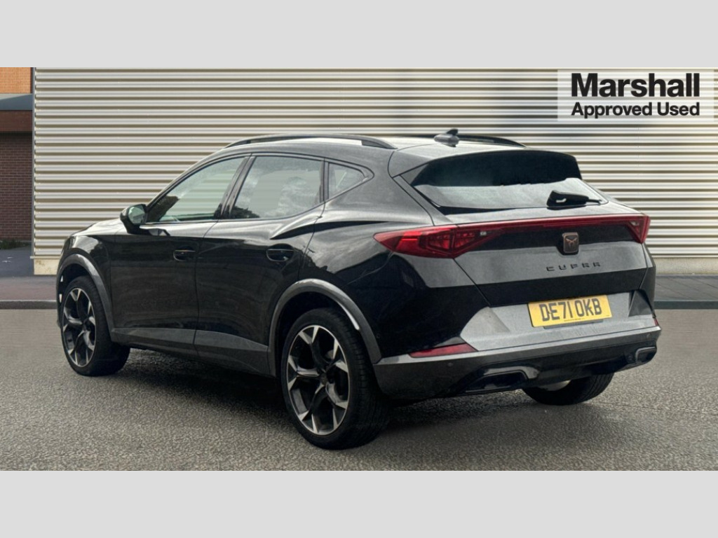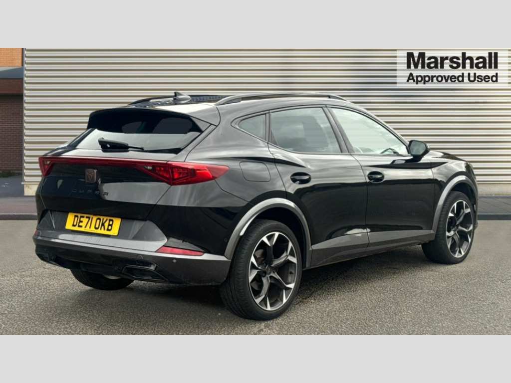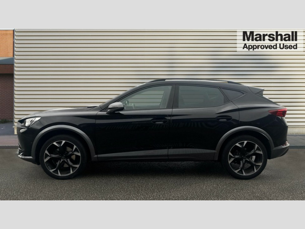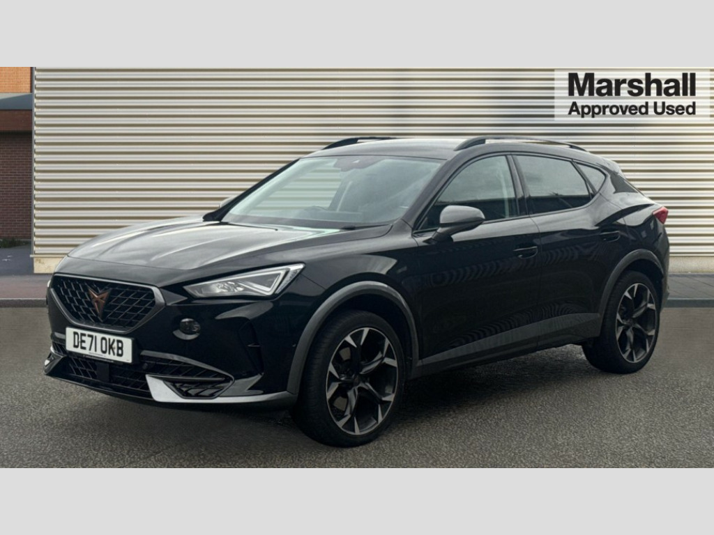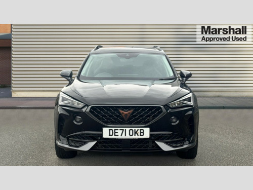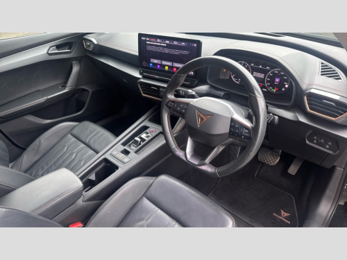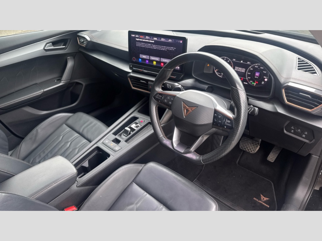Cupra Formentor 1.5 TSI 150 V2 5dr DSG Digital cockpit and configurable dashboard, Driver alert system, Driving profile selection, Forward collision warning with automatic braking, Lane assist, Park assist (inc front/rear parking sensors), PAS, Predictive adaptive cruise control with speed limiter, Rear view camera, RPM, trip computer, outside temp gauge, instrument light brightness, low fuel warning light, lights on reminder, gearshift indicator, Service interval indicator, Start/stop system with regenerative braking, Wireless apple carplay, Wireless phone charger, Electronic locking differential and dynamic traction support, Standard suspension, 2 front and 2 rear USB type C sockets, Auxiliary input socket, DAB radio, Auto dimming rear view mirror, Body colour door handles, Body coloured bumpers, Dark grey wing mirror, Daytime running light with automatic headlight control and coming home feature, Dynamic headlight range control, Electric front/rear windows, Electrically adjustable heated and folding door mirrors with memory function, Front fog lamps with cornering function, Gloss black roof rails and window surrounds, LED Headlights, LED Taillights with dynamic indicator, Rain sensing wipers, Rear diffuser with black simulated exhaust pipes, Rear wash/wipe, Tinted rear windows, Welcome lights, 12v power supply in centre console, 12V socket, 12v socket in loadspace, 2 front and 2 rear reading lights, 230V socket, 60/40 split rear bench seat with armrest and mechanical seat release, Dust/pollen filter, Front and rear head restraints, Front centre armrest, Height/reach adjust steering wheel, Illuminated interior front door sills, Illuminated sunvisor with mirror, Isofix, Leather multi function heated steering wheel with gear shift paddles, Luggage tie-down hooks, Three zone climate control with control panel in rear, Variable luggage/load compartment floor, Wraparound lighting, Genuine Nappa leather Pack - Cupra, Navigation system pack with 10" navigation system - Formentor, 3 point seatbelts on all rear seats, ABS, Brake control system - ESC and brake booster, Child proof door locks, Driver and front passenger airbags with front passenger airbag de-activation, Electronic parking brake, Front and rear disc brakes, Front side curtain airbags, Hill hold control, Seat belt reminder for front and rear seats, Tyre pressure monitoring system, Anti theft alarm system, Keyless entry and start system (KESSY), Locking wheel bolts, Copper and aluminium interior detailing, 19" 'Exclusive' machined sport matte black and silver alloy wheels