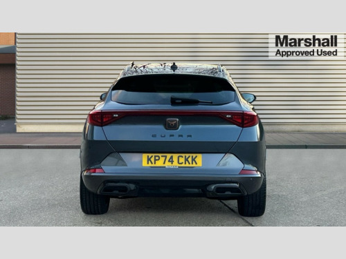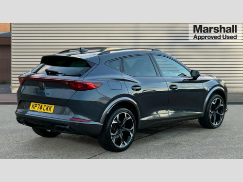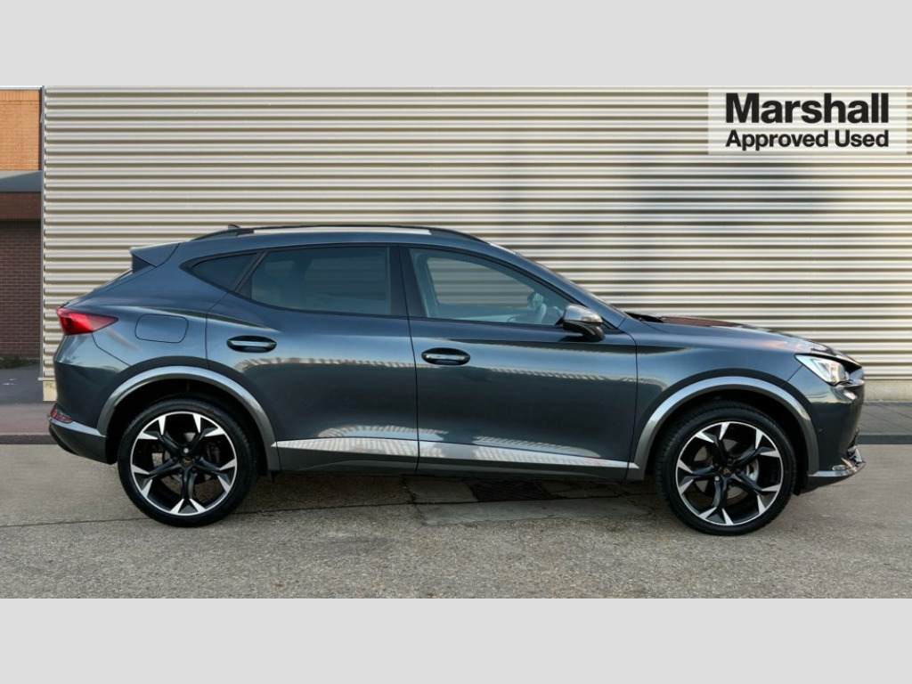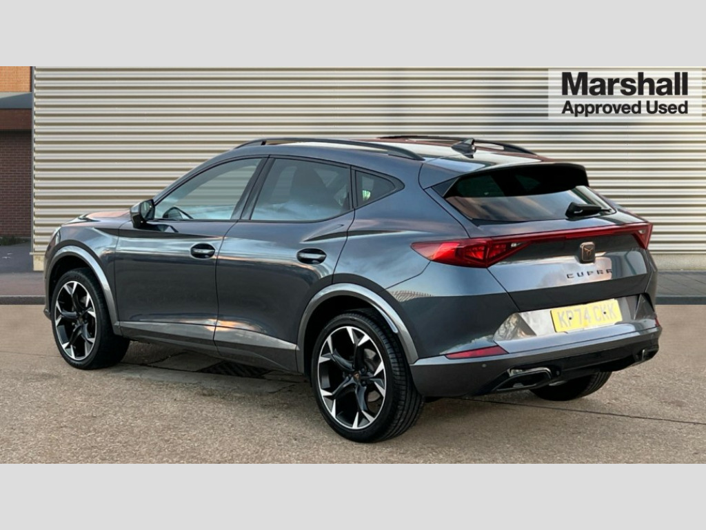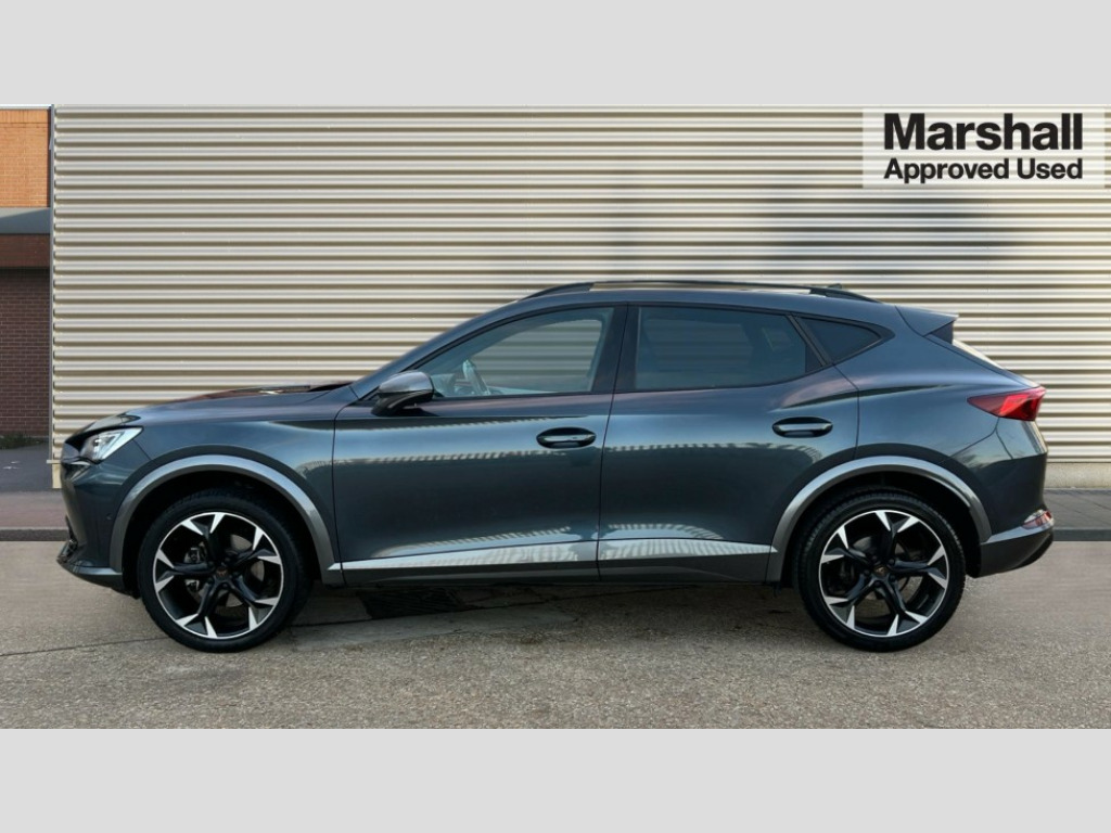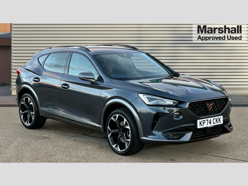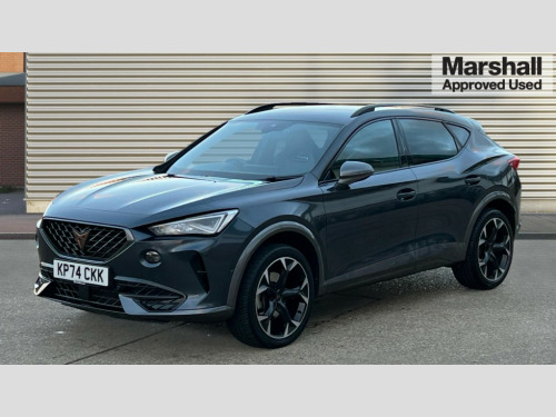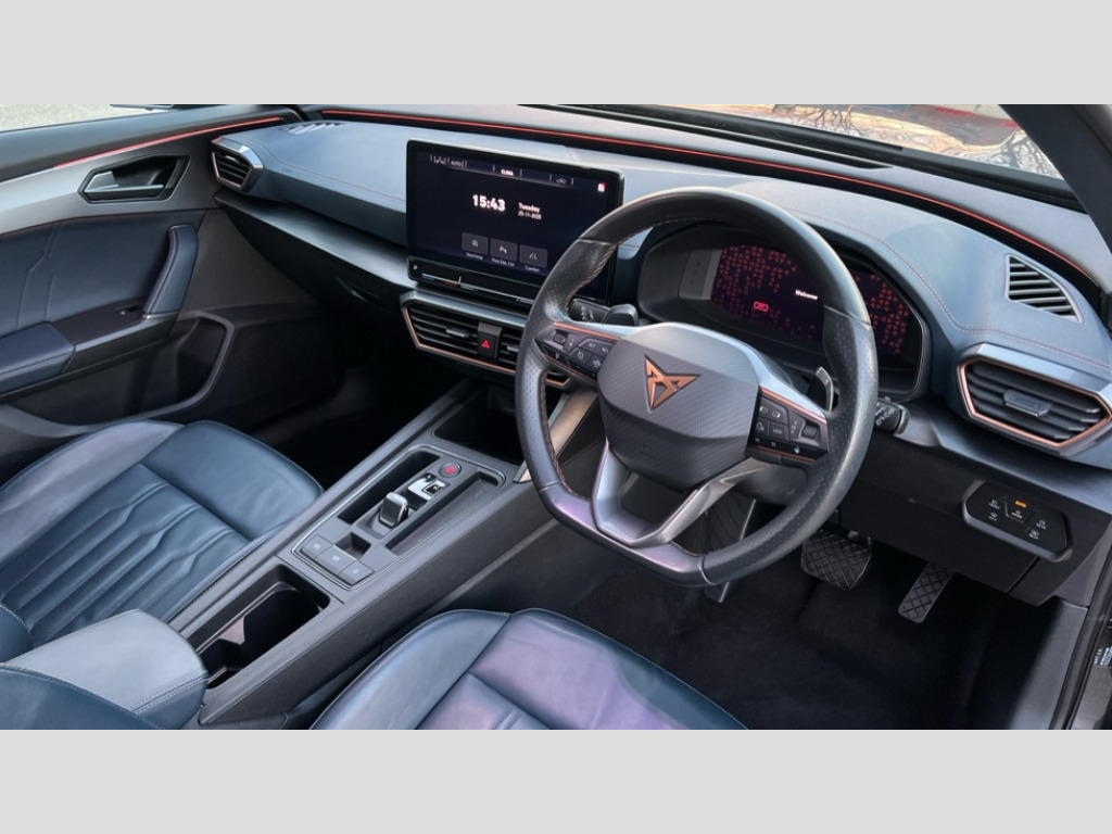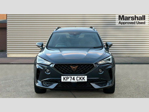 Cupra Formentor 1.5 TSI 150 V2 5dr DSG Digital cockpit and configurable dashboard, Driver alert system, Driving profile selection, Forward collision warning with automatic braking, Lane assist, Navigation system with 12'' Touchscreen Display, Park assist (inc front/rear parking sensors), PAS, Predictive adaptive cruise control with speed limiter, Rear view camera, RPM, trip computer, outside temp gauge, instrument light brightness, low fuel warning light, lights on reminder, gearshift indicator, Service interval indicator, Start/stop system with regenerative braking, Voice control system, Wired Android Auto, Wireless apple carplay, Wireless phone charger, Electronic locking differential and dynamic traction support, Standard suspension, 2 front and 2 rear USB type C sockets, Auxiliary input socket, DAB radio, Auto dimming rear view mirror, Body colour door handles, Body coloured bumpers, Dark grey wing mirror, Daytime running light with automatic headlight control and coming home feature, Dynamic headlight range control, Electric front/rear windows, Electrically adjustable heated and folding door mirrors with memory function, Front fog lamps with cornering function, Gloss black roof rails and window surrounds, LED Headlights, LED Taillights with dynamic indicator, Rain sensing wipers, Rear diffuser with black simulated exhaust pipes, Rear side wing doors, Rear wash/wipe, Third brake light, Tinted rear windows, Welcome lights, 12v power supply in centre console, 12V socket, 12v socket in loadspace, 2 front and 2 rear reading lights, 230V socket, 3 seat bench in 2nd row, 60/40 split rear bench seat with armrest and mechanical seat release, Black headlining, Dust/pollen filter, Front and rear head restraints, Front centre armrest, Height/reach adjust steering wheel, Illuminated interior front door sills, Illuminated sunvisor with mirror, Isofix, Leather multi function heated steering wheel with gear shift paddles, Luggage tie-down hooks, Single front passenger seat, Three zone climate control with control panel in rear, Variable luggage/load compartment floor, Wraparound lighting, Genuine Nappa leather Pack - Cupra, 3 point seatbelts on all rear seats, ABS, Brake control system - ESC and brake booster, Child proof door locks, Driver and front passenger airbags with front passenger airbag de-activation, Electronic parking brake, Front and rear disc brakes, Front side curtain airbags, Hill hold control, Public e-call, Seat belt reminder for front and rear seats, Tyre pressure monitoring system, Anti theft alarm system, Keyless entry and start system (KESSY), Locking wheel bolts, Copper and aluminium interior detailing, 19" 'Exclusive' machined sport matte black and silver alloy wheels