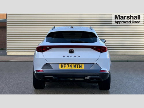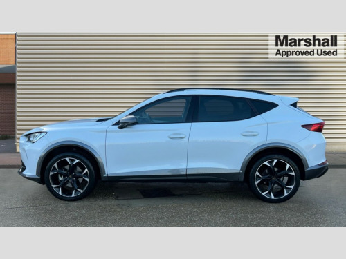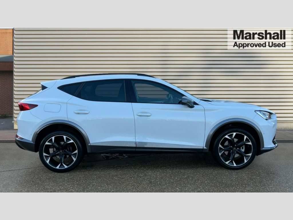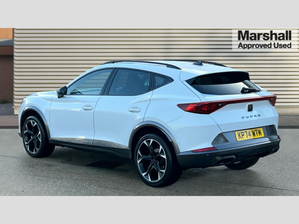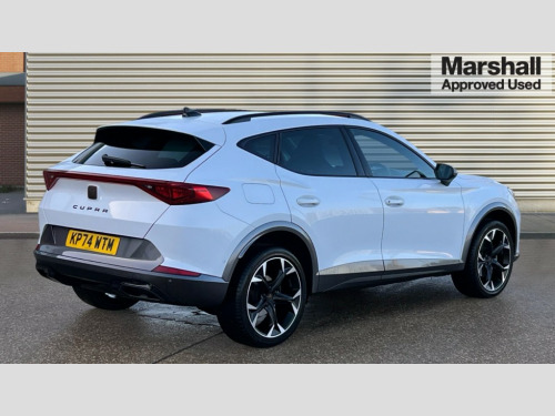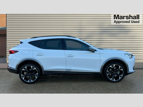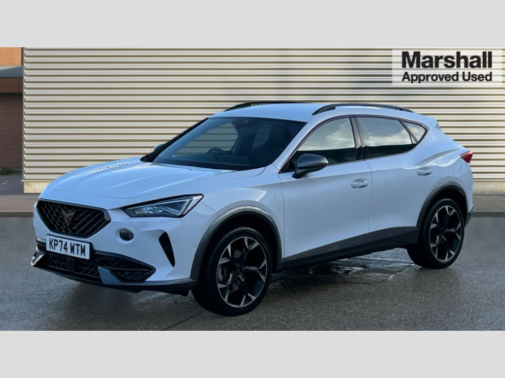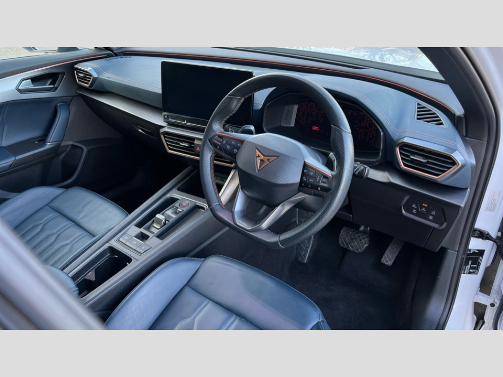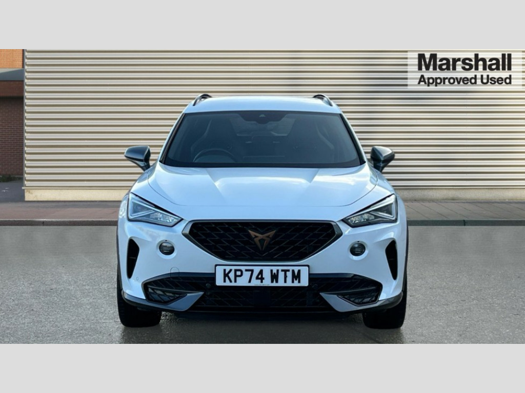 Cupra Formentor 1.5 TSI 150 V2 5dr DSG Digital cockpit and configurable dashboard, Driver alert system, Driving profile selection, Forward collision warning with automatic braking, Lane assist, Navigation system with 12'' Touchscreen Display, Park assist (inc front/rear parking sensors), PAS, Predictive adaptive cruise control with speed limiter, Rear view camera, RPM, trip computer, outside temp gauge, instrument light brightness, low fuel warning light, lights on reminder, gearshift indicator, Service interval indicator, Start/stop system with regenerative braking, Voice control system, Wired Android Auto, Wireless apple carplay, Wireless phone charger, Electronic locking differential and dynamic traction support, Standard suspension, 2 front and 2 rear USB type C sockets, Auxiliary input socket, DAB radio, Auto dimming rear view mirror, Body colour door handles, Body coloured bumpers, Dark grey wing mirror, Daytime running light with automatic headlight control and coming home feature, Dynamic headlight range control, Electric front/rear windows, Electrically adjustable heated and folding door mirrors with memory function, Front fog lamps with cornering function, Gloss black roof rails and window surrounds, LED Headlights, LED Taillights with dynamic indicator, Rain sensing wipers, Rear diffuser with black simulated exhaust pipes, Rear side wing doors, Rear wash/wipe, Third brake light, Tinted rear windows, Welcome lights, 12v power supply in centre console, 12V socket, 12v socket in loadspace, 2 front and 2 rear reading lights, 230V socket, 3 seat bench in 2nd row, 60/40 split rear bench seat with armrest and mechanical seat release, Black headlining, Dust/pollen filter, Front and rear head restraints, Front centre armrest, Height/reach adjust steering wheel, Illuminated interior front door sills, Illuminated sunvisor with mirror, Isofix, Leather multi function heated steering wheel with gear shift paddles, Luggage tie-down hooks, Single front passenger seat, Three zone climate control with control panel in rear, Variable luggage/load compartment floor, Wraparound lighting, Genuine Nappa leather Pack - Cupra, 3 point seatbelts on all rear seats, ABS, Brake control system - ESC and brake booster, Child proof door locks, Driver and front passenger airbags with front passenger airbag de-activation, Electronic parking brake, Front and rear disc brakes, Front side curtain airbags, Hill hold control, Public e-call, Seat belt reminder for front and rear seats, Tyre pressure monitoring system, Anti theft alarm system, Keyless entry and start system (KESSY), Locking wheel bolts, Copper and aluminium interior detailing, 19" 'Exclusive' machined sport matte black and silver alloy wheels
