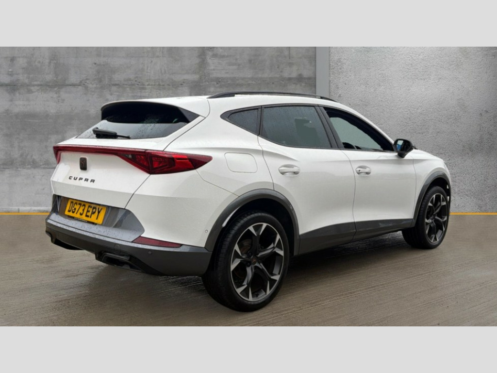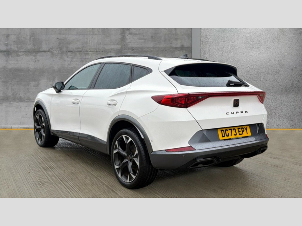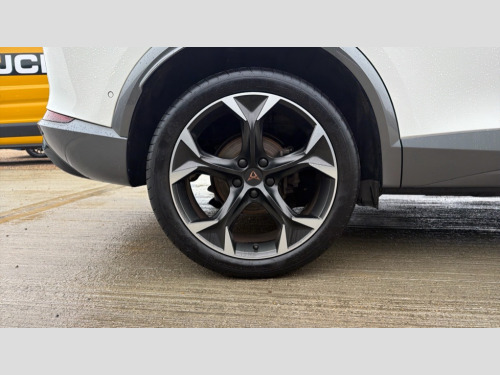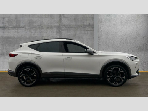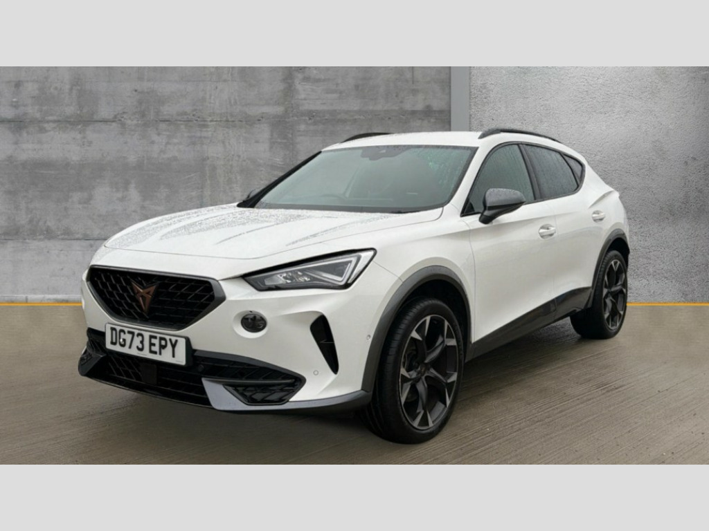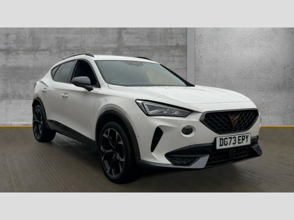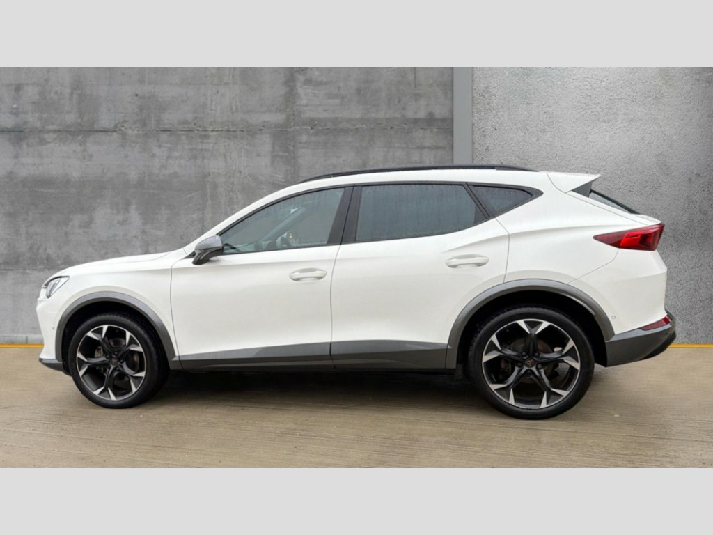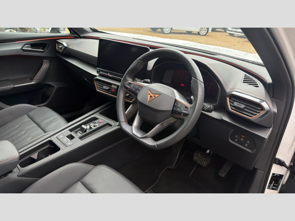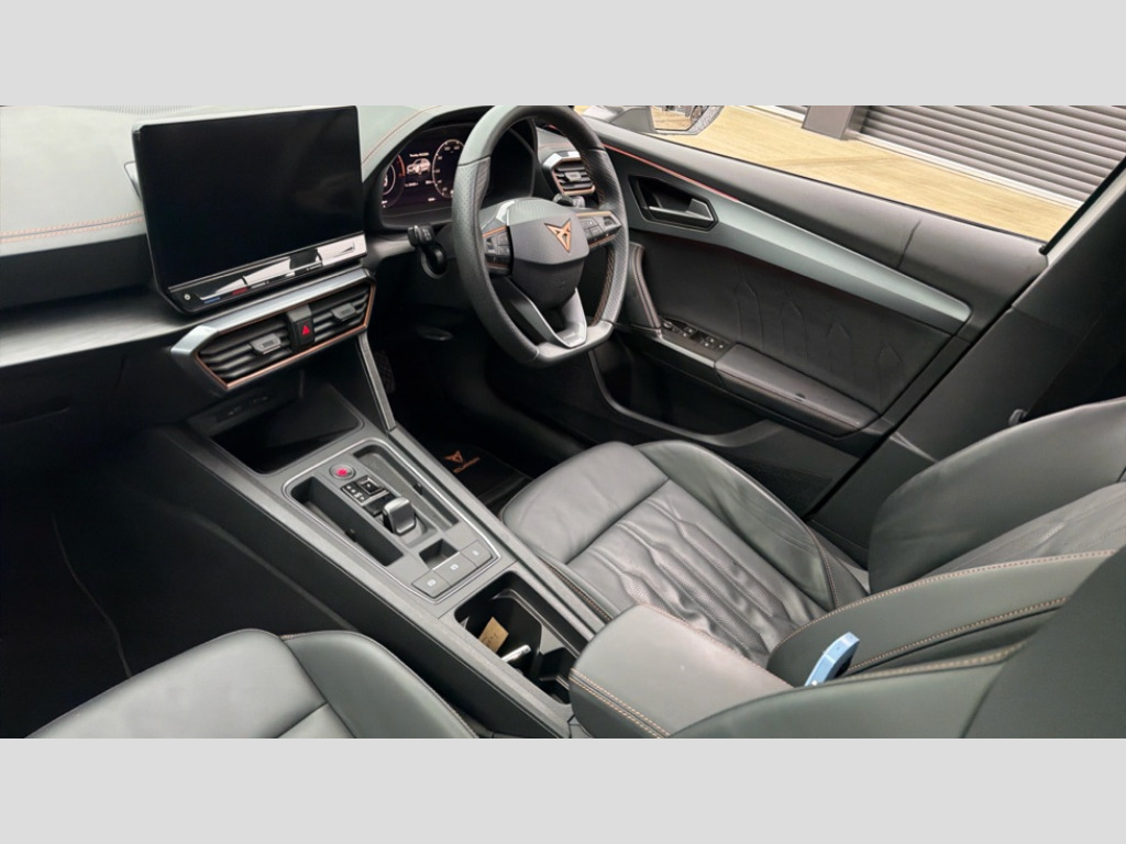 Cupra Formentor 1.5 TSI 150 V2 5dr DSG Digital cockpit and configurable dashboard, Driver alert system, Driving profile selection, Forward collision warning with automatic braking, Lane assist, Navigation system with 12'' Touchscreen Display, Park assist (inc front/rear parking sensors), PAS, Predictive adaptive cruise control with speed limiter, Rear view camera, RPM, trip computer, outside temp gauge, instrument light brightness, low fuel warning light, lights on reminder, gearshift indicator, Service interval indicator, Start/stop system with regenerative braking, Voice control system, Wired Android Auto, Wireless apple carplay, Wireless phone charger, Electronic locking differential and dynamic traction support, Standard suspension, 2 front and 2 rear USB type C sockets, Auxiliary input socket, DAB radio, Auto dimming rear view mirror, Body colour door handles, Body coloured bumpers, Dark grey wing mirror, Daytime running light with automatic headlight control and coming home feature, Dynamic headlight range control, Electric front/rear windows, Electrically adjustable heated and folding door mirrors with memory function, Front fog lamps with cornering function, Gloss black roof rails and window surrounds, LED Headlights, LED Taillights with dynamic indicator, Rain sensing wipers, Rear diffuser with black simulated exhaust pipes, Rear side wing doors, Rear wash/wipe, Third brake light, Tinted rear windows, Welcome lights, 12v power supply in centre console, 12V socket, 12v socket in loadspace, 2 front and 2 rear reading lights, 230V socket, 3 seat bench in 2nd row, 60/40 split rear bench seat with armrest and mechanical seat release, Black headlining, Dust/pollen filter, Front and rear head restraints, Front centre armrest, Height/reach adjust steering wheel, Illuminated interior front door sills, Illuminated sunvisor with mirror, Isofix, Leather multi function heated steering wheel with gear shift paddles, Luggage tie-down hooks, Single front passenger seat, Three zone climate control with control panel in rear, Variable luggage/load compartment floor, Wraparound lighting, Genuine Nappa leather Pack - Cupra, 3 point seatbelts on all rear seats, ABS, Brake control system - ESC and brake booster, Child proof door locks, Driver and front passenger airbags with front passenger airbag de-activation, Electronic parking brake, Front and rear disc brakes, Front side curtain airbags, Hill hold control, Public e-call, Seat belt reminder for front and rear seats, Tyre pressure monitoring system, Anti theft alarm system, Keyless entry and start system (KESSY), Locking wheel bolts, Copper and aluminium interior detailing, 19" 'Exclusive' machined sport matte black and silver alloy wheels
