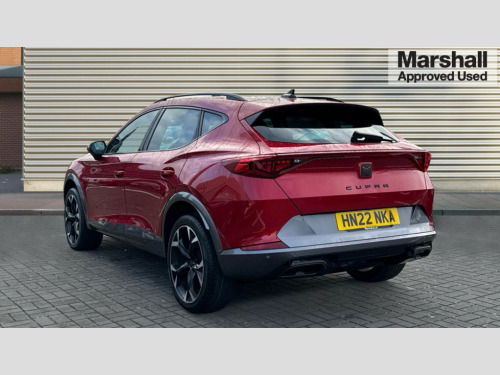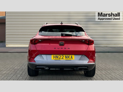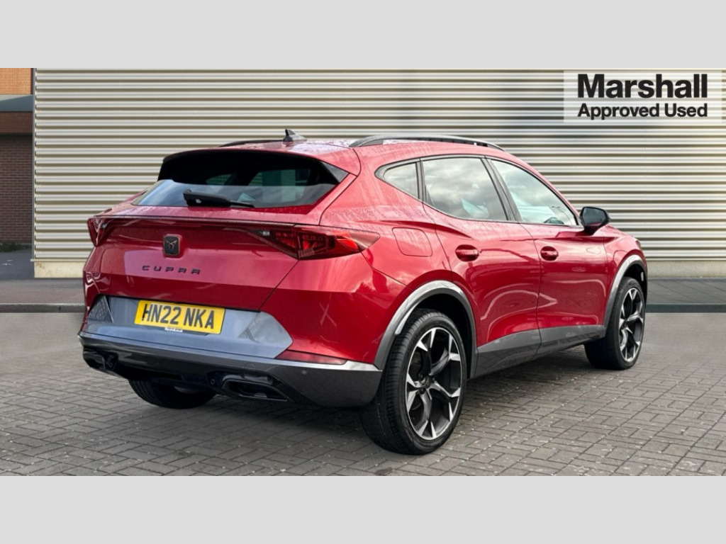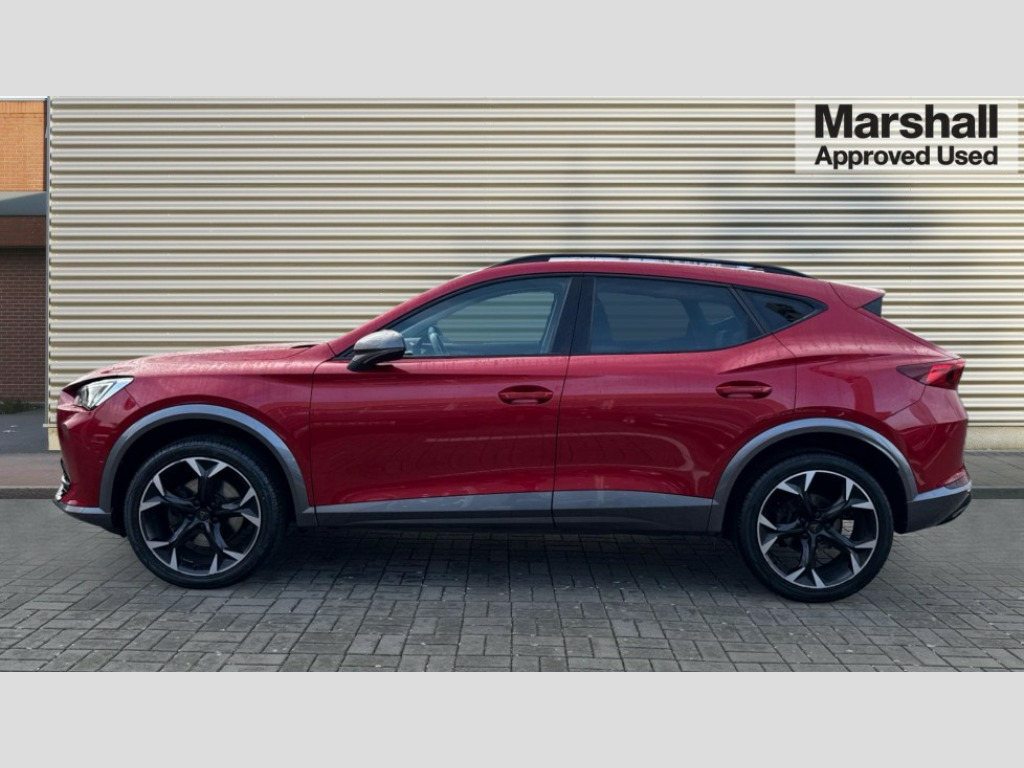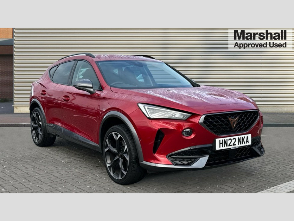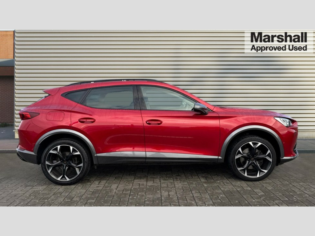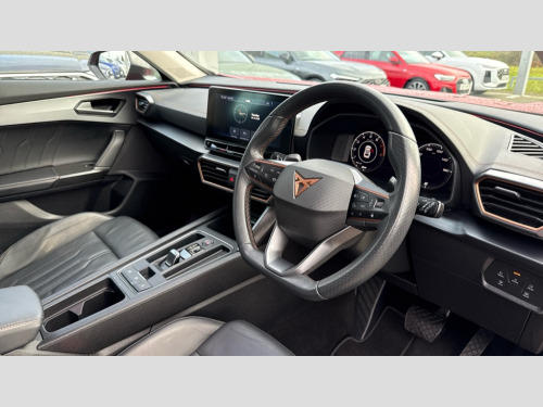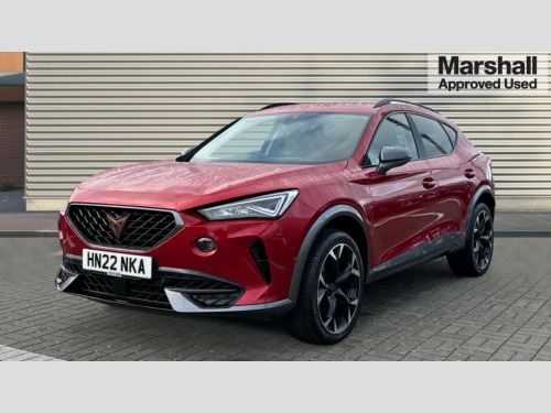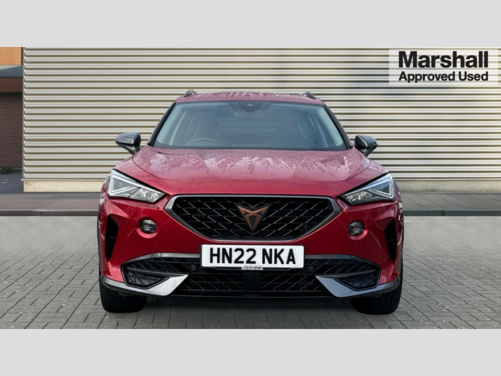 Cupra Formentor 1.5 TSI 150 V2 5dr DSG Digital cockpit and configurable dashboard, Driver alert system, Driving profile selection, E-call, Forward collision warning with automatic braking, Lane assist, Park assist (inc front/rear parking sensors), PAS, Predictive adaptive cruise control with speed limiter, Rear view camera, RPM, trip computer, outside temp gauge, instrument light brightness, low fuel warning light, lights on reminder, gearshift indicator, Service interval indicator, Start/stop system with regenerative braking, Wireless apple carplay, Wireless phone charger, Electronic locking differential and dynamic traction support, Standard suspension, 2 front and 2 rear USB type C sockets, Auxiliary input socket, DAB radio, Auto dimming rear view mirror, Body colour door handles, Body coloured bumpers, Dark grey wing mirror, Daytime running light with automatic headlight control and coming home feature, Dynamic headlight range control, Electric front/rear windows, Electrically adjustable heated and folding door mirrors with memory function, Front fog lamps with cornering function, Gloss black roof rails and window surrounds, LED Headlights, LED Taillights with dynamic indicator, Rain sensing wipers, Rear diffuser with black simulated exhaust pipes, Rear side wing doors, Rear wash/wipe, Third brake light, Tinted rear windows, Welcome lights, 12v power supply in centre console, 12V socket, 12v socket in loadspace, 2 front and 2 rear reading lights, 230V socket, 3 seat bench in 2nd row, 60/40 split rear bench seat with armrest and mechanical seat release, Dust/pollen filter, Front and rear head restraints, Front centre armrest, Height/reach adjust steering wheel, Illuminated interior front door sills, Illuminated sunvisor with mirror, Isofix, Leather multi function heated steering wheel with gear shift paddles, Luggage tie-down hooks, Single front passenger seat, Three zone climate control with control panel in rear, Variable luggage/load compartment floor, Wraparound lighting, Genuine Nappa leather Pack - Cupra, Navigation system pack with 10" navigation system - Formentor, 3 point seatbelts on all rear seats, ABS, Brake control system - ESC and brake booster, Child proof door locks, Driver and front passenger airbags with front passenger airbag de-activation, Electronic parking brake, Front and rear disc brakes, Front side curtain airbags, Hill hold control, Seat belt reminder for front and rear seats, Tyre pressure monitoring system, Anti theft alarm system, Keyless entry and start system (KESSY), Locking wheel bolts, Copper and aluminium interior detailing, 19" 'Exclusive' machined sport matte black and silver alloy wheels