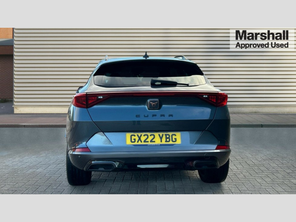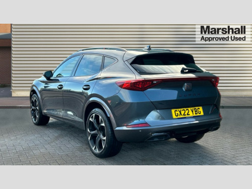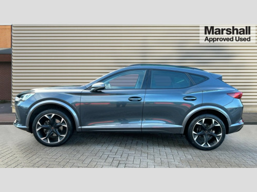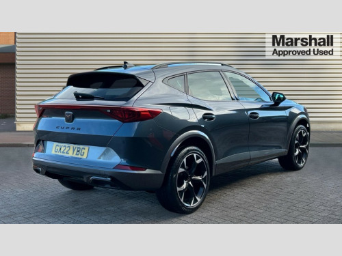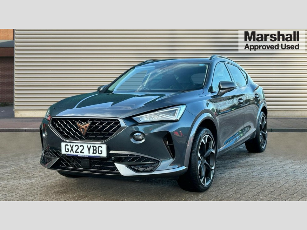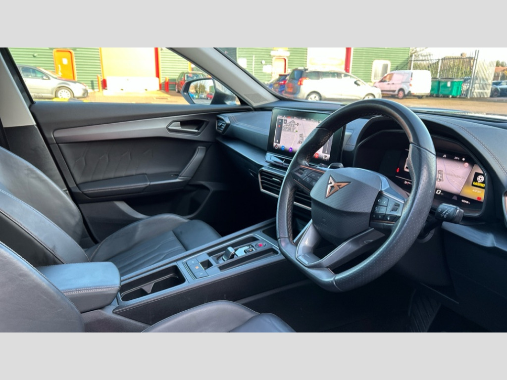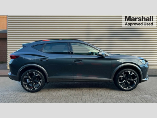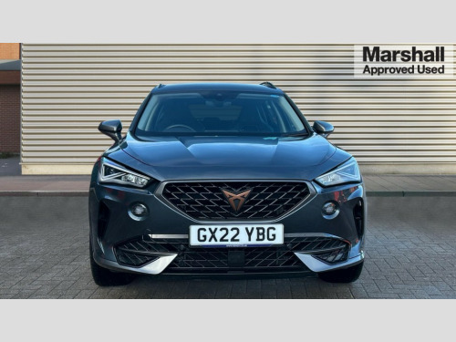 Cupra Formentor 1.5 TSI 150 V2 5dr DSG Digital cockpit and configurable dashboard, Driver alert system, Driving profile selection, E-call, Forward collision warning with automatic braking, Lane assist, Park assist (inc front/rear parking sensors), PAS, Predictive adaptive cruise control with speed limiter, Rear view camera, RPM, trip computer, outside temp gauge, instrument light brightness, low fuel warning light, lights on reminder, gearshift indicator, Service interval indicator, Start/stop system with regenerative braking, Wireless apple carplay, Wireless phone charger, Electronic locking differential and dynamic traction support, Standard suspension, 2 front and 2 rear USB type C sockets, Auxiliary input socket, DAB radio, Auto dimming rear view mirror, Body colour door handles, Body coloured bumpers, Dark grey wing mirror, Daytime running light with automatic headlight control and coming home feature, Dynamic headlight range control, Electric front/rear windows, Electrically adjustable heated and folding door mirrors with memory function, Front fog lamps with cornering function, Gloss black roof rails and window surrounds, LED Headlights, LED Taillights with dynamic indicator, Rain sensing wipers, Rear diffuser with black simulated exhaust pipes, Rear side wing doors, Rear wash/wipe, Third brake light, Tinted rear windows, Welcome lights, 12v power supply in centre console, 12V socket, 12v socket in loadspace, 2 front and 2 rear reading lights, 230V socket, 3 seat bench in 2nd row, 60/40 split rear bench seat with armrest and mechanical seat release, Dust/pollen filter, Front and rear head restraints, Front centre armrest, Height/reach adjust steering wheel, Illuminated interior front door sills, Illuminated sunvisor with mirror, Isofix, Leather multi function heated steering wheel with gear shift paddles, Luggage tie-down hooks, Single front passenger seat, Three zone climate control with control panel in rear, Variable luggage/load compartment floor, Wraparound lighting, Genuine Nappa leather Pack - Cupra, Navigation system pack with 10" navigation system - Formentor, 3 point seatbelts on all rear seats, ABS, Brake control system - ESC and brake booster, Child proof door locks, Driver and front passenger airbags with front passenger airbag de-activation, Electronic parking brake, Front and rear disc brakes, Front side curtain airbags, Hill hold control, Seat belt reminder for front and rear seats, Tyre pressure monitoring system, Anti theft alarm system, Keyless entry and start system (KESSY), Locking wheel bolts, Copper and aluminium interior detailing, 19" 'Exclusive' machined sport matte black and silver alloy wheels